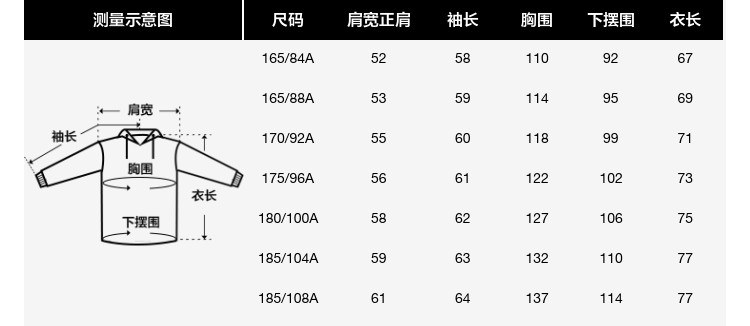 Größe 165/84A(XS),165/88A(S),170/92A(M),175/96A(L),180/100A (XL),185/104A (XXL),185/108A (XXXL)