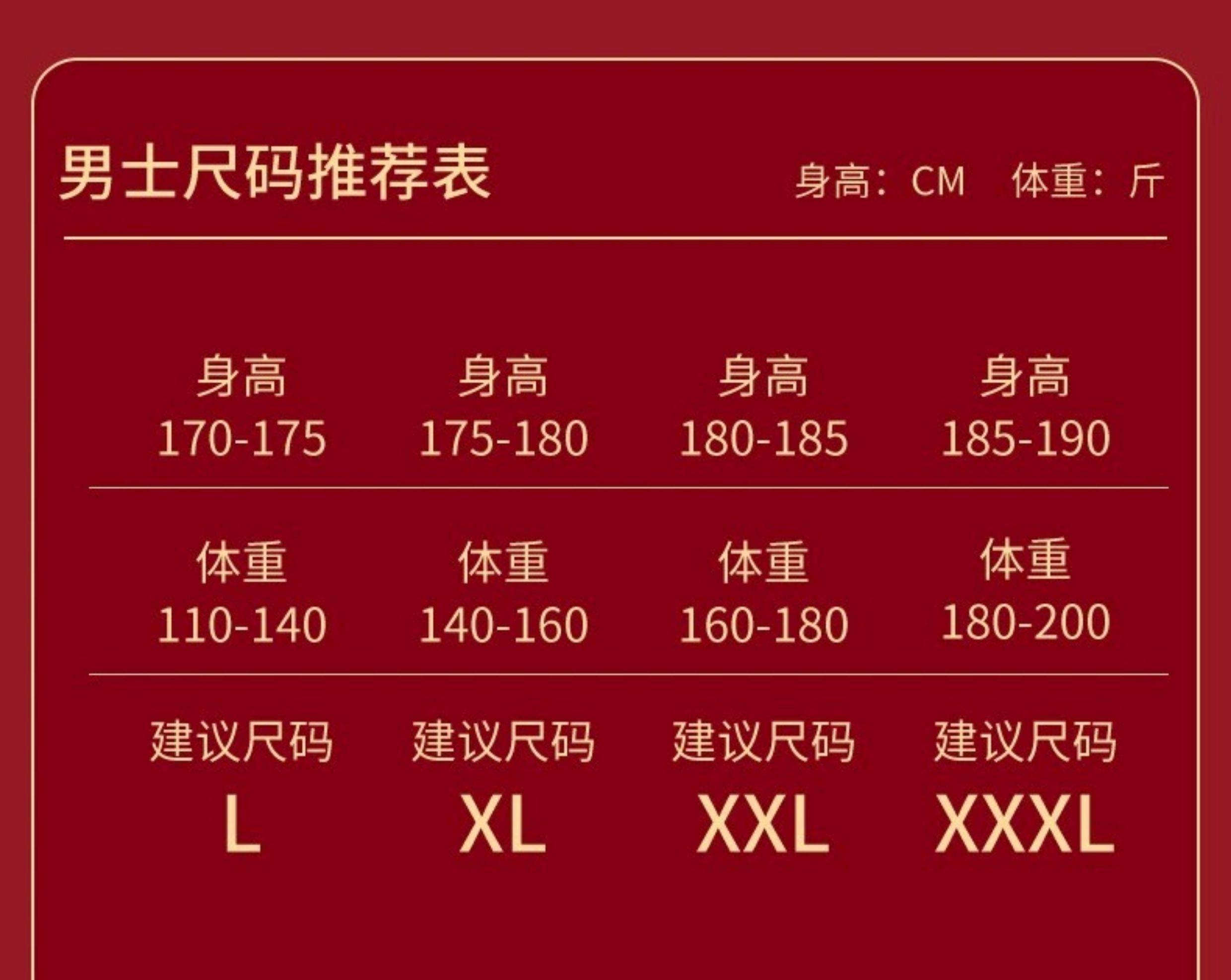 China (cm) 165 / 88-90 170 / 96-98 175 / 108-110 180 / 118-122 185 / 126-130