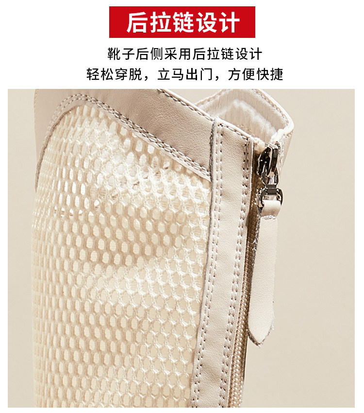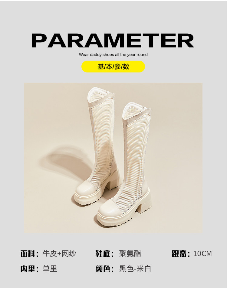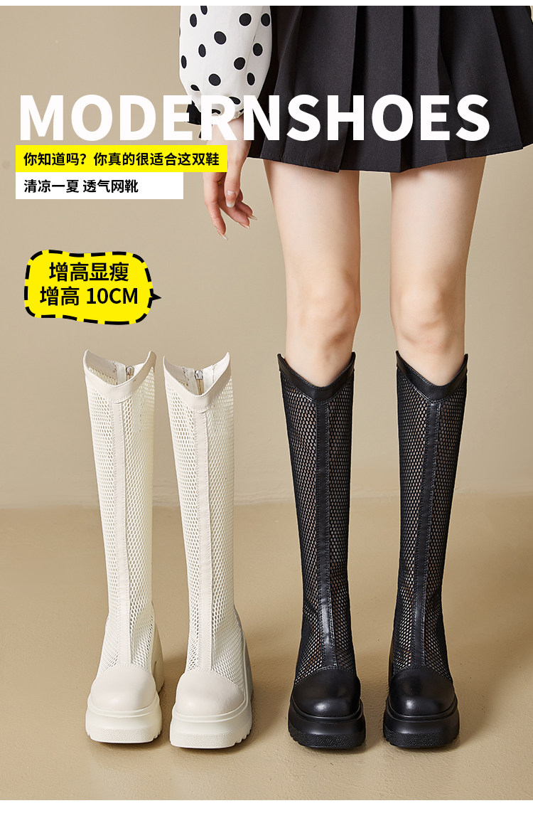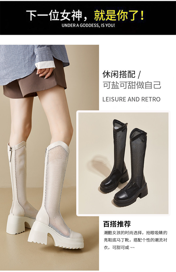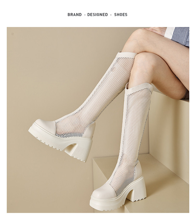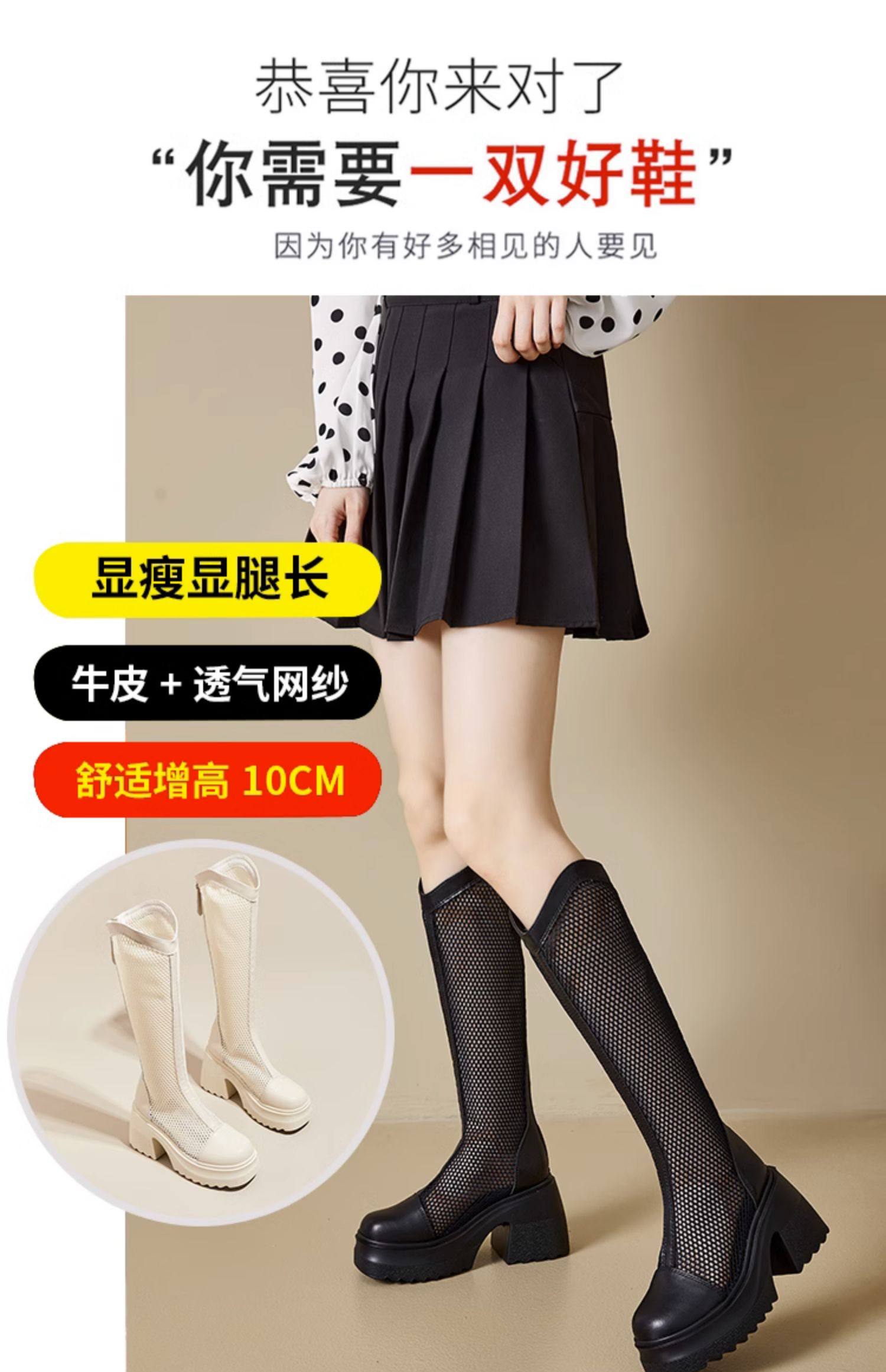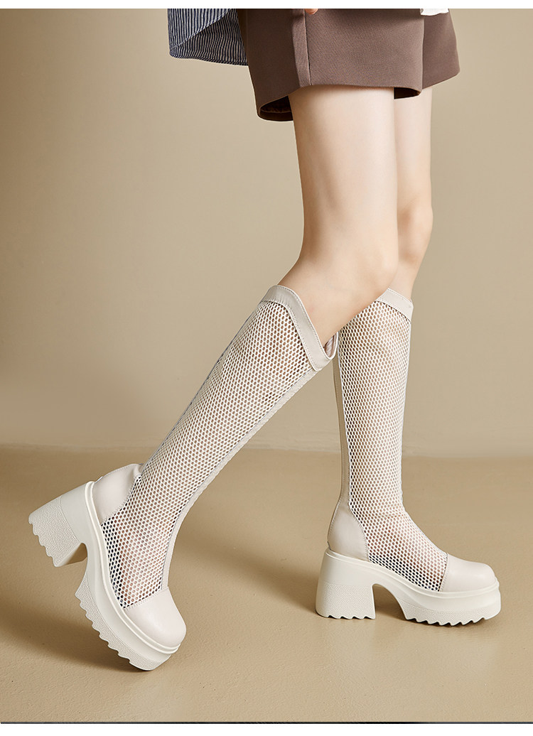Genuine Leather Long Boots for Women 2025 Summer Thin Mesh Hollow Breathable Long Boots Single Boots for Petite Women with Thick High Heels and Cool Boots