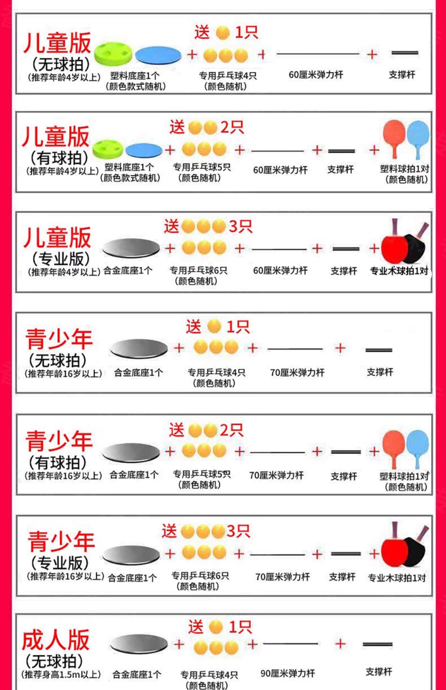 Color Classification [Youth Style]Stainless Steel Base|Special 4 Balls|Adjustable Height 70-90cm,[Youth Style]Stainless Steel Base|Special 5 Balls|Plastic Racket|Adjustable Height 75-90cm,[Youth Style]Stainless Steel Base|Special 6 Balls|Wooden Racket|Adjustable Height 70-90cm,[Children's Model]Stainless Steel Base|Special 6 Balls|Wooden Racket|Adjustable Height 60-75cm,[Adult Style]Stainless Steel Base|Special 4 Balls|Adjustable Height 90-105cm,[Adult Style]Stainless Steel Base|Special 6 Balls|Wooden Racket|Adjustable Height 90-105cm,[Family Style]Stainless Steel Base|Special 4 Balls|3 Elastic Rods|Adjustable Height,[Family Style]Stainless Steel Base|Professional 6 Balls|Wooden Racket|3 Elastic Rods|Adjustable Height,[Children's Model]Plastic Base|Special 4 Balls|Adjustable Height 60-75cm,[Children's Model]Plastic Base | Special 4 Balls | Plastic Racket | Adjustable Height 60-75cm,Thickened Base[Stainless Steel Children's Model-Gold]2 Poles and 5 Balls + Special Wooden Racket + Weight Block, Adjustable Height,Thickened Base[Stainless Steel Children's Model-Silver]2 Poles and 5 Balls + Special Wooden Racket + Weight Block, Adjustable Height,Thickened Base[Stainless Steel Adult Model-Gold]3 Rods, 6 Balls + Special Wooden Racket + Weight Block, Adjustable Height,Thickened Base[Stainless Steel Adult Model-Silver]3 Rods, 6 Balls + Special Wooden Racket + Weight Block, Adjustable Height,Thickened Base[Stainless Steel Family Model-Gold]4 Rods, 6 Balls + Special Wooden Racket + Weight Block, Adjustable Height,Thickened Base[Stainless Steel Family Model-Silver]4 Rods, 6 Balls + Special Wooden Racket + Weight Block, Adjustable Height,[Training Grade Table Tennis]15 White Balls + 15 Yellow Balls