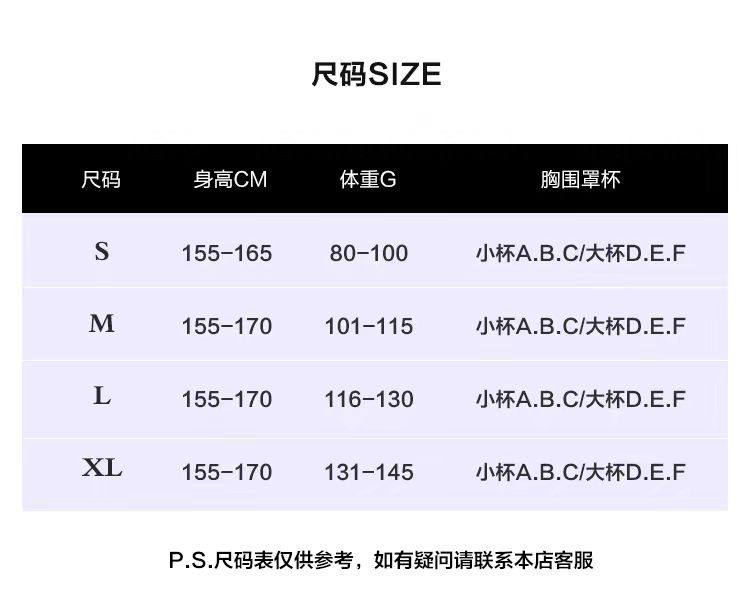 Size S (80— 50kg),M (101— 57.5kg),L (116— 65kg),XL (131— 72.5kg)