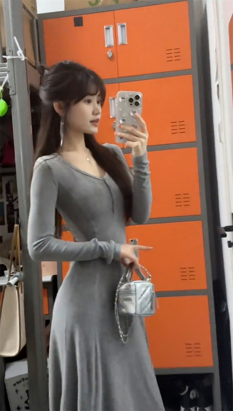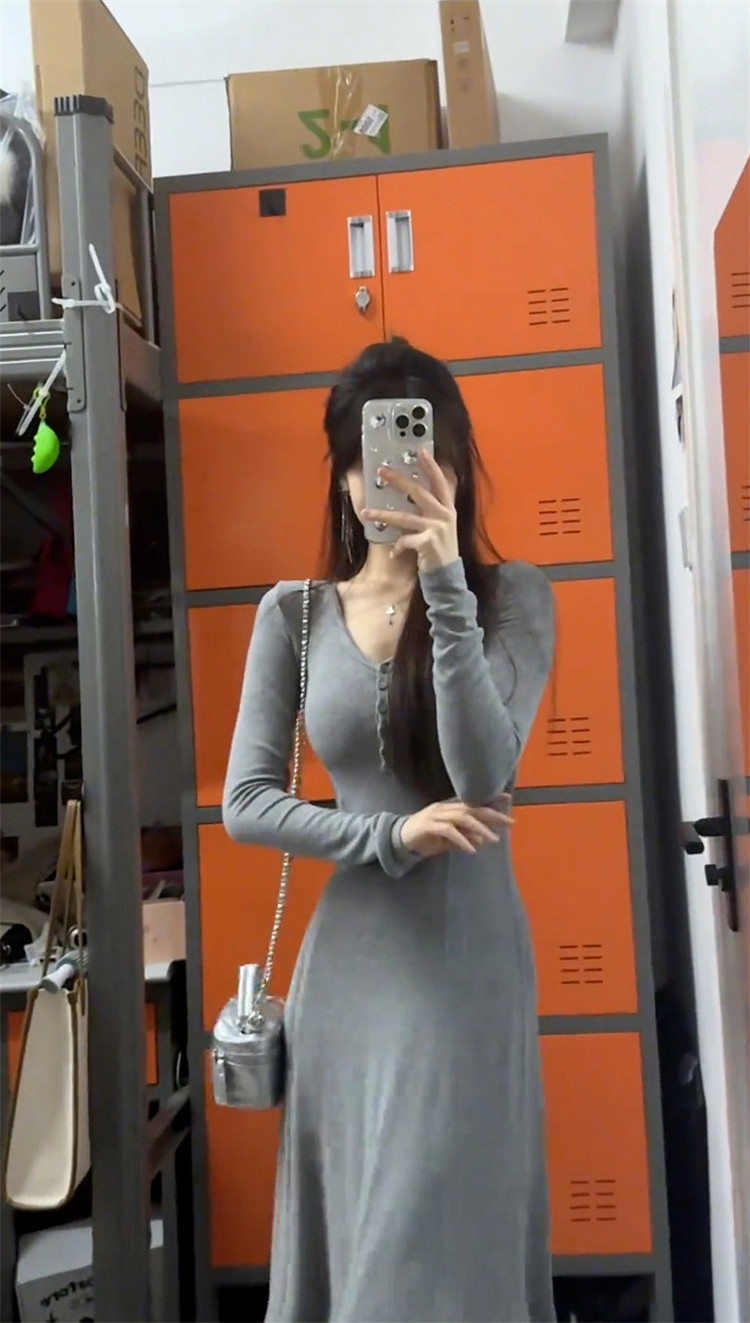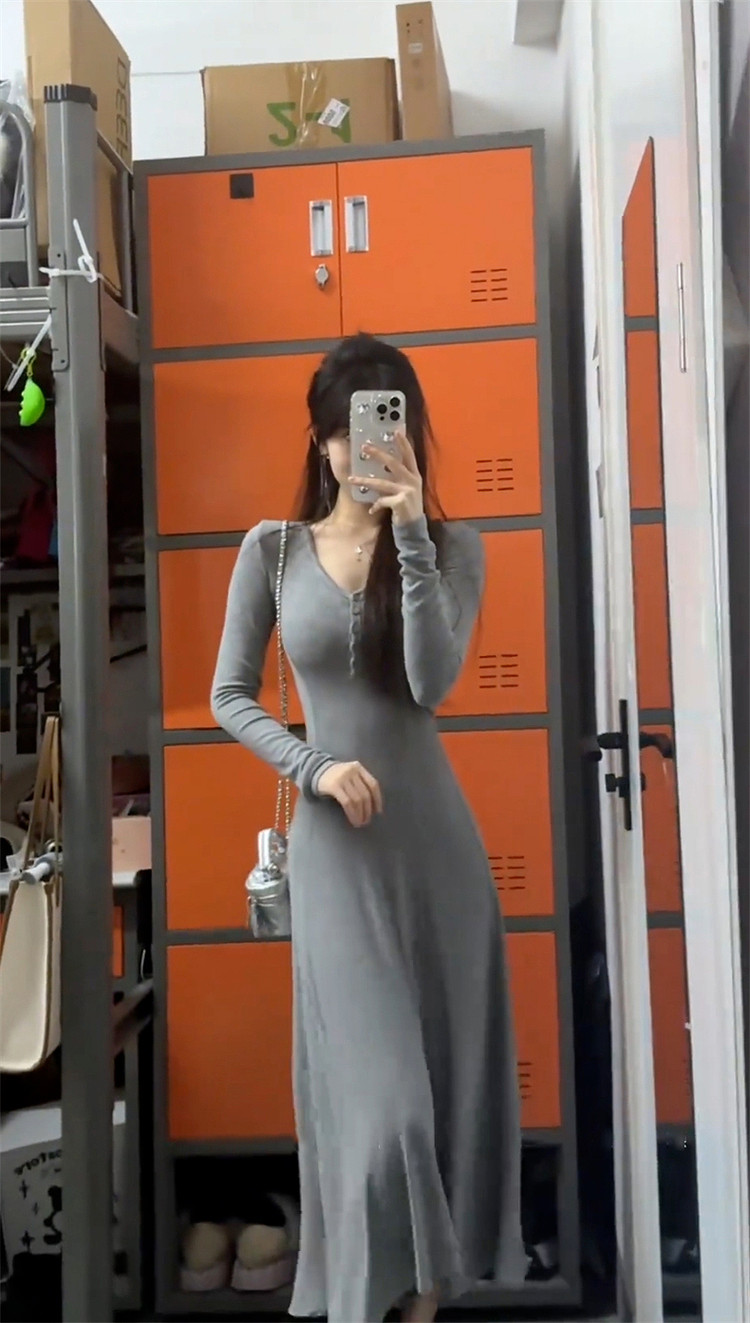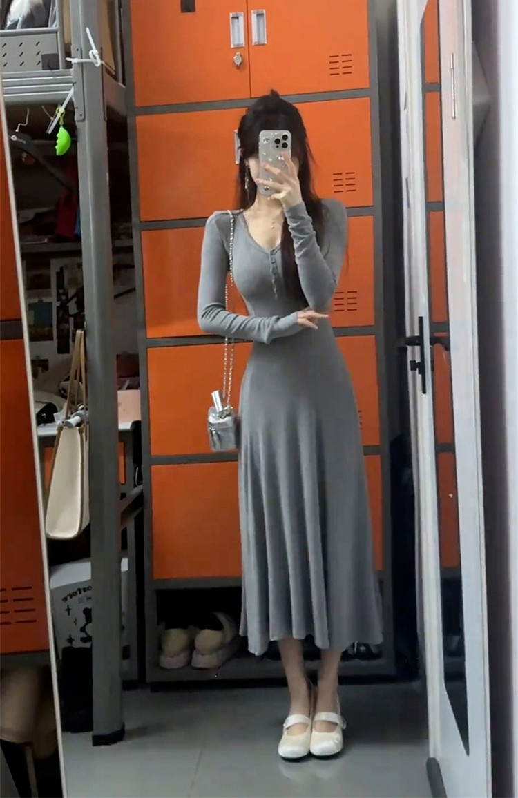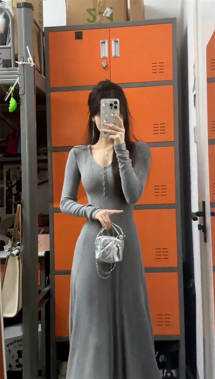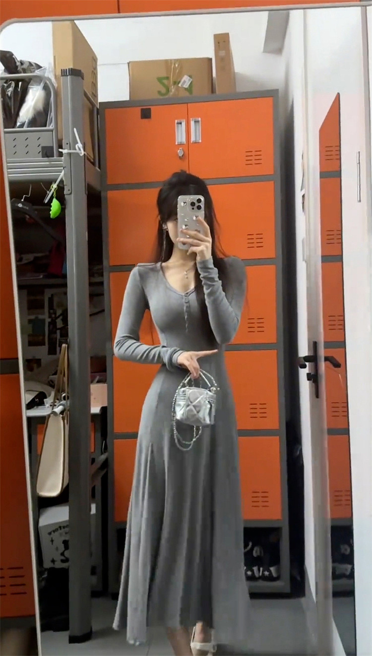 Gray knitted dress for spring and autumn clothes for women 2025 new style for women with high-end slim fit and slim waist long skirt