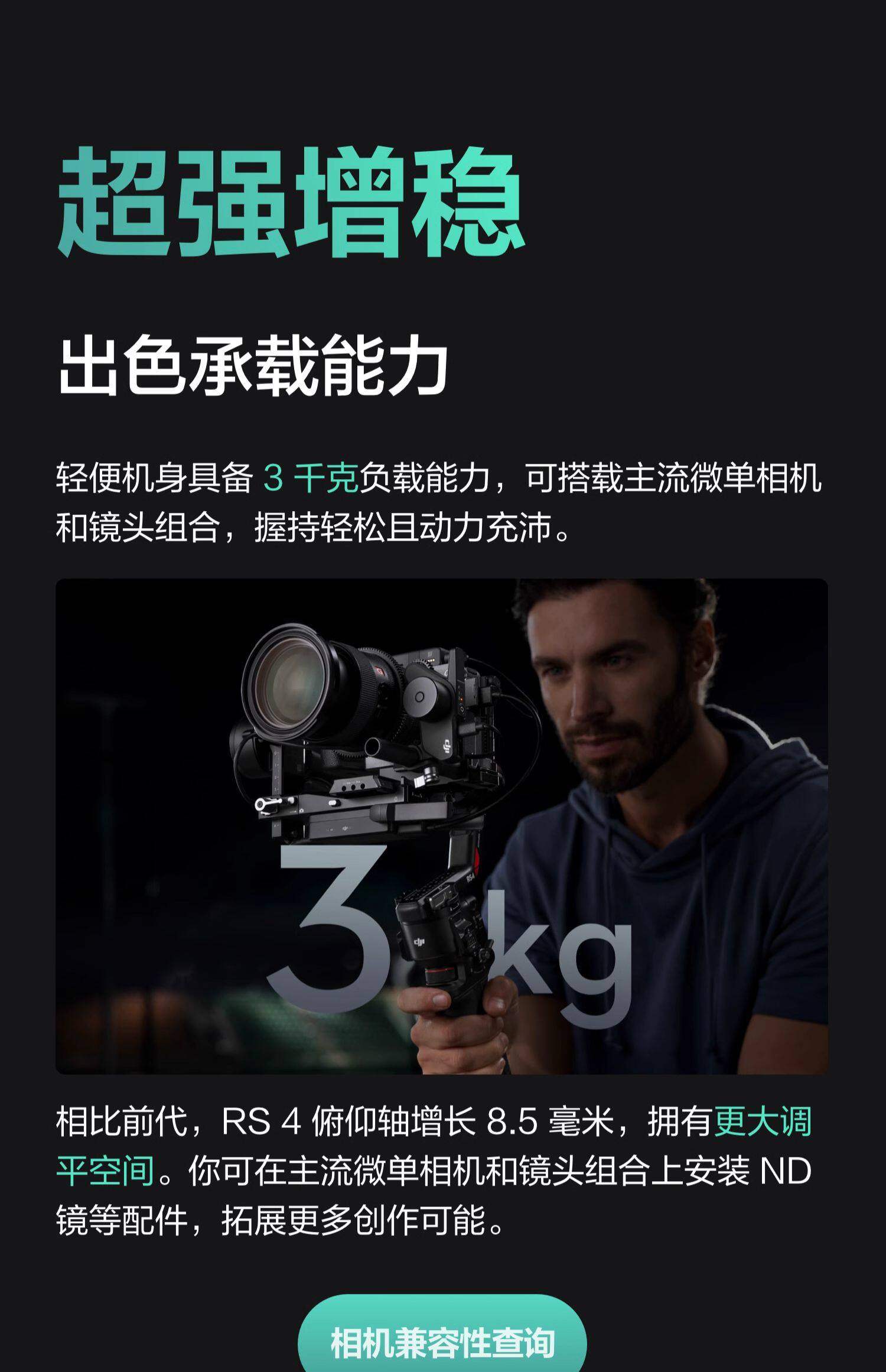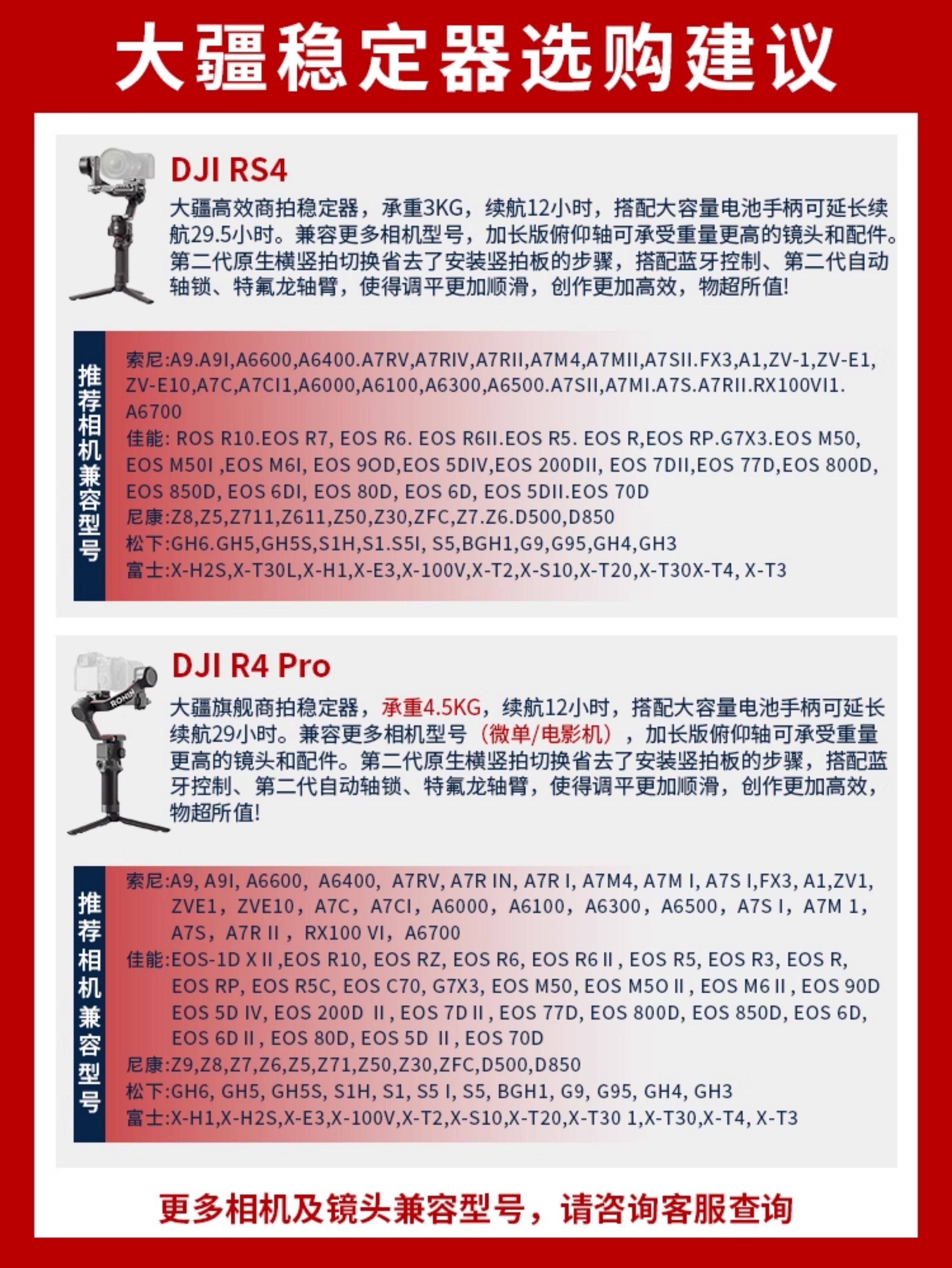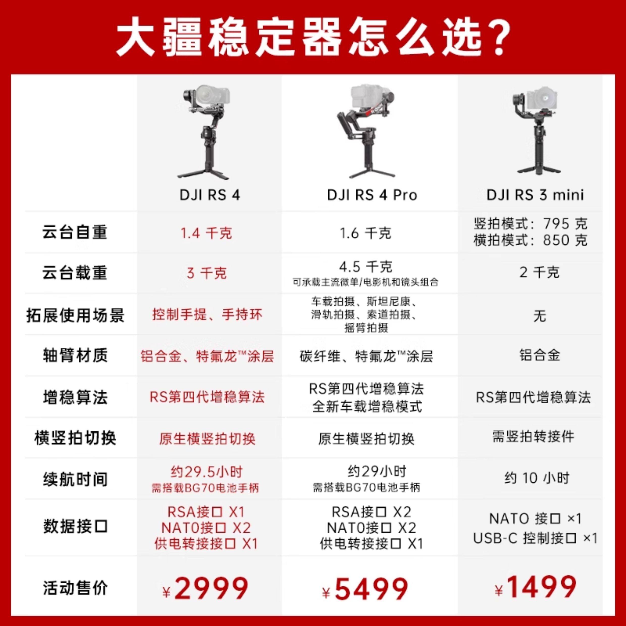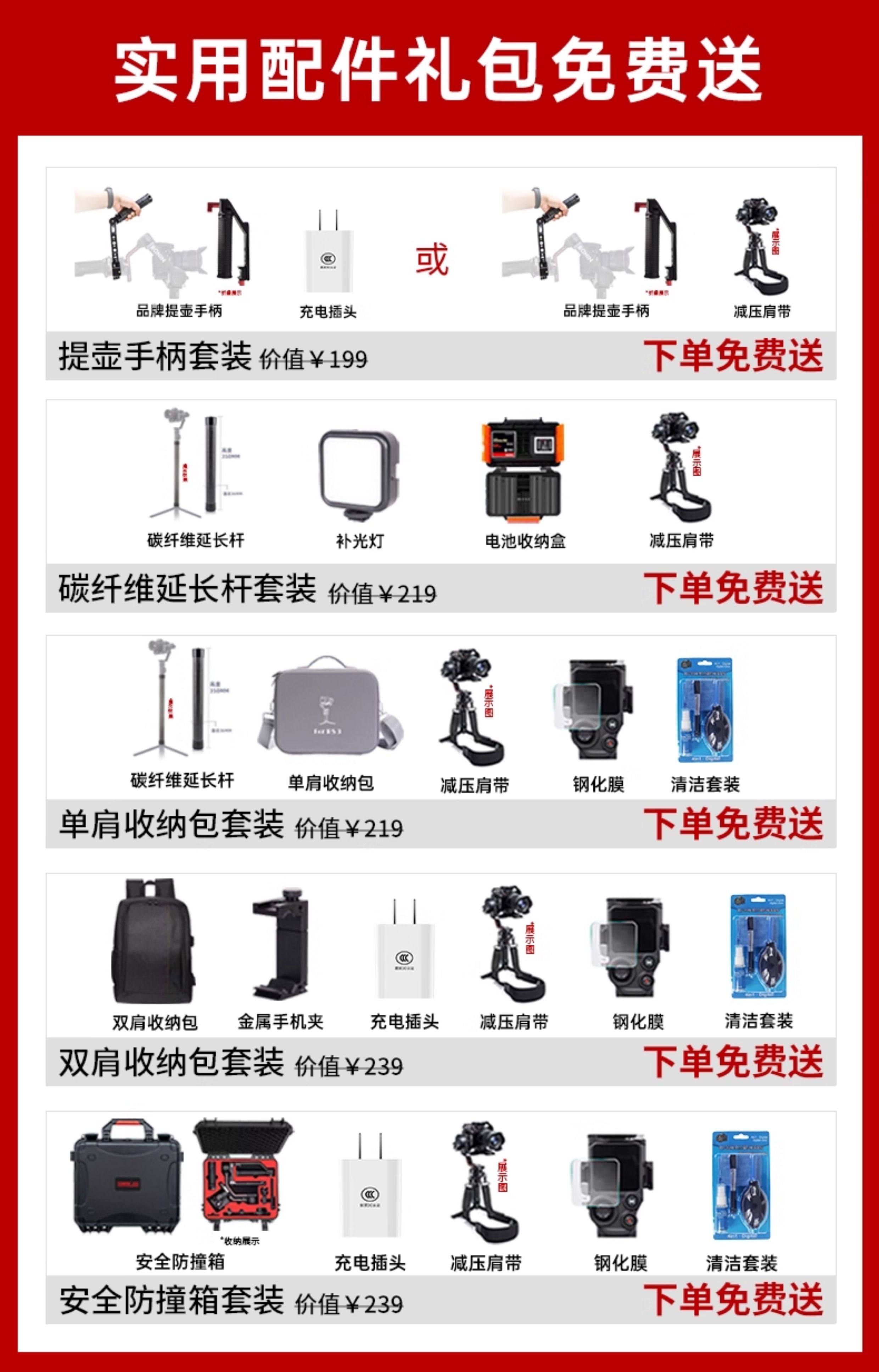 颜色分类 RS3mini(送提壶手柄)日常随拍优选,RS3mini(送收纳包+延长杆)创意拍摄套装,RS3mini(送双肩包)多场景拍摄,RS3mini(送收纳包+提壶手柄)— 2 千克承重,RS4 mini 标准版(送收纳包+延长杆),RS4 Mini 标准版(送延长杆+补光灯),RS4 Mini 标准版(送提壶+充电头),RS4 mini 标准版(品牌提壶套装),RS4 mini 标准版(品牌提壶手柄+收纳包),RS4mini 套装版(送延长杆+补光灯),RS4mini 套装版(送收纳包+碳纤维延长杆),RS4mini 套装版(双肩包套装),RS4mini 套装版(三脚架套装),RS 4 标准版(收纳包)— 3 千克承重,RS 4 标准版(延长杆+补光灯套装),RS 4 标准版(提壶+充电插头)套装,RS 4 标准版(提壶+减压肩带)套装,RS 4 标准版(提壶+收纳包)套装,RS 4 标准版(双肩包+延长杆)单兵拍摄套装,RS 4 标准版(原装提壶手柄)套装,RS 4 套装版(送双肩包)套装,RS4PRO标准(双肩包套装),RS4PRO标准(摄影三脚架)慢门长焦必备,RS4PRO套装版(多场景全能拍摄方案)