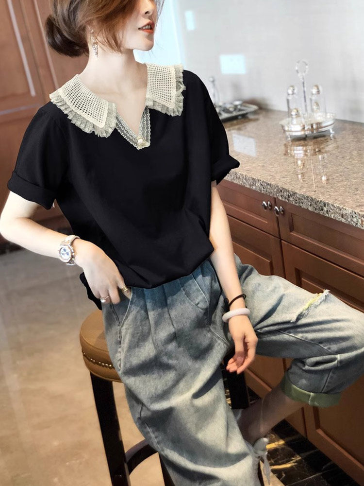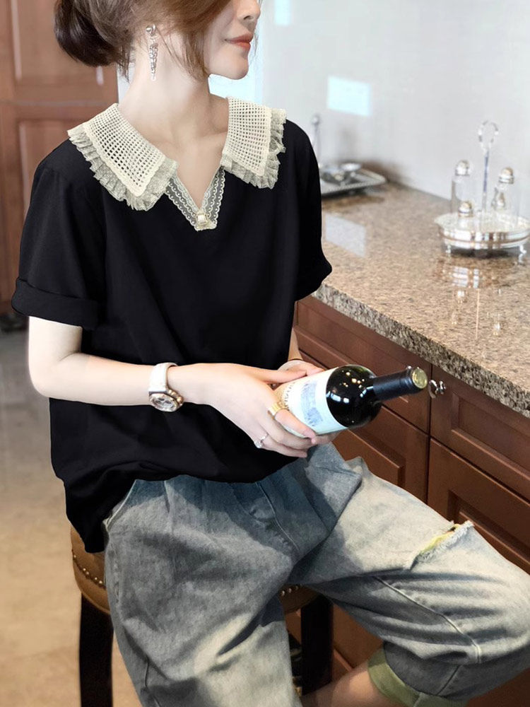 Camisa de manga corta con empalme de encaje francés de estilo ligero y maduro, novedad de verano, top de gasa hueco, transpirable y cómodo con cuello en V