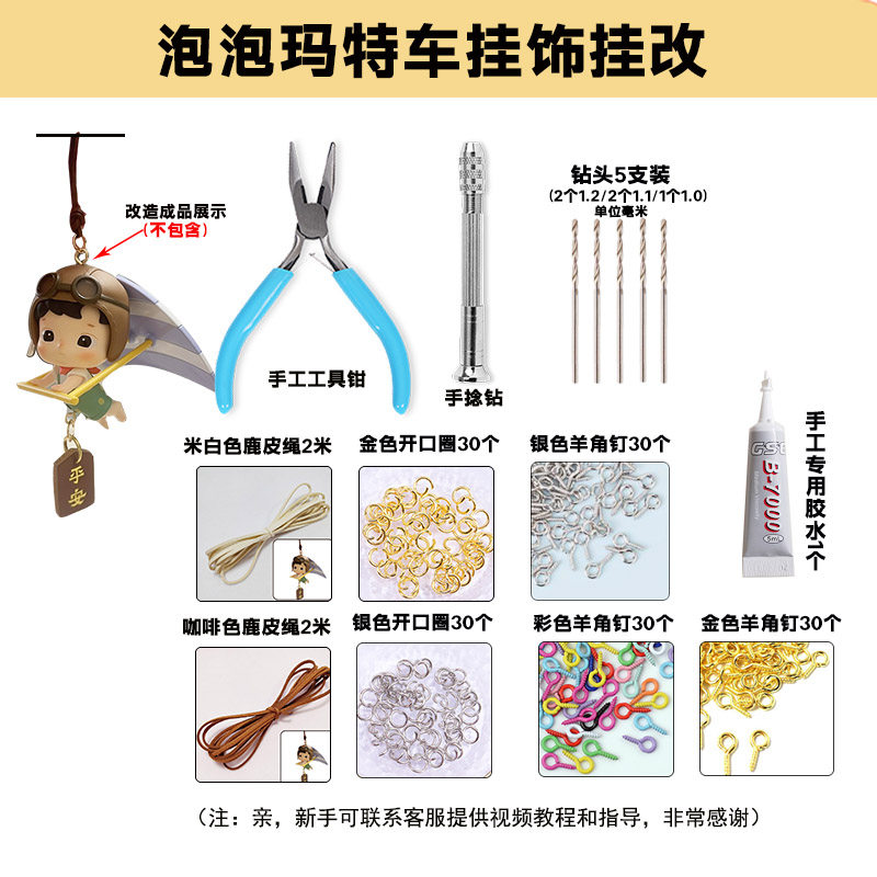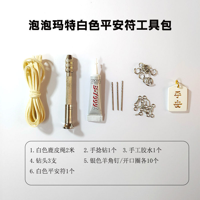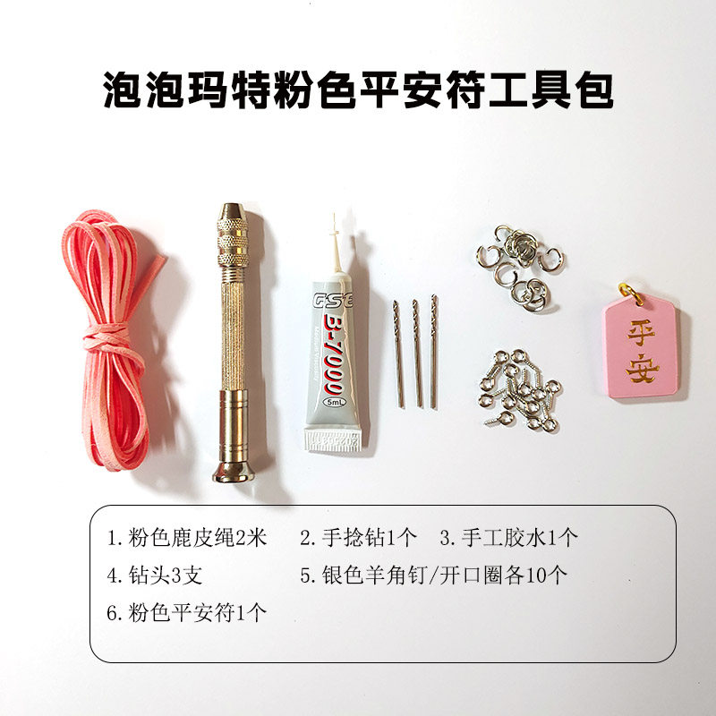 颜色分类 泡泡玛特工具包,泡泡玛特车挂饰挂改(店铺热销),泡泡玛特基础装(挂绳/挂牌颜色可备注),白色平安符工具包,粉色平安符工具包,浅蓝色平安符工具包,鹿皮绳4条各2米(下单备注颜色),银色羊角钉100个,金色羊角钉100个,彩色羊角钉100个,工具钳1把,开口圈1个,星星钥匙扣5个,彩色铃铛10个,银色电镀铃铛10个,鹿皮绳4色各2米,咖啡色鹿皮绳2米,米白色鹿皮绳2米,黑色鹿皮绳2米,粉色鹿皮绳2米,没有烦恼祝福牌1个,心想事成祝福牌1个,平安喜乐祝福牌1个,事事如意祝福牌1个,手工胶水1个(5ml),人间小可爱祝福牌1个,平安顺遂祝福牌1个,有趣有盼祝福牌1个,爱财爱己祝福牌1个,红色平安祝福牌1个(皮质烫金),红色福运祝福牌1个(皮质烫金),黑色平安祝福牌1个(皮质烫金)