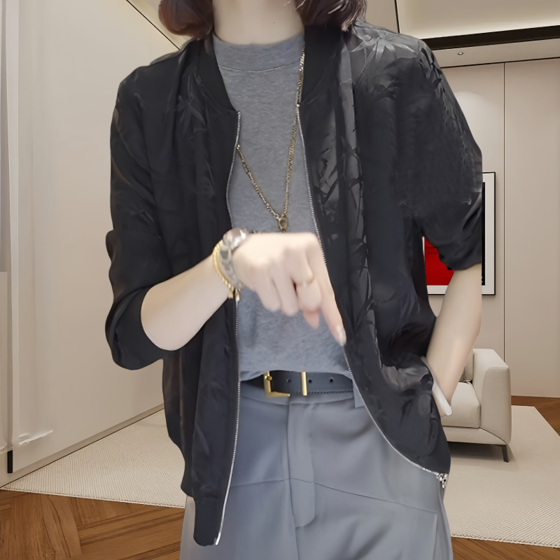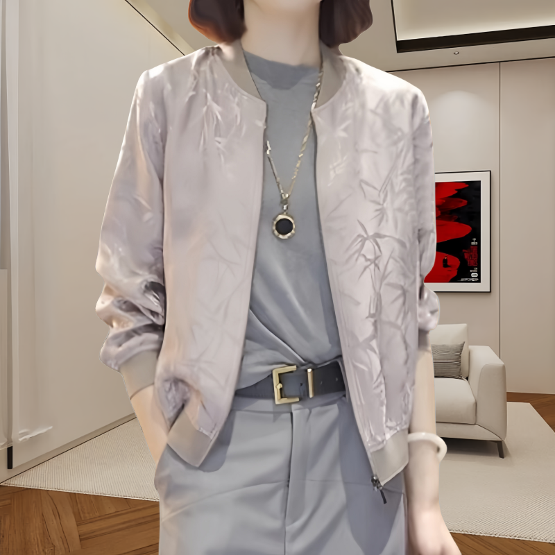 Bamboo Leaf Print Short Jacket for Women, New Summer Style, Zipper Cardigan, Thin Baseball Jacket, Versatile and Stylish Long-Sleeve Top