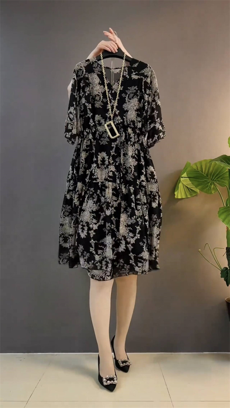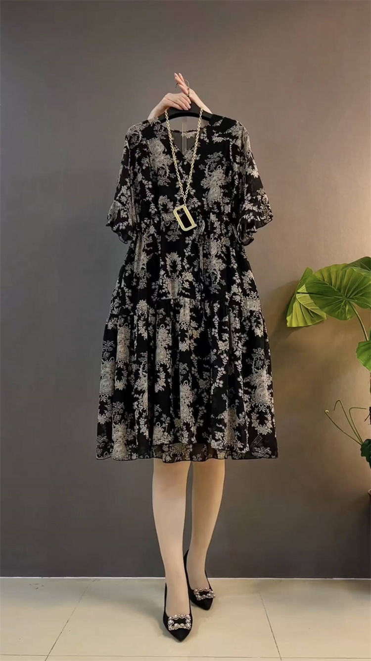 Plus Size Dress 2025 Summer New Style 100kg Fashionable for Chubby Girls, Tummy-Covering, Slightly Sheer, Floral V-Neck Long Dress