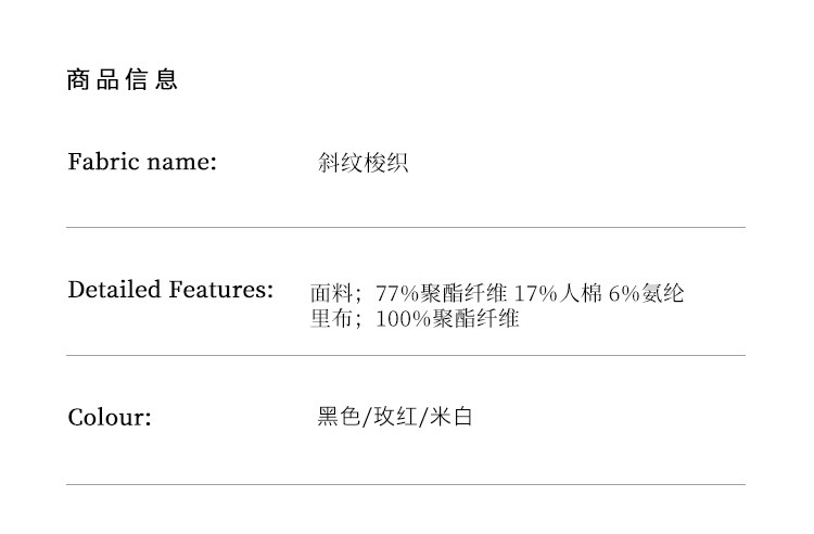 材质成分 聚酯纤维77% 聚氨酯弹性纤维(氨纶)6% 其他17%