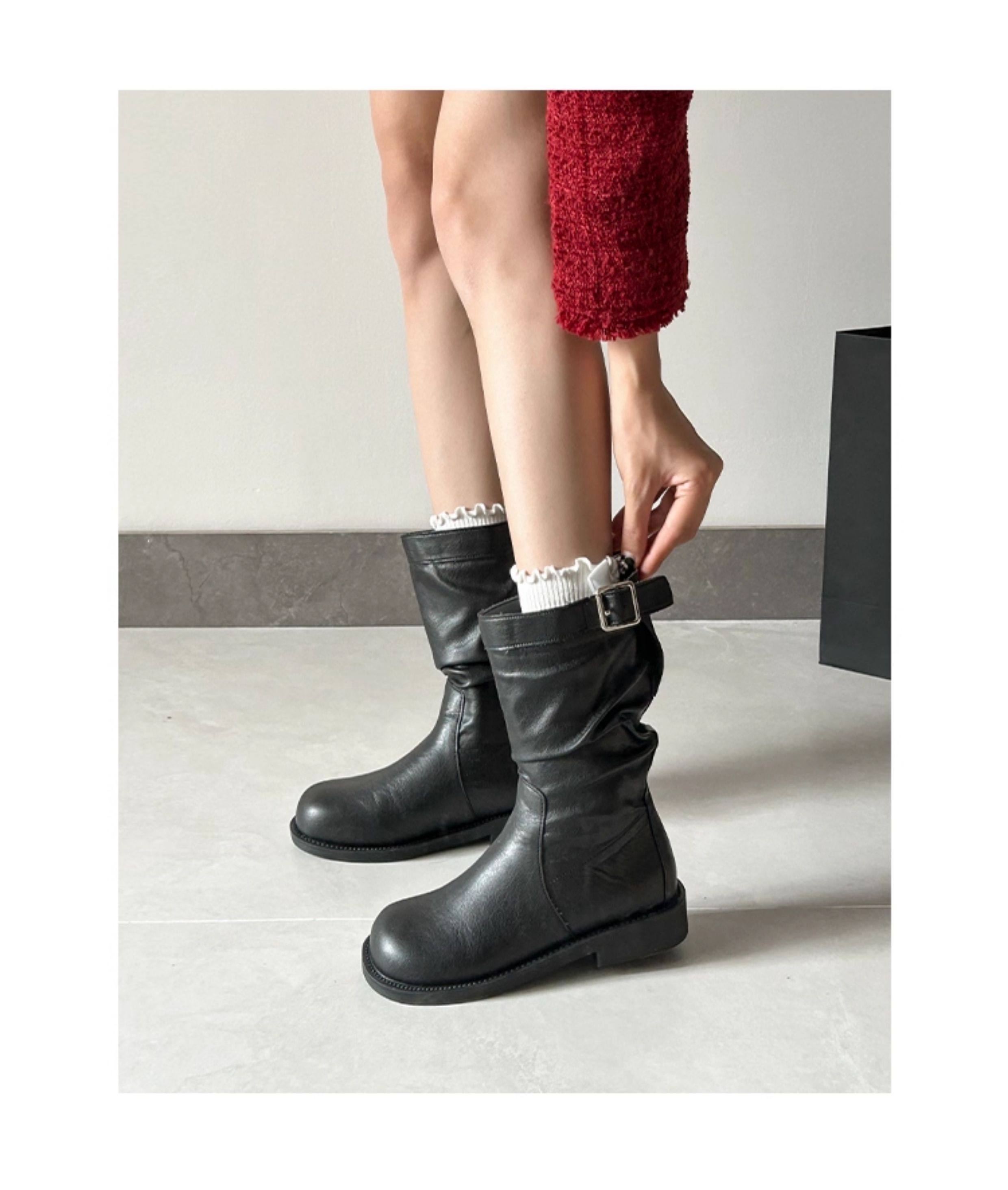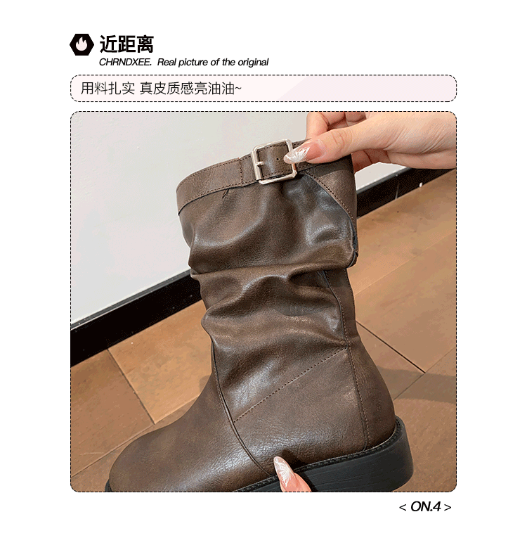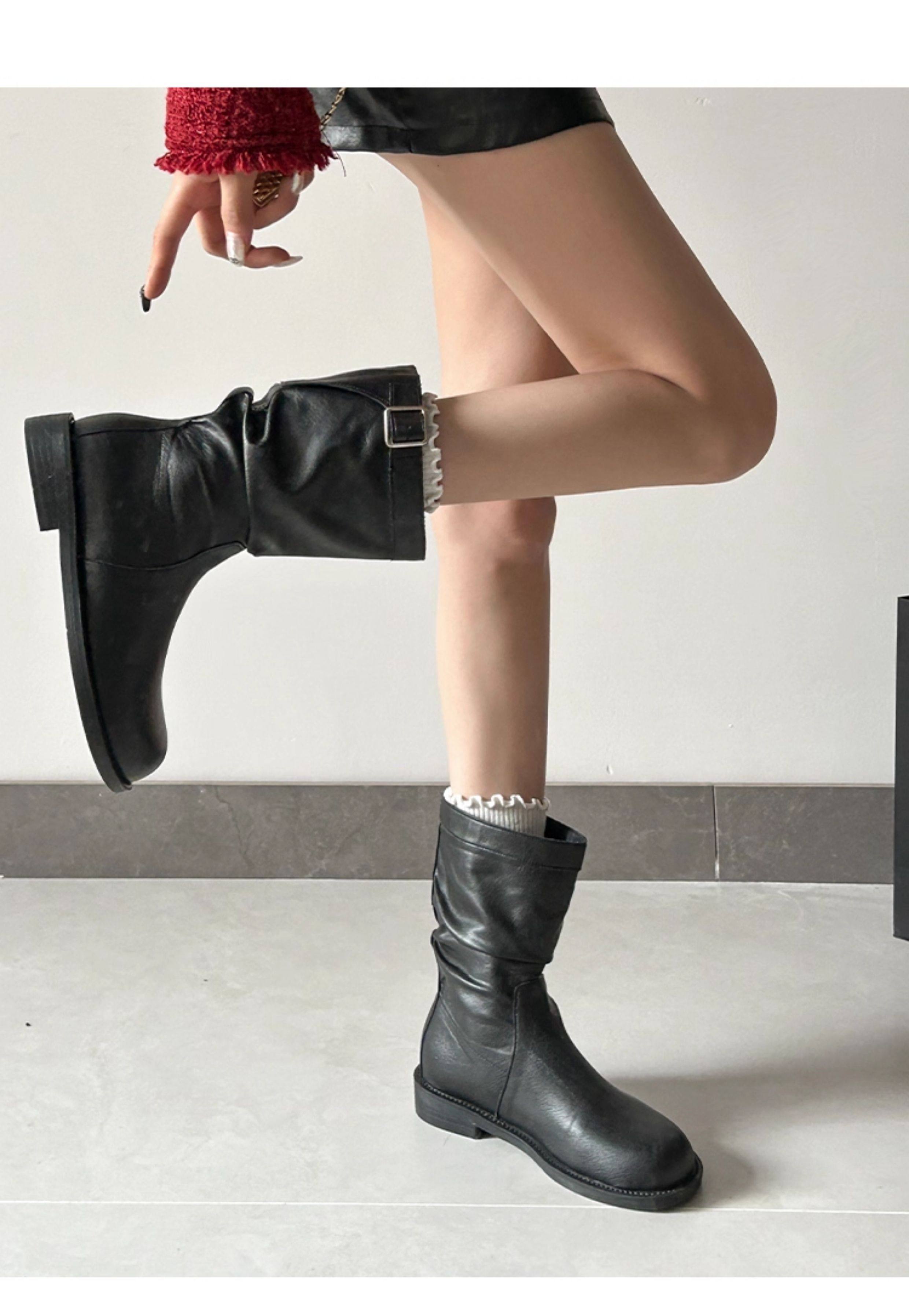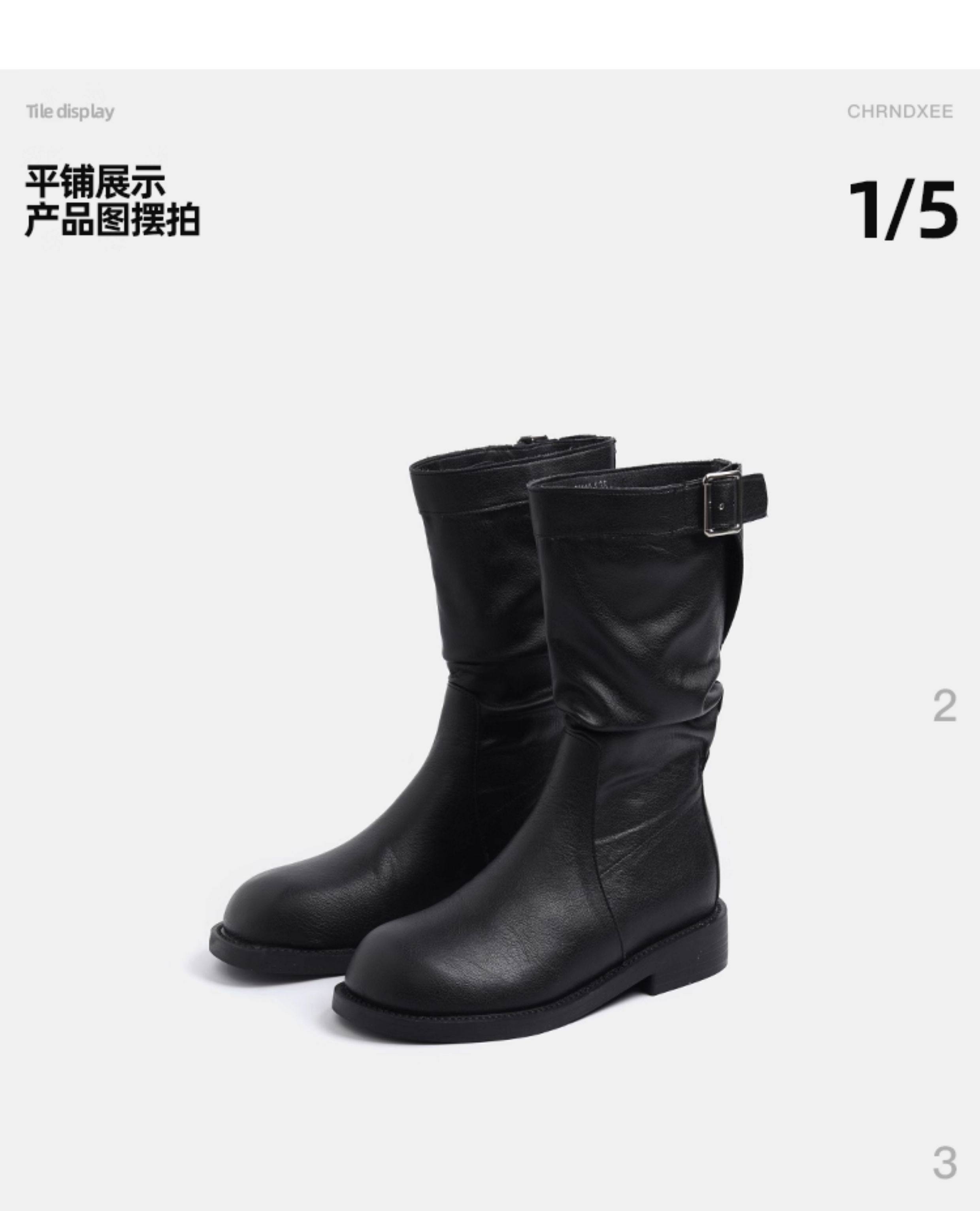 初系丨2024新款黑色褶皱靴女圆头搭扣复古套筒小短靴中筒马丁靴女