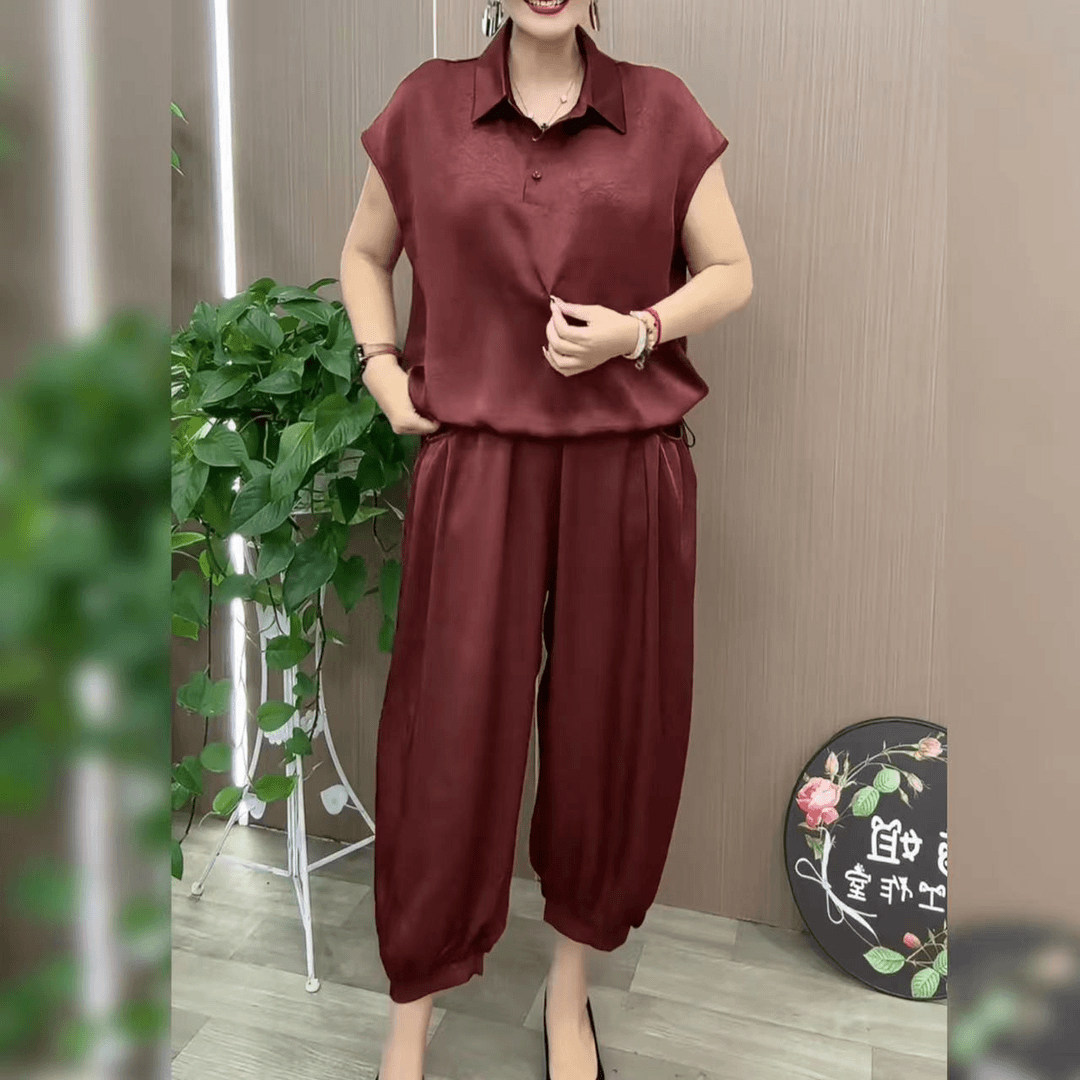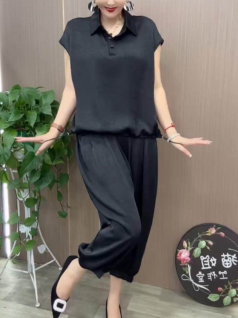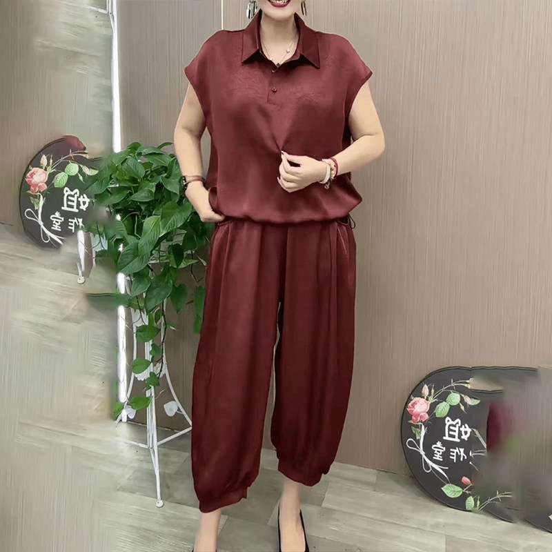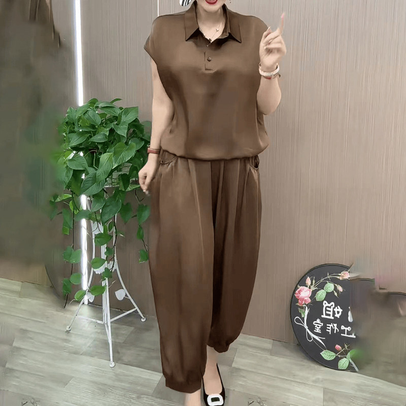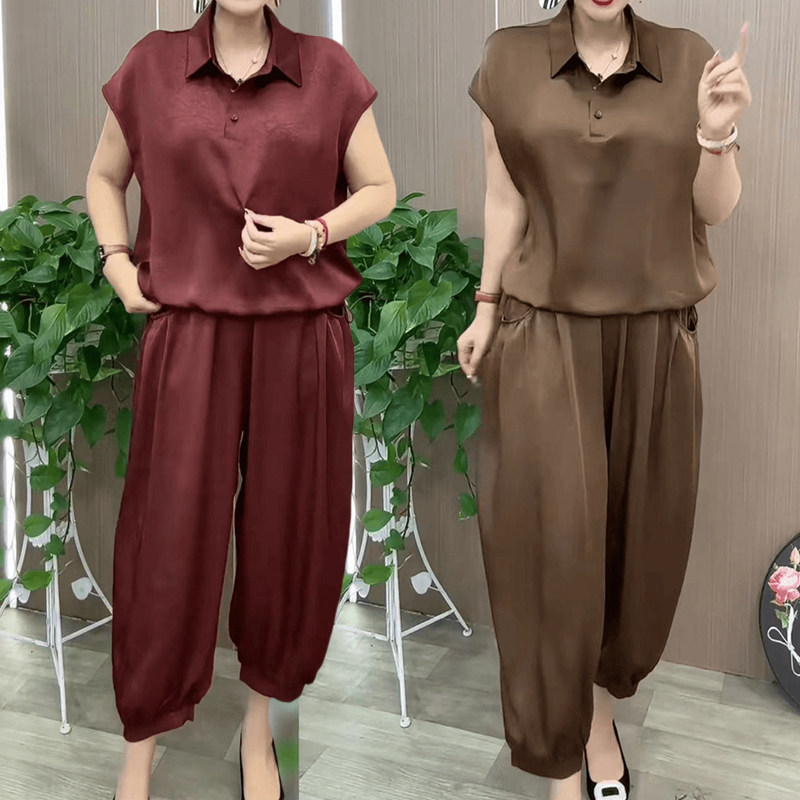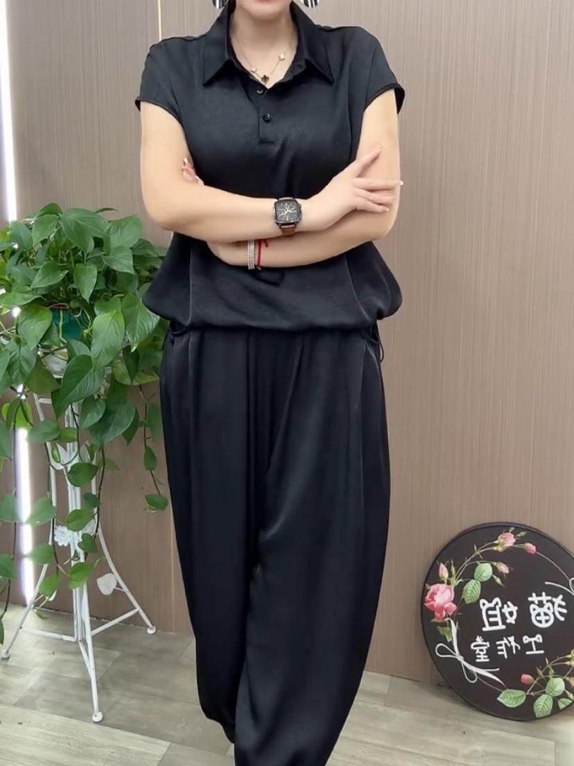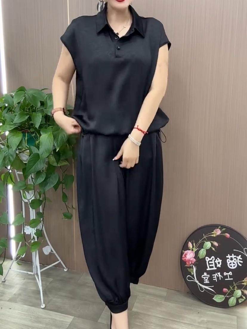 冰丝缎面套装薄款时尚妈妈装2024夏季新款宽松遮肉哈伦裤两件套女