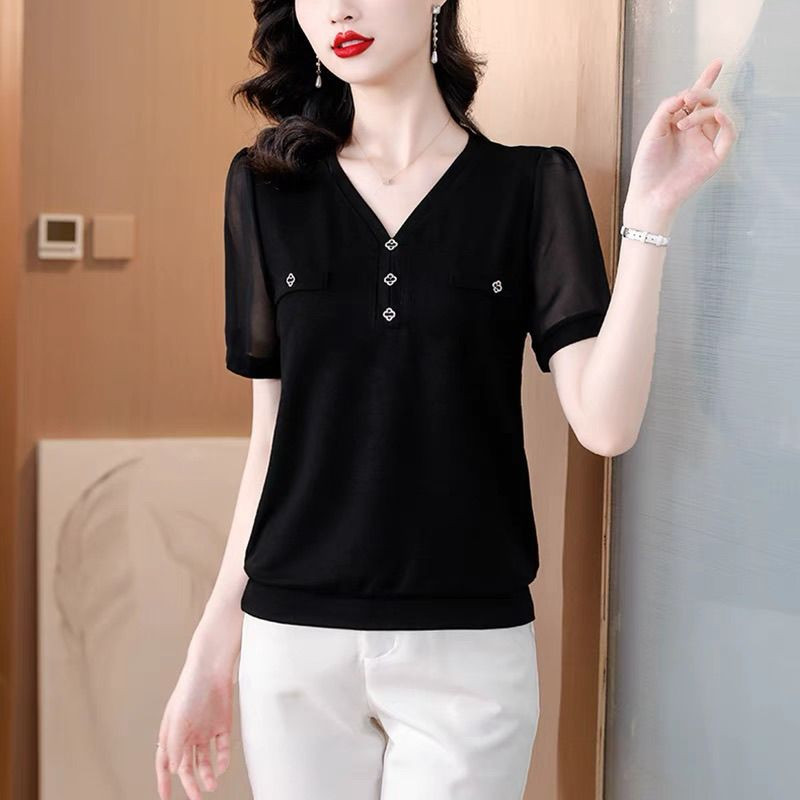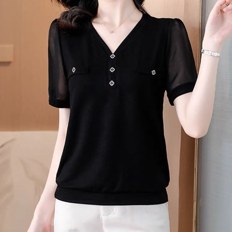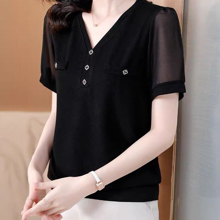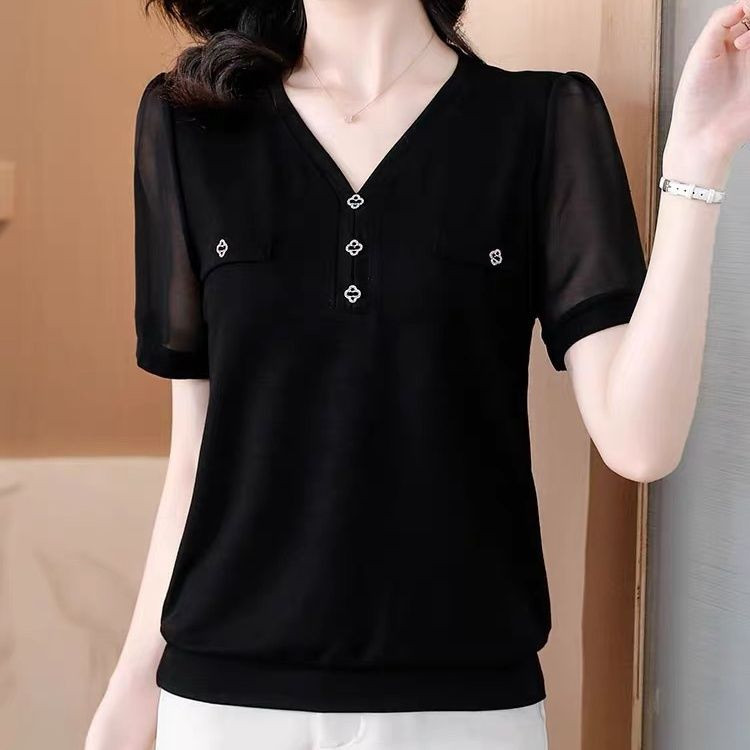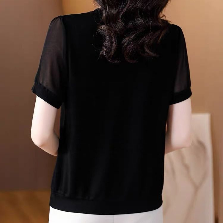 Ice Silk Short-Sleeved T-Shirt, Fashionable Women's 2025 New Chiffon Shirt, Loose and Slimming, Belly-Covering, Stylish Lace Half-Sleeve Top