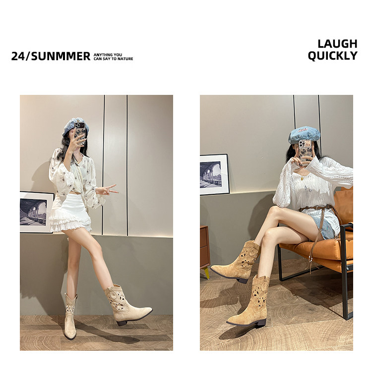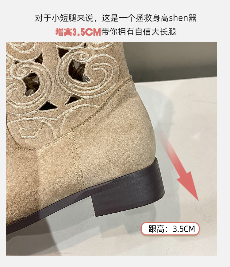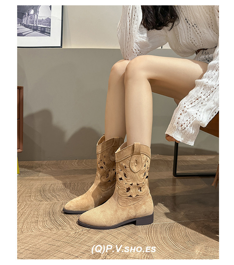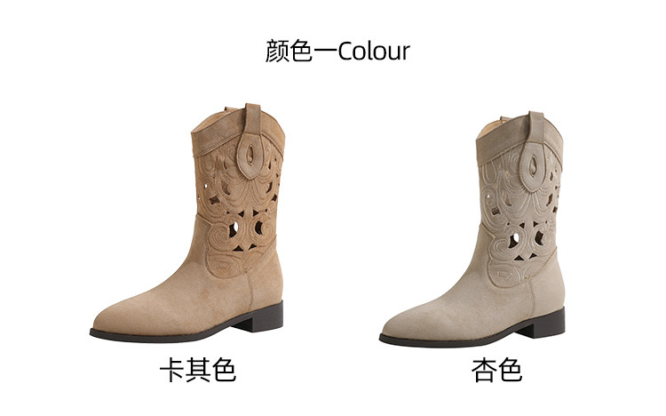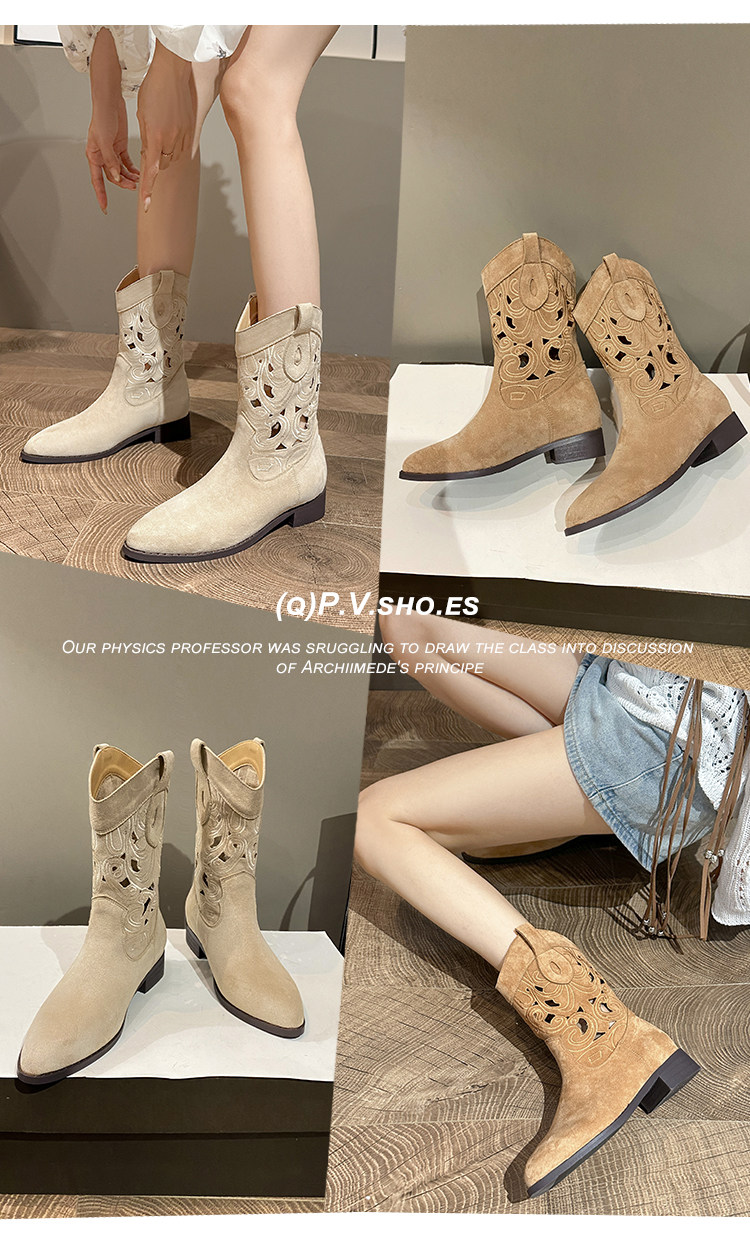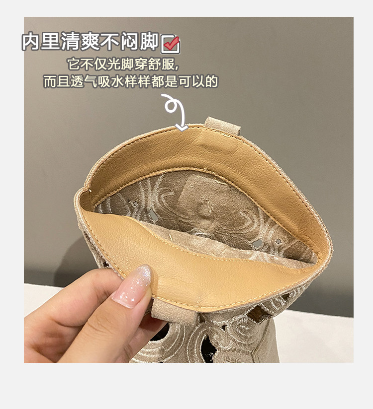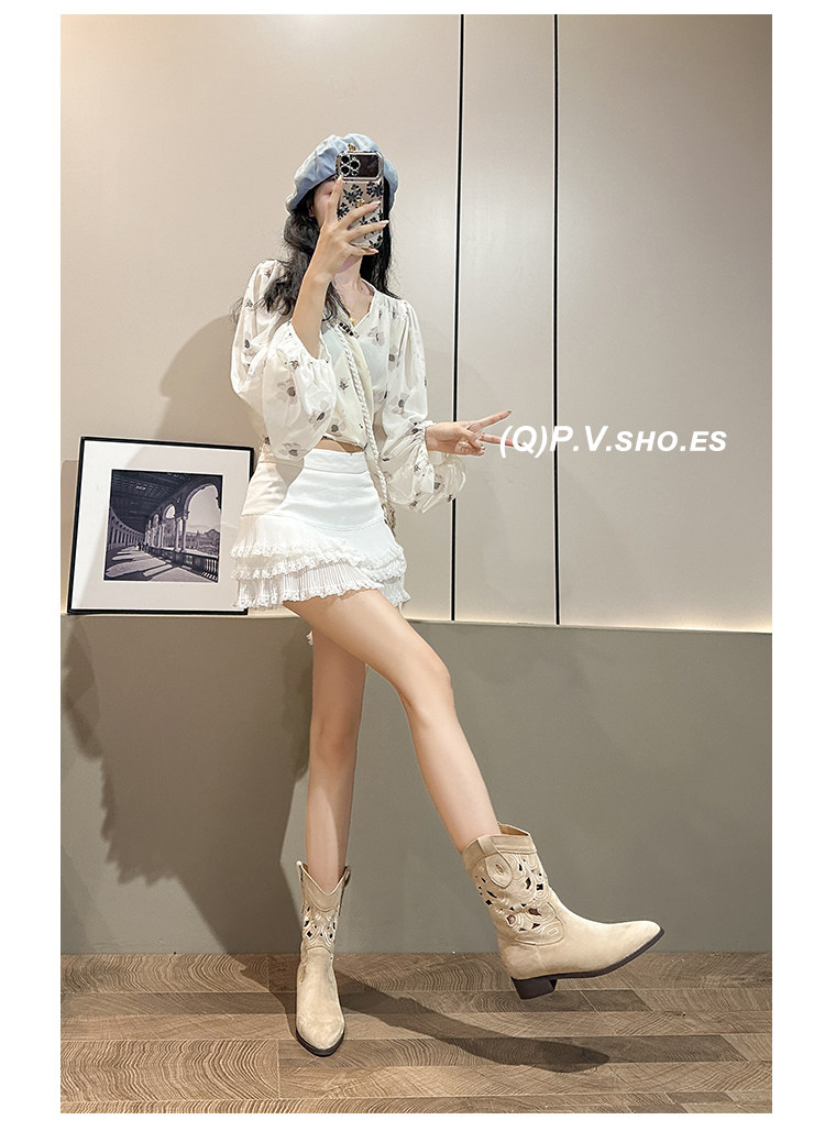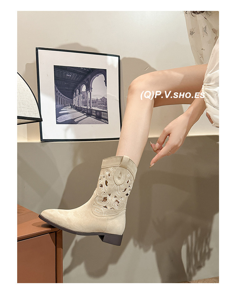 夏季镂空凉靴女尖头平底西部牛仔靴羊猄绒潮酷时装短靴个性骑士靴