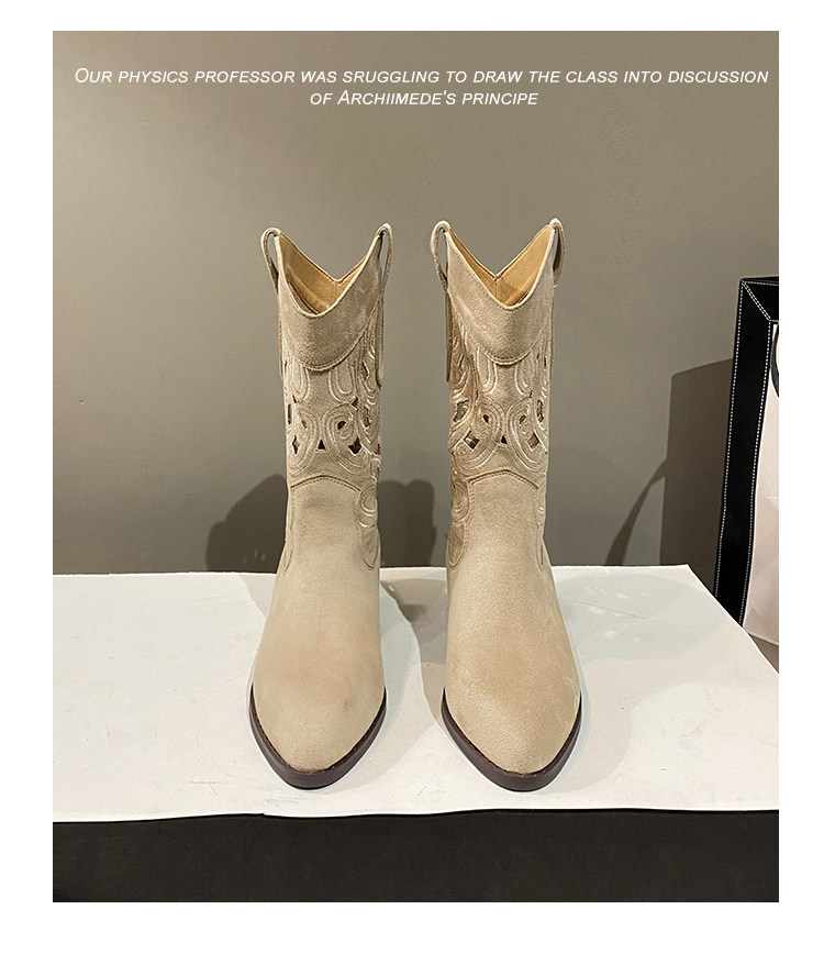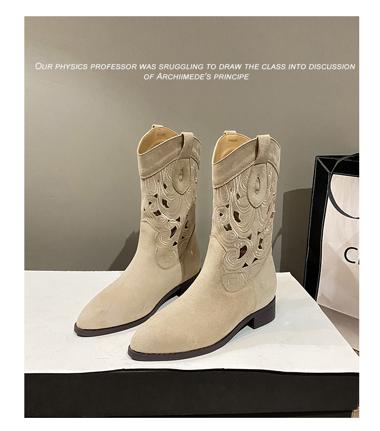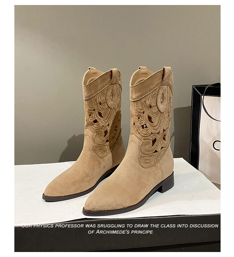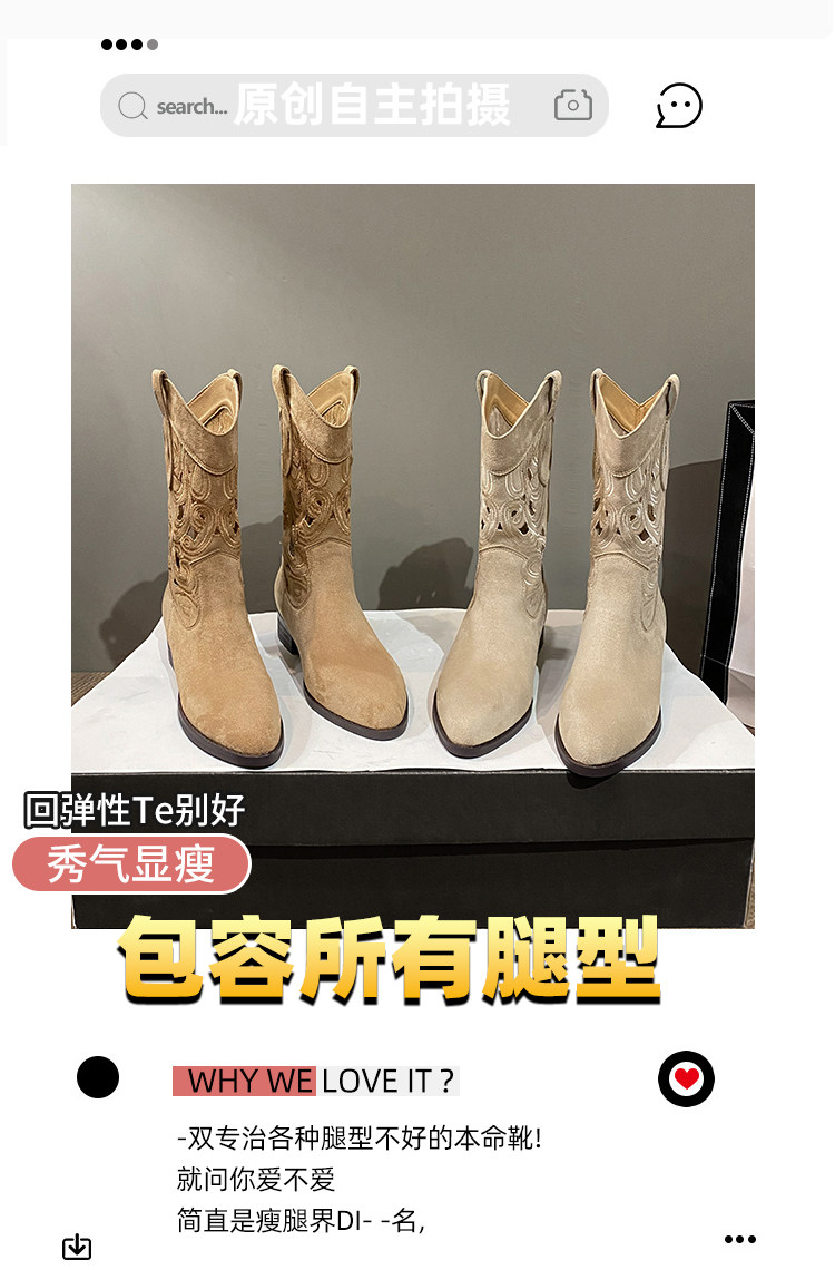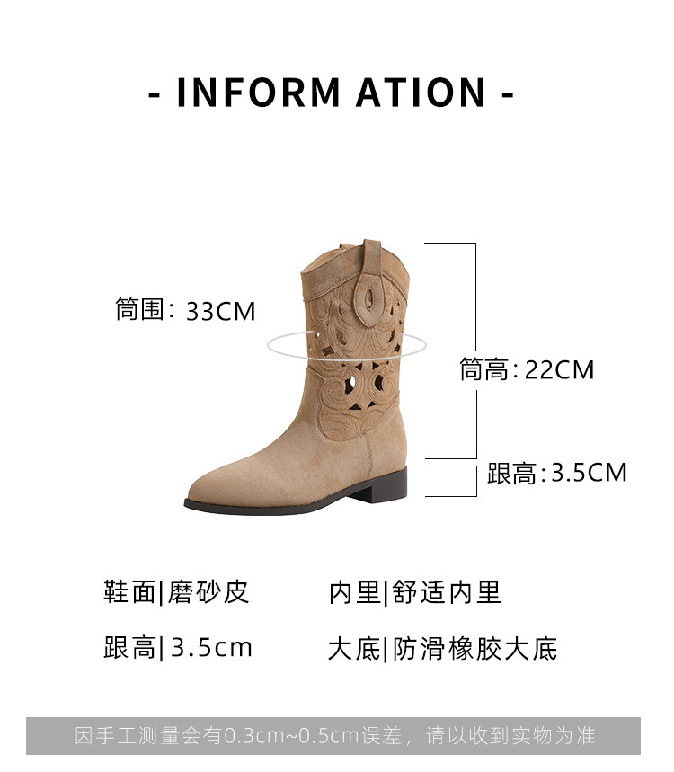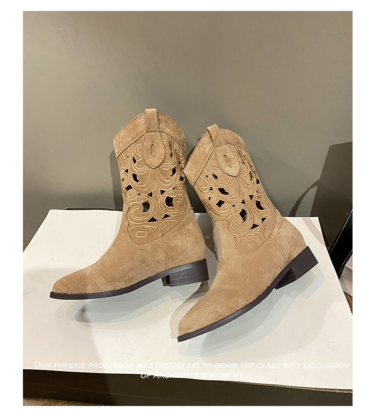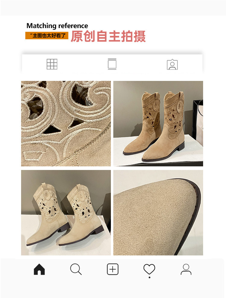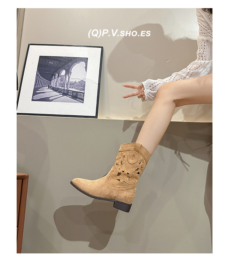 夏季镂空凉靴女尖头平底西部牛仔靴羊猄绒潮酷时装短靴个性骑士靴