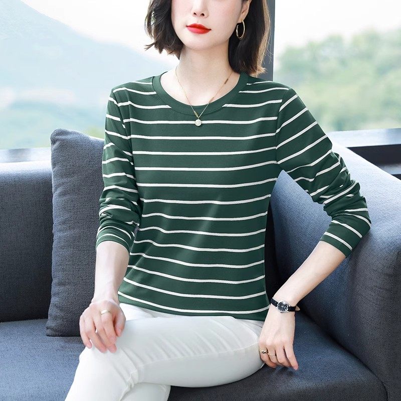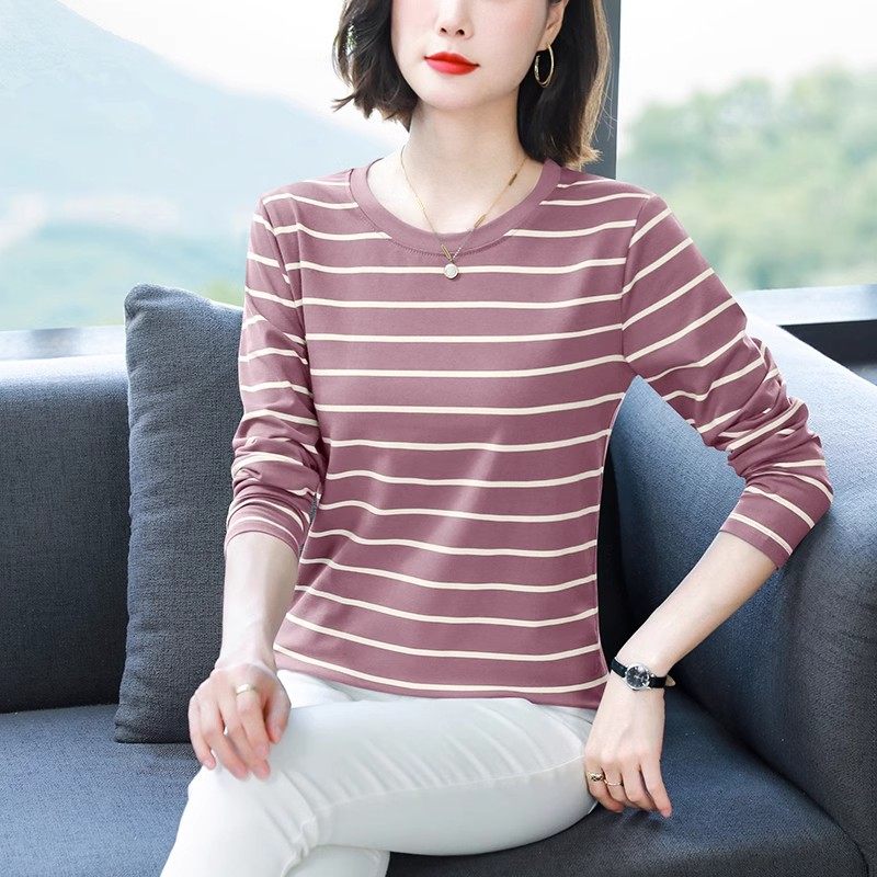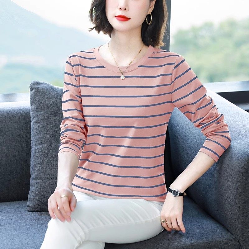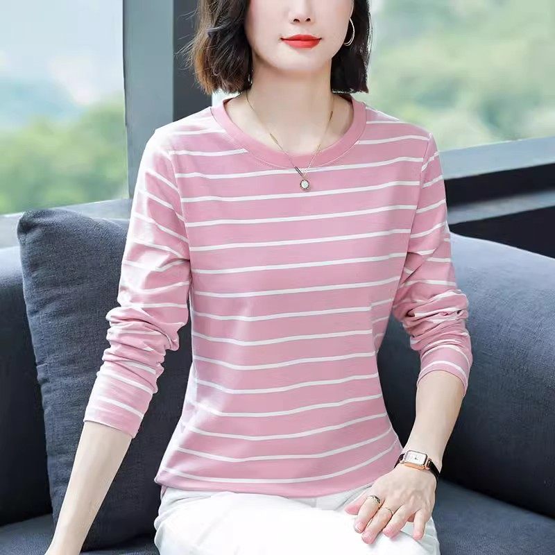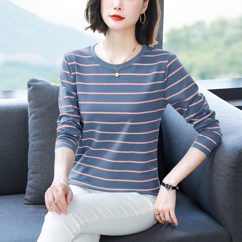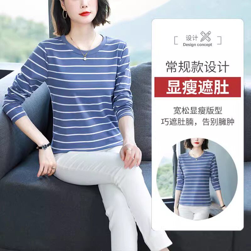 春秋装遮肚子纯棉上衣长袖t恤女宽松大码条纹秋衣薄款内搭打底衫