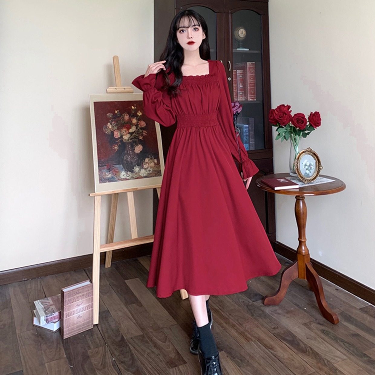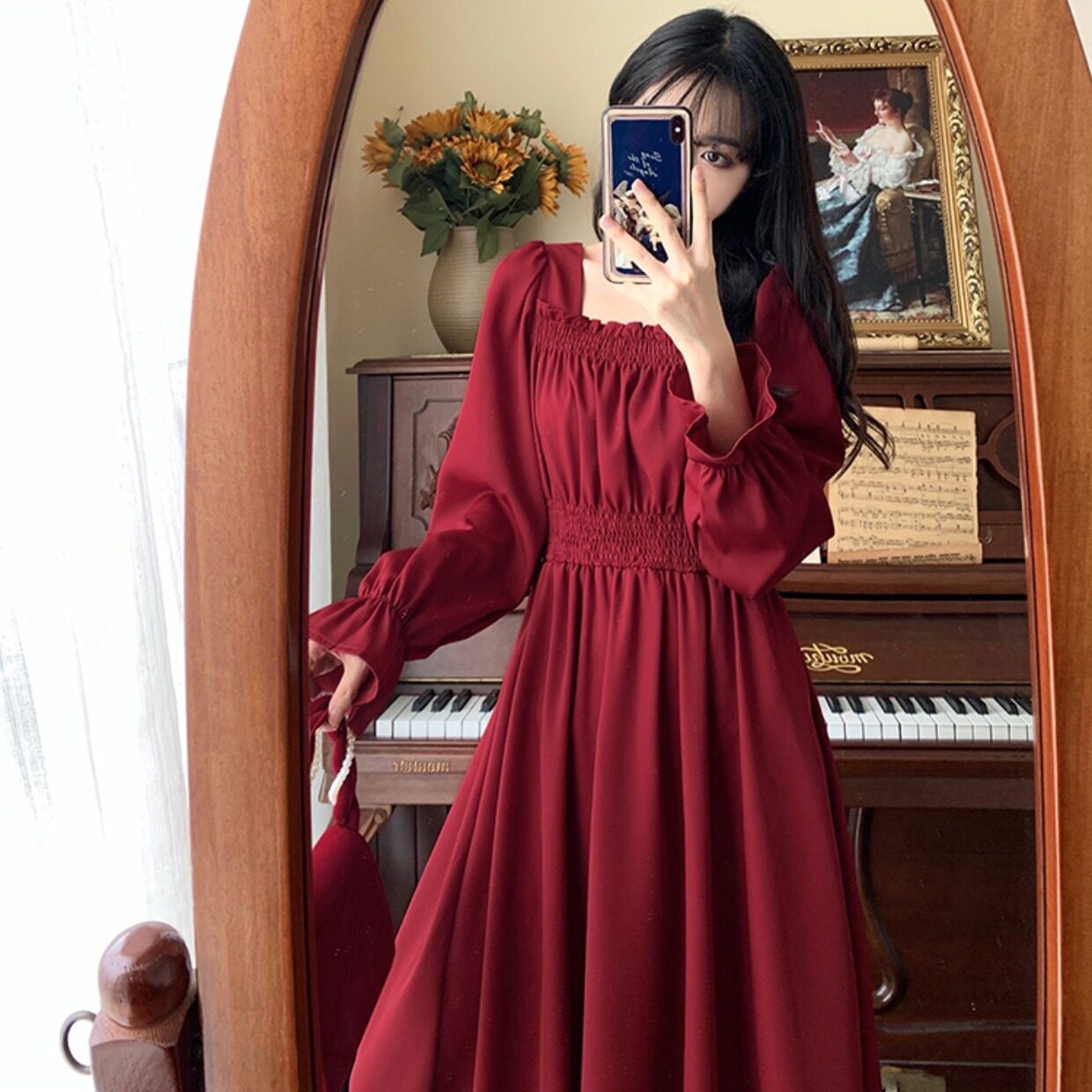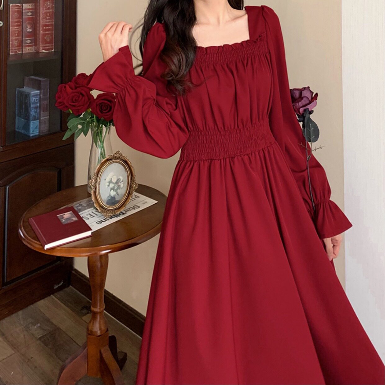 Plus-Size Retro Square-Neck Red Long Dress, New Autumn Style, Elegant Waist-Cinching Engagement Toast Dress