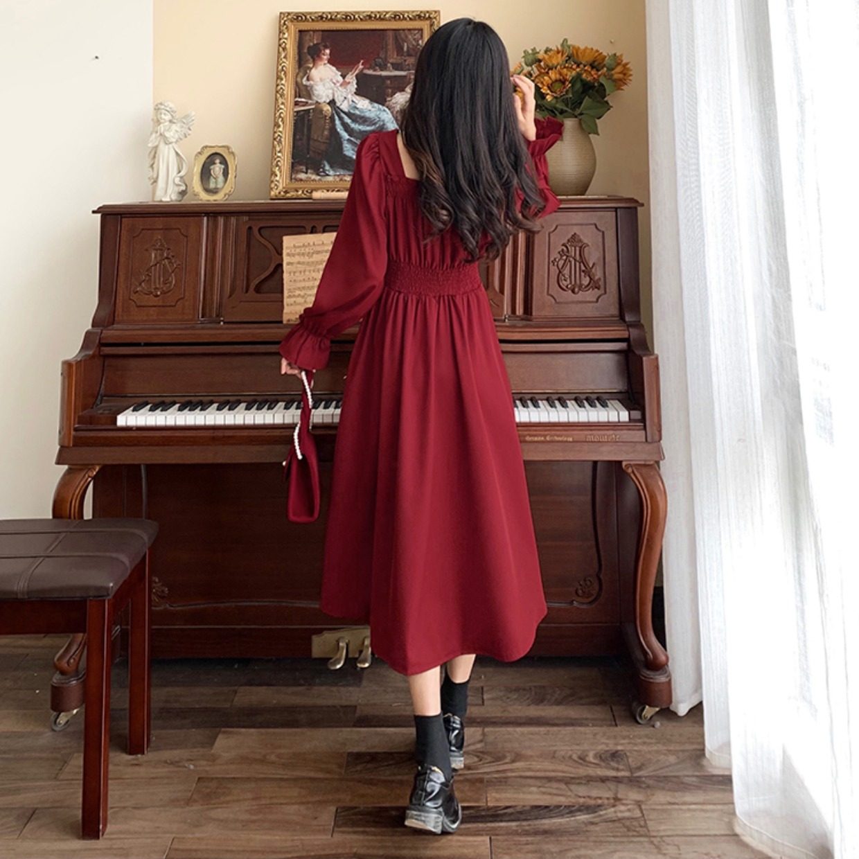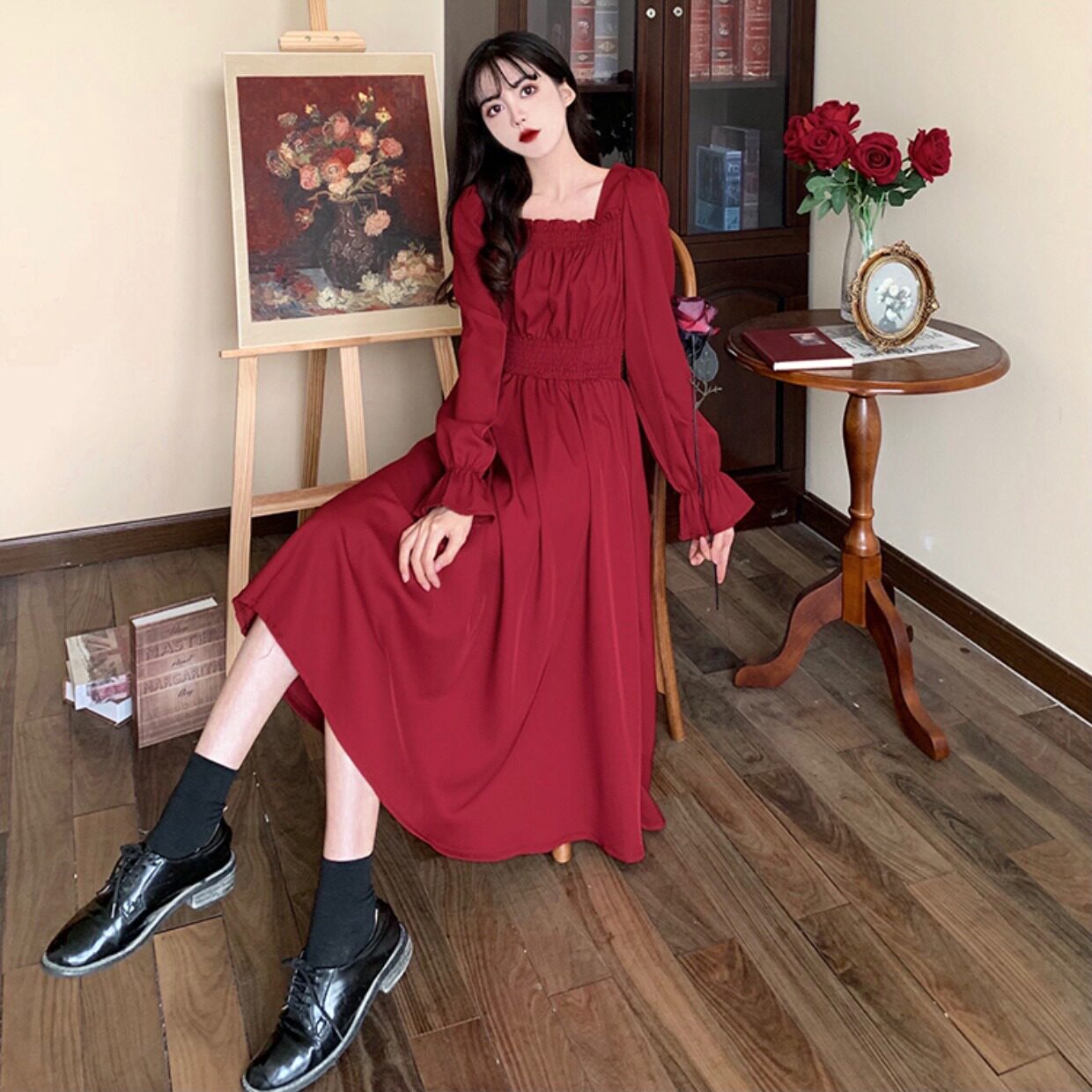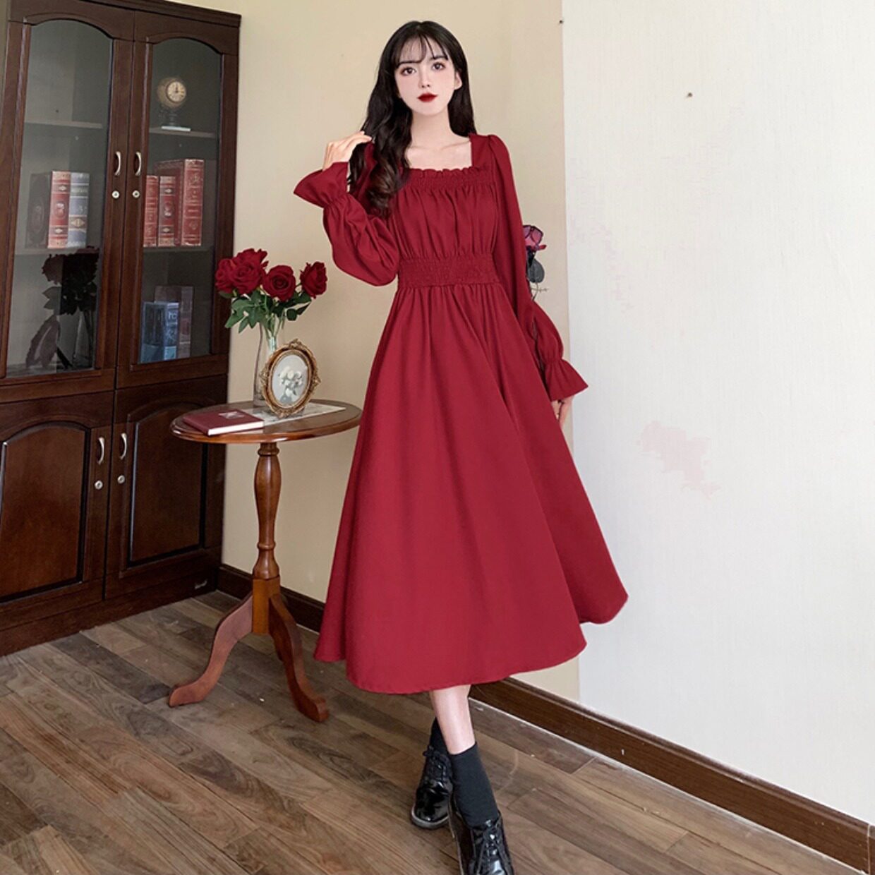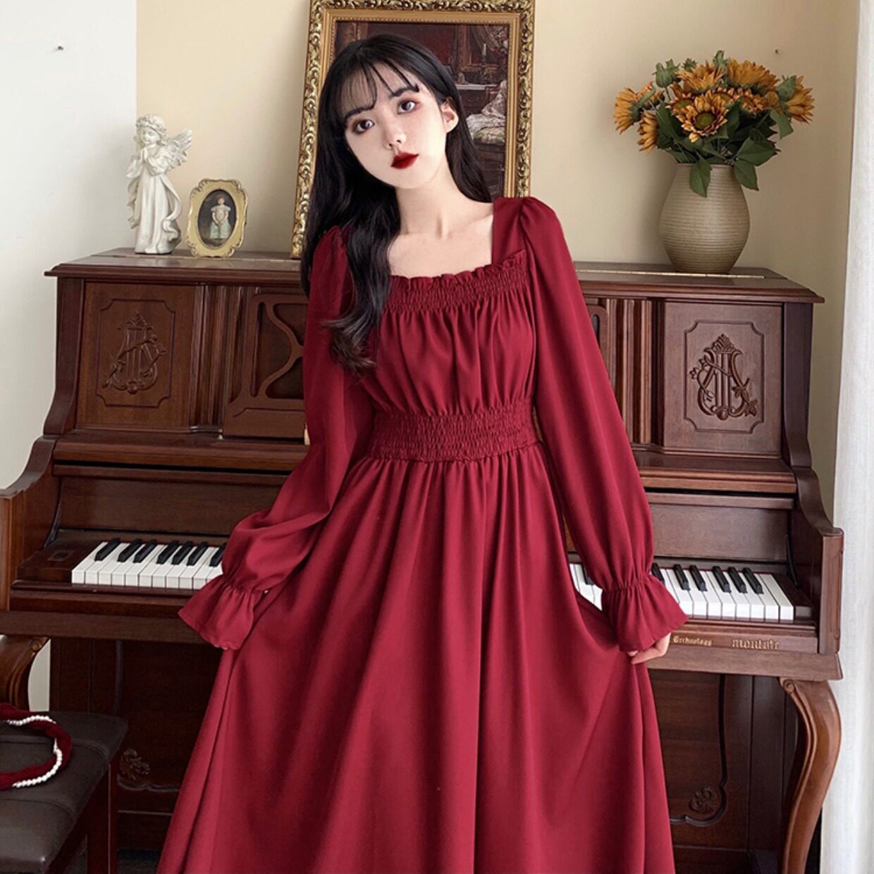 Plus-Size Retro Square-Neck Red Long Dress, New Autumn Style, Elegant Waist-Cinching Engagement Toast Dress
