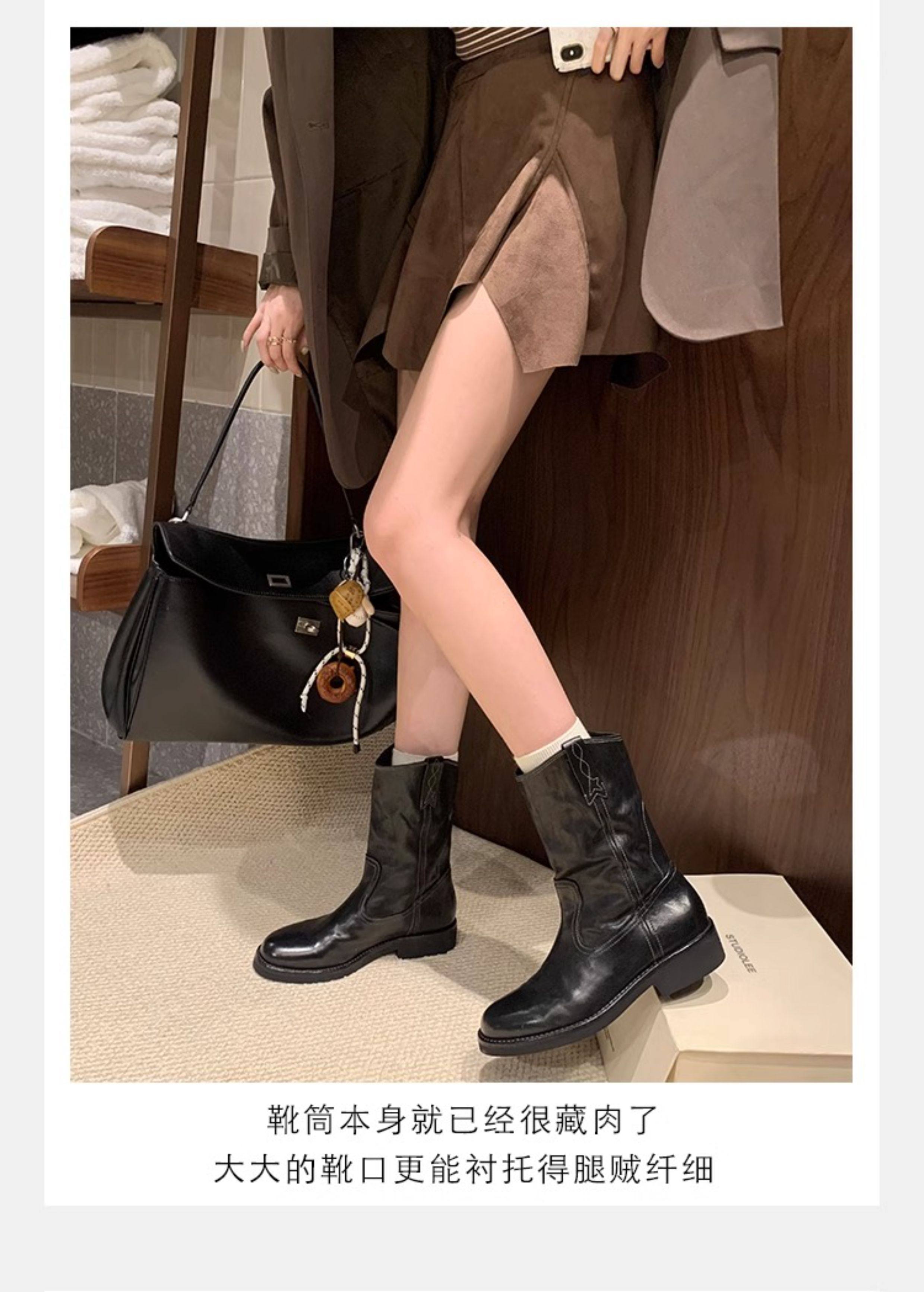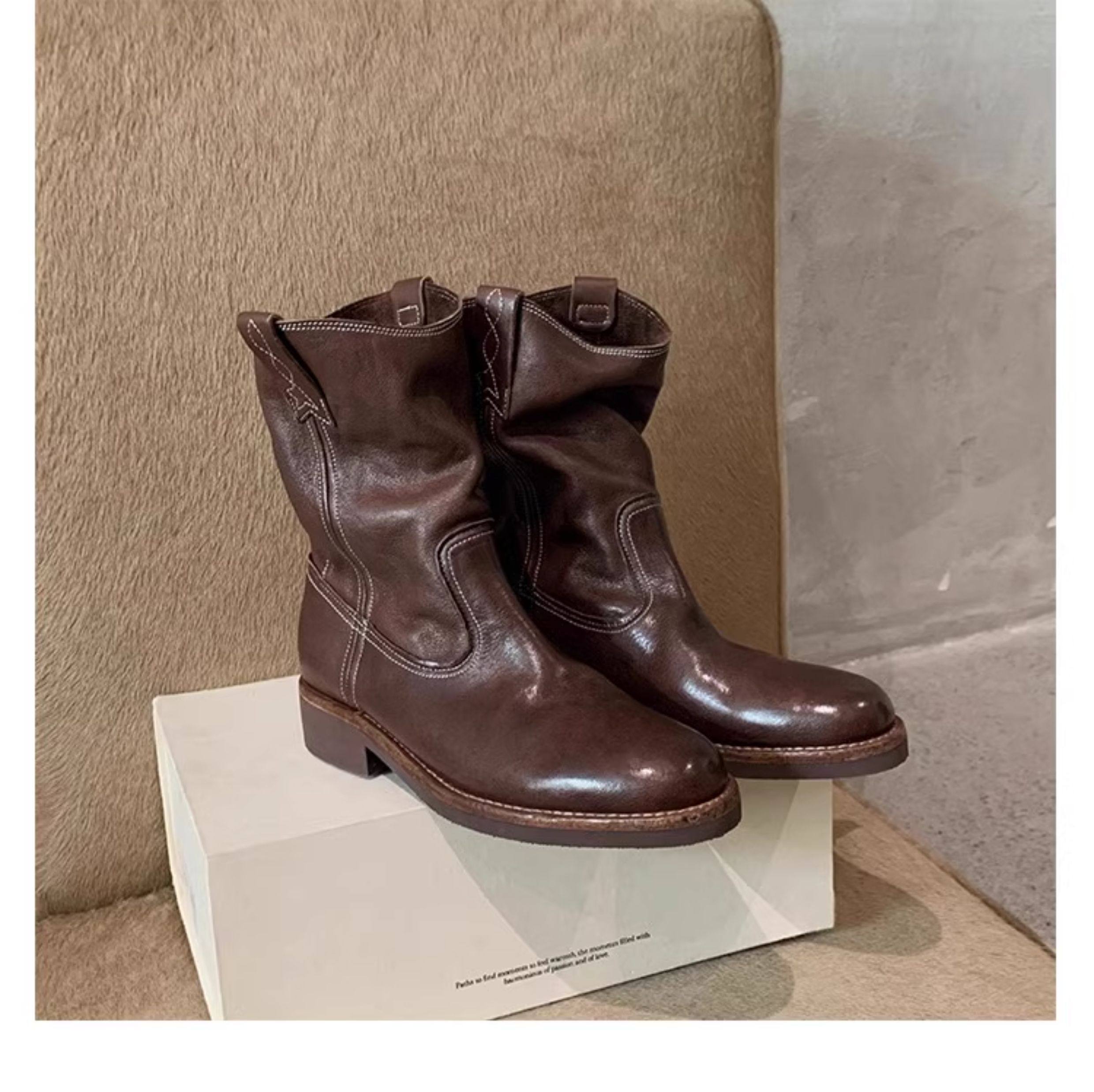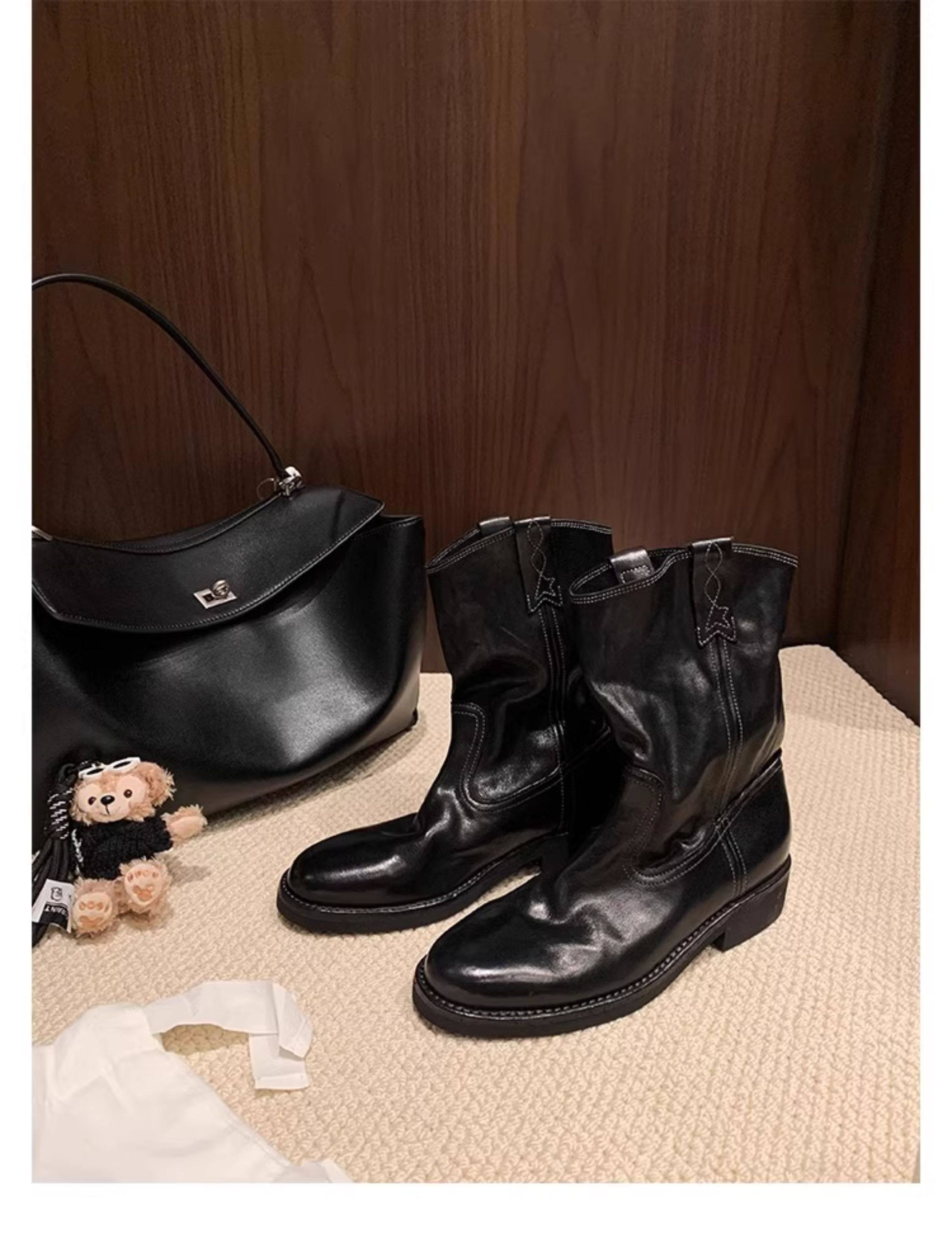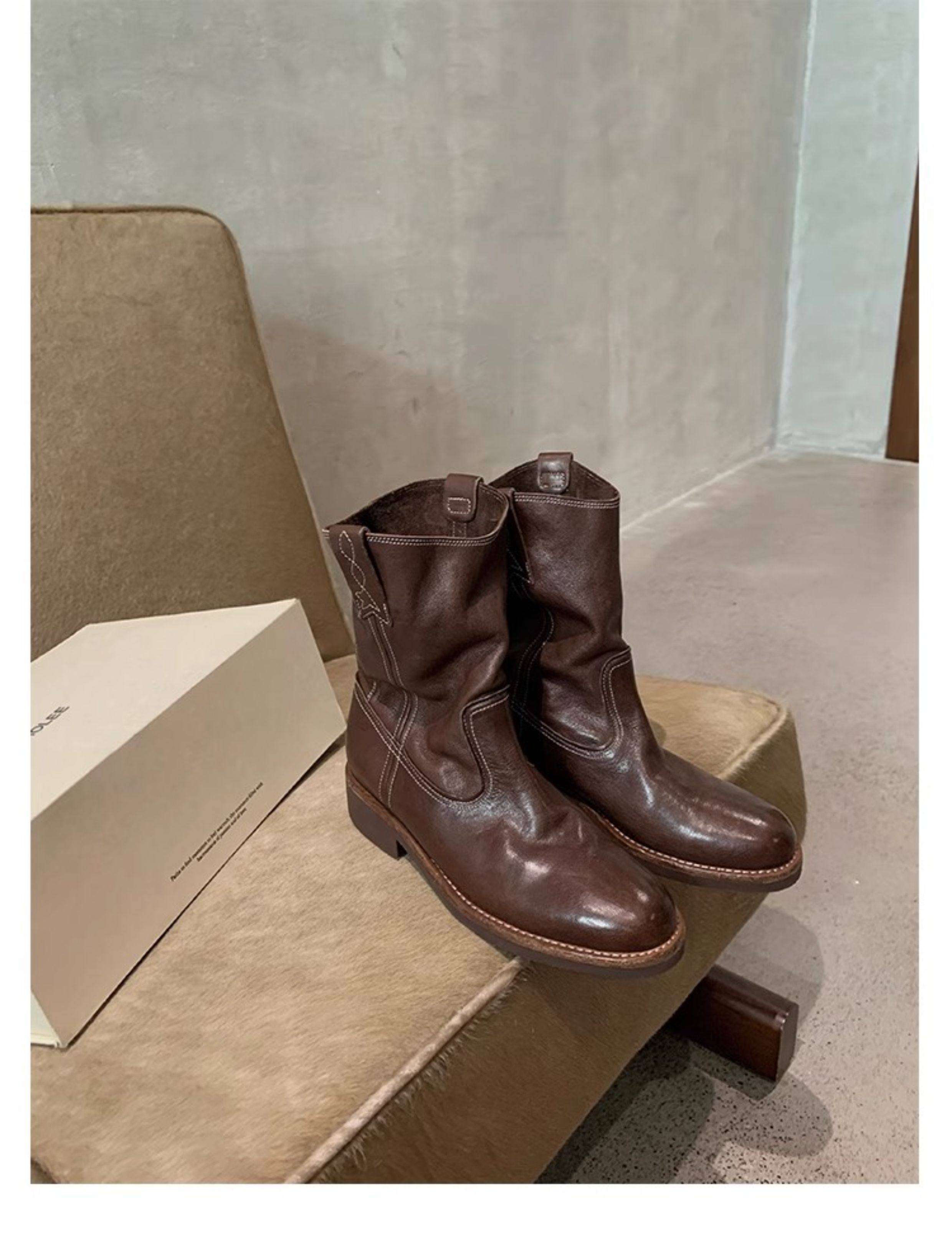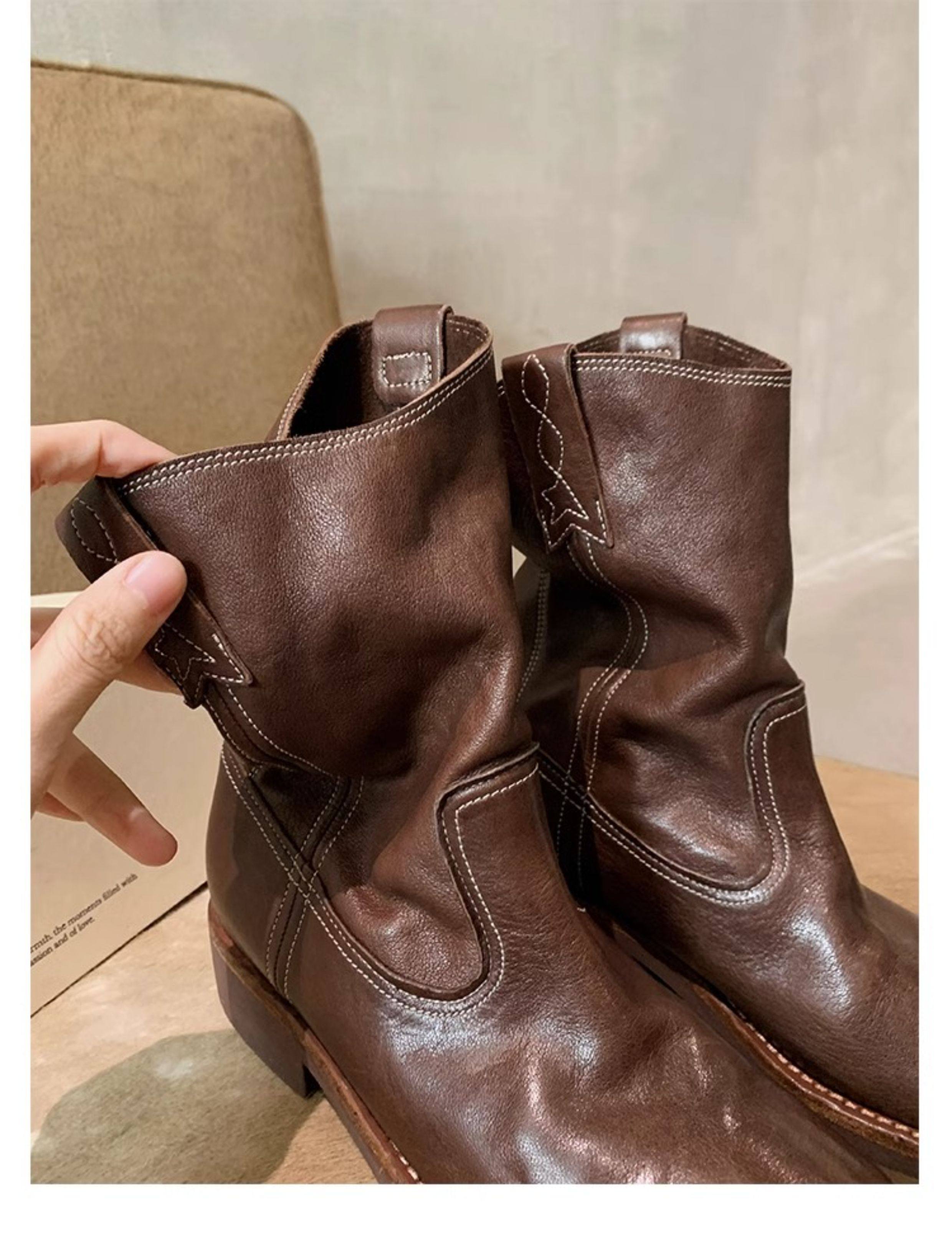 香港马皮真皮复古V口西部牛仔靴女粗跟短靴春秋新款中筒沙漠靴子