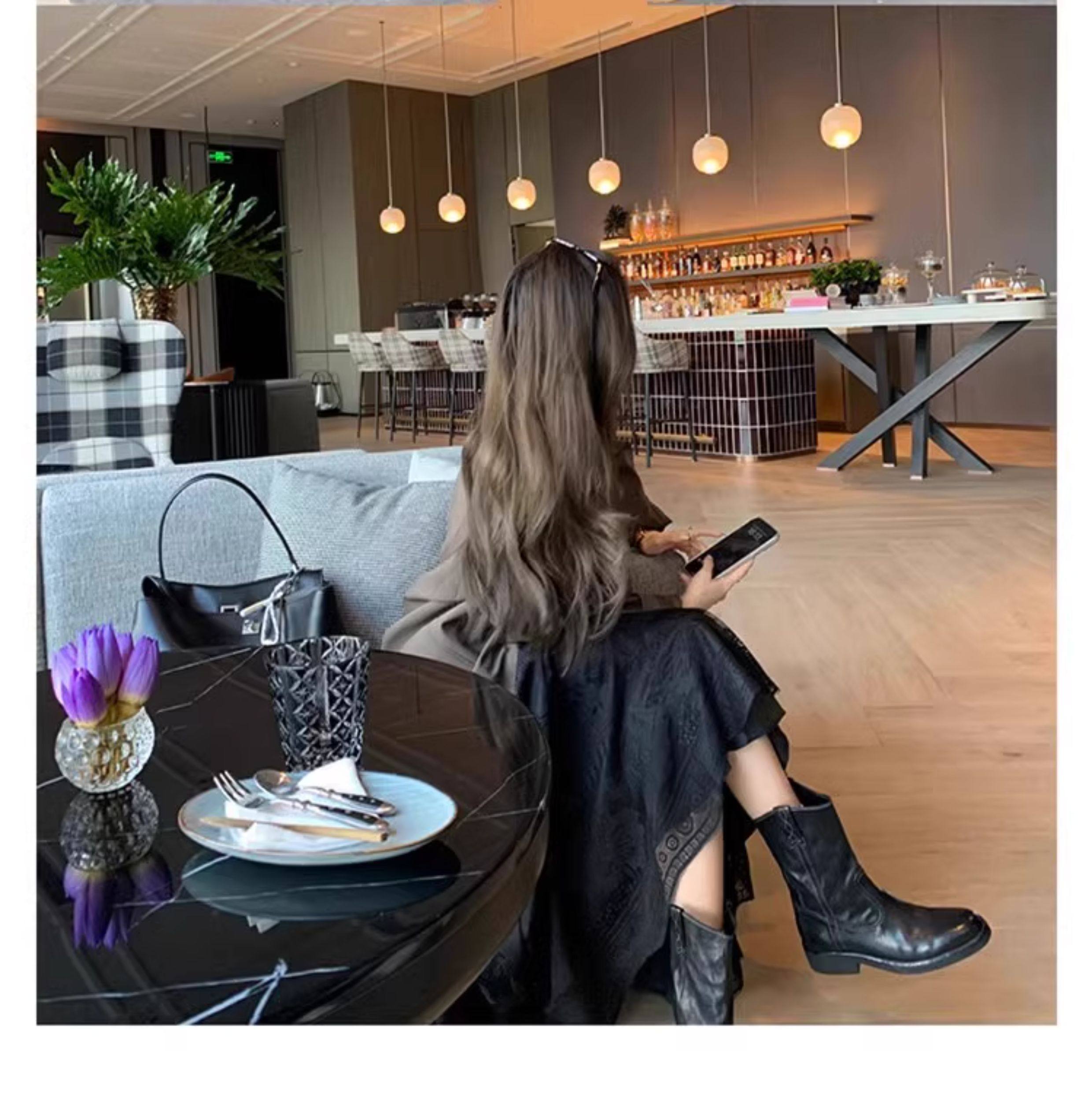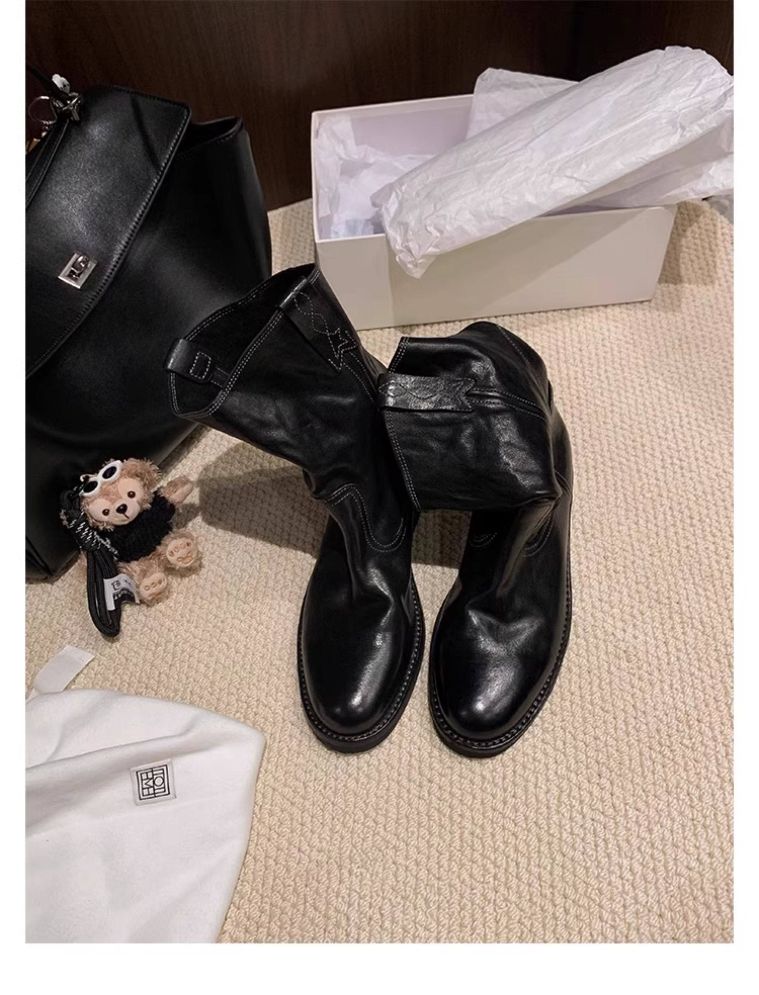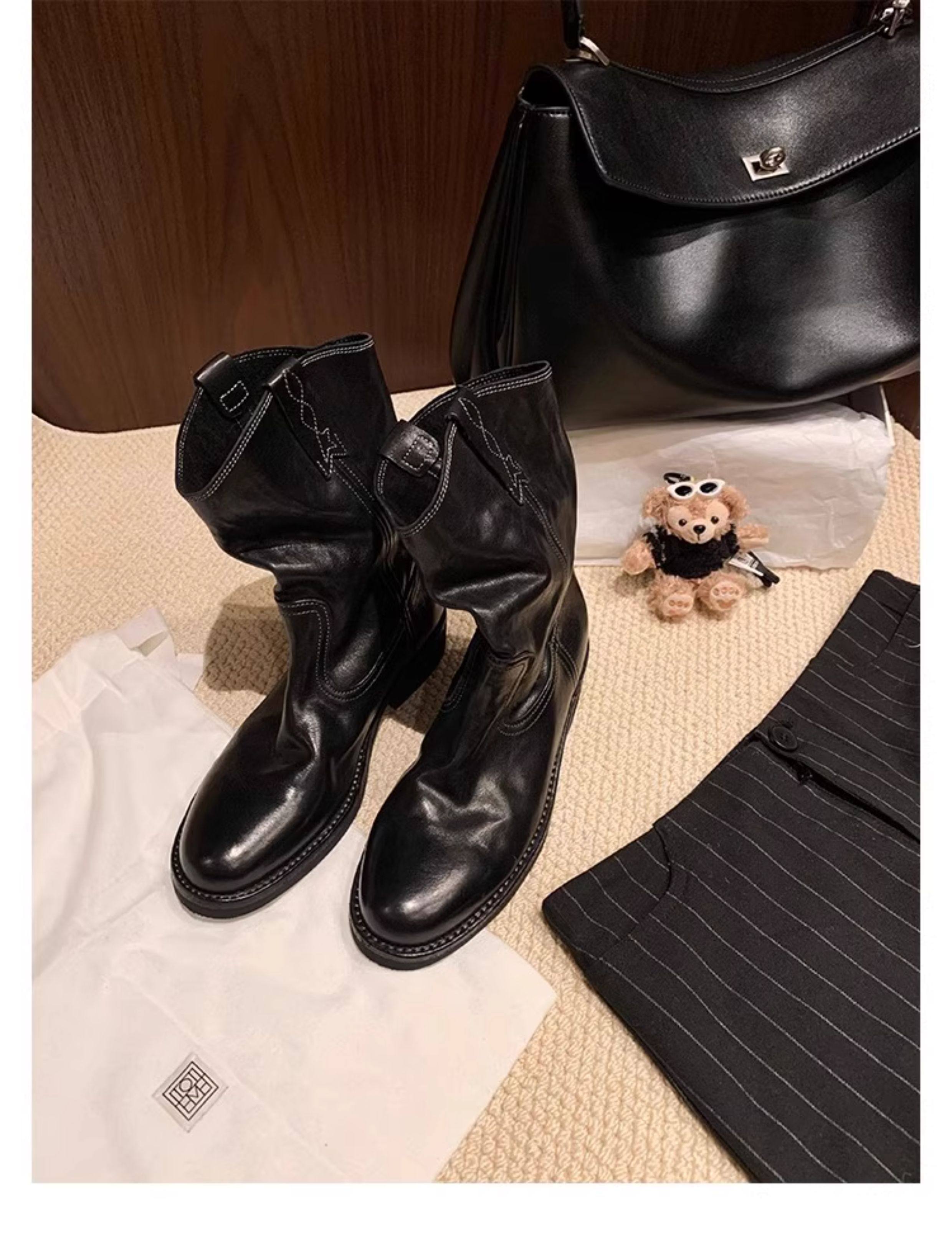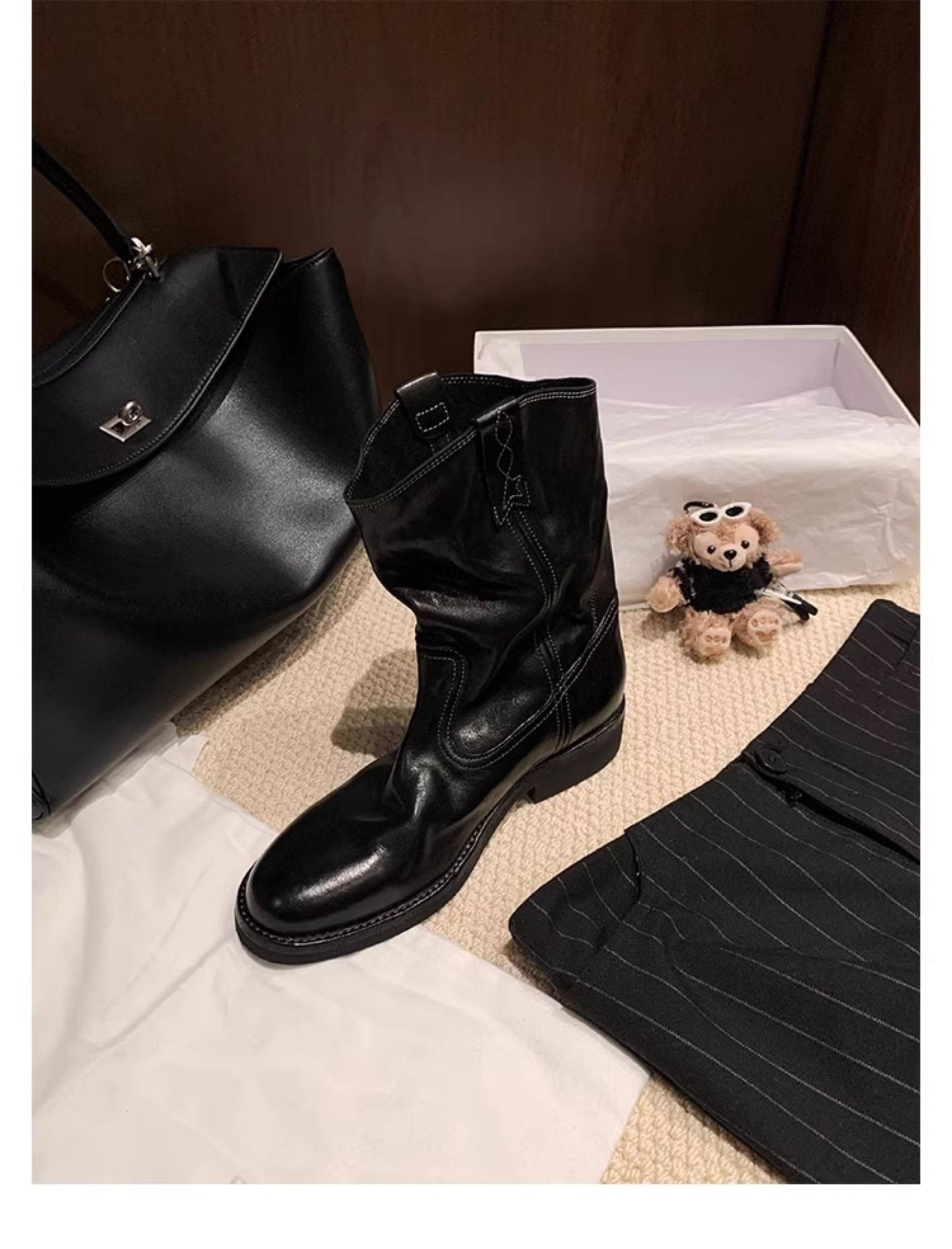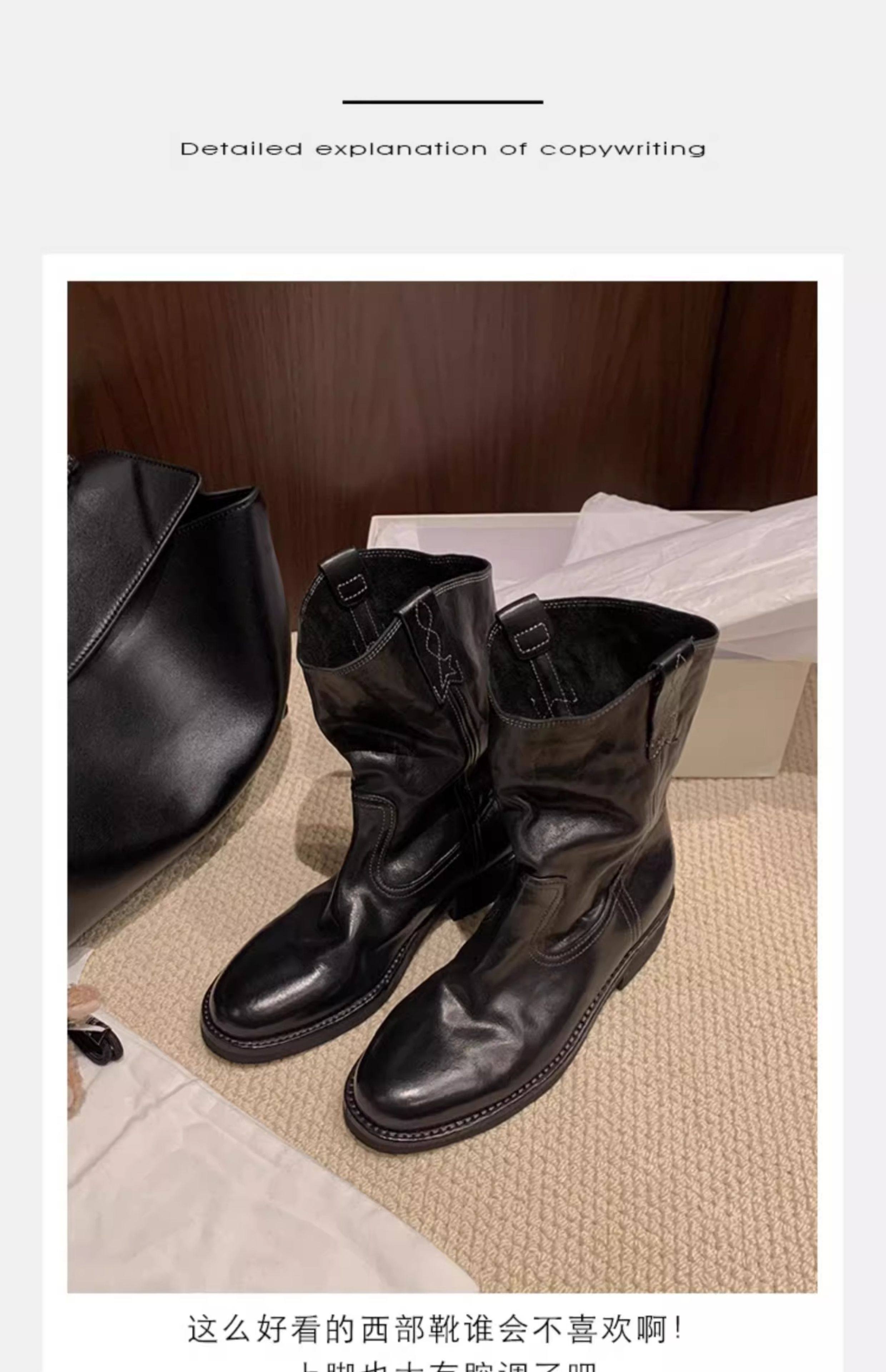 香港马皮真皮复古V口西部牛仔靴女粗跟短靴春秋新款中筒沙漠靴子