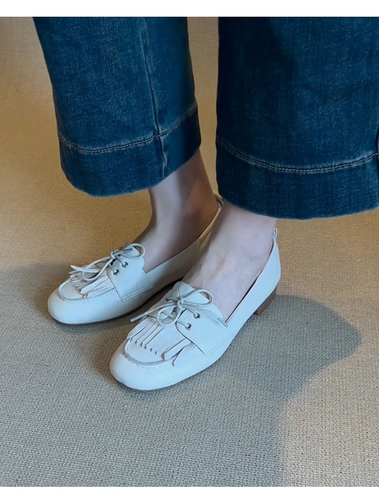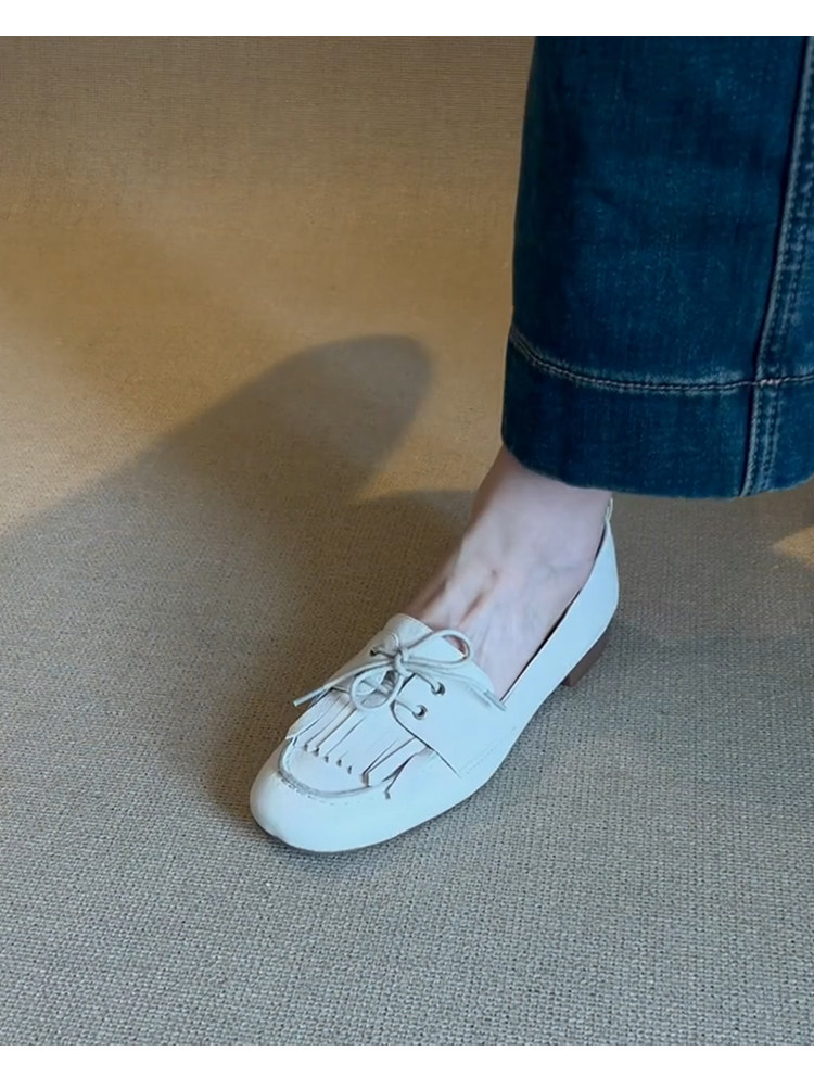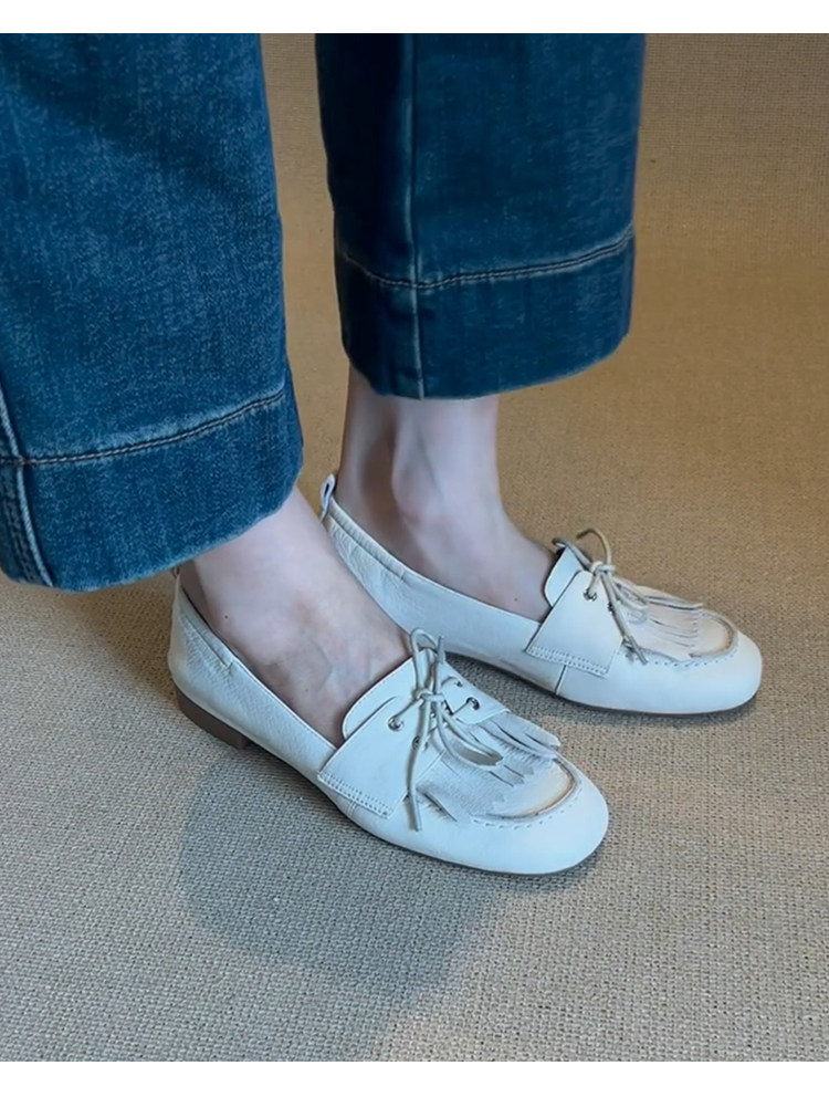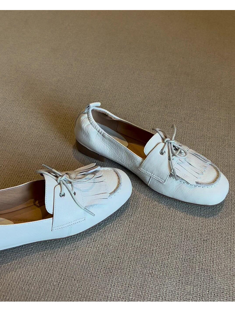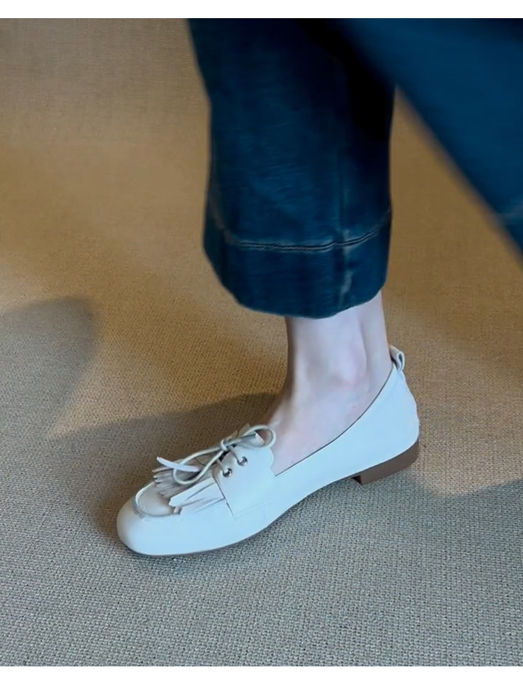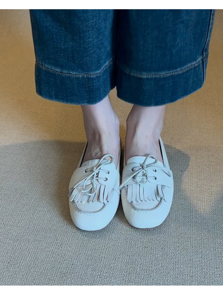 Лоферы женские из натуральной овчины, белые, в французском стиле, без застежек, с кисточками, на мягкой подошве, универсальные