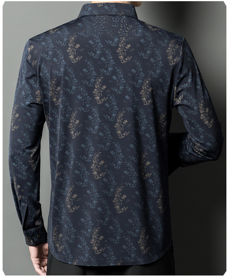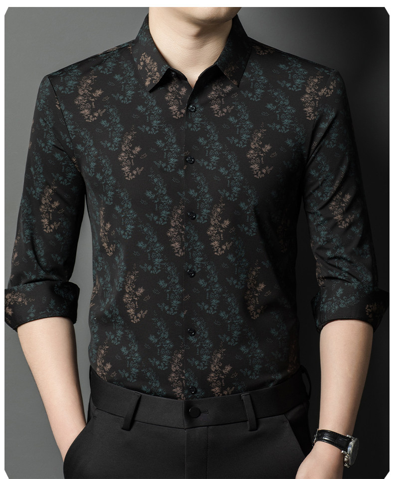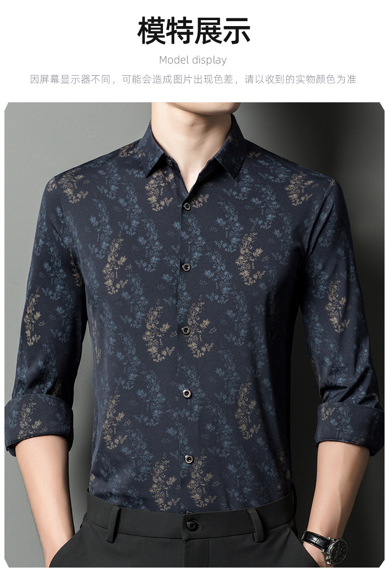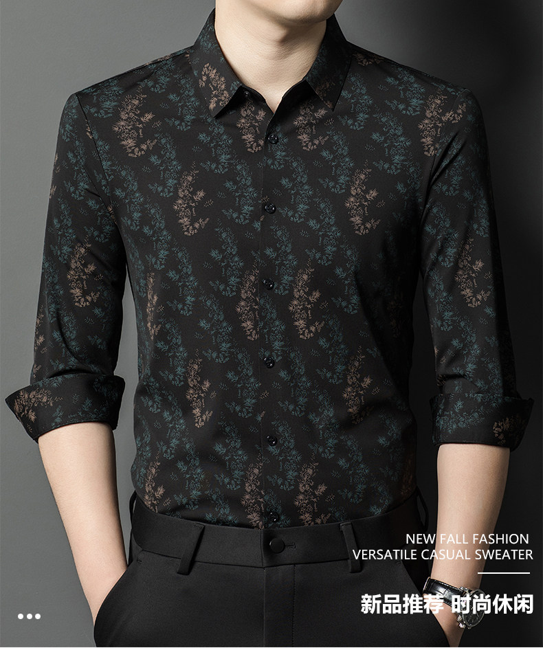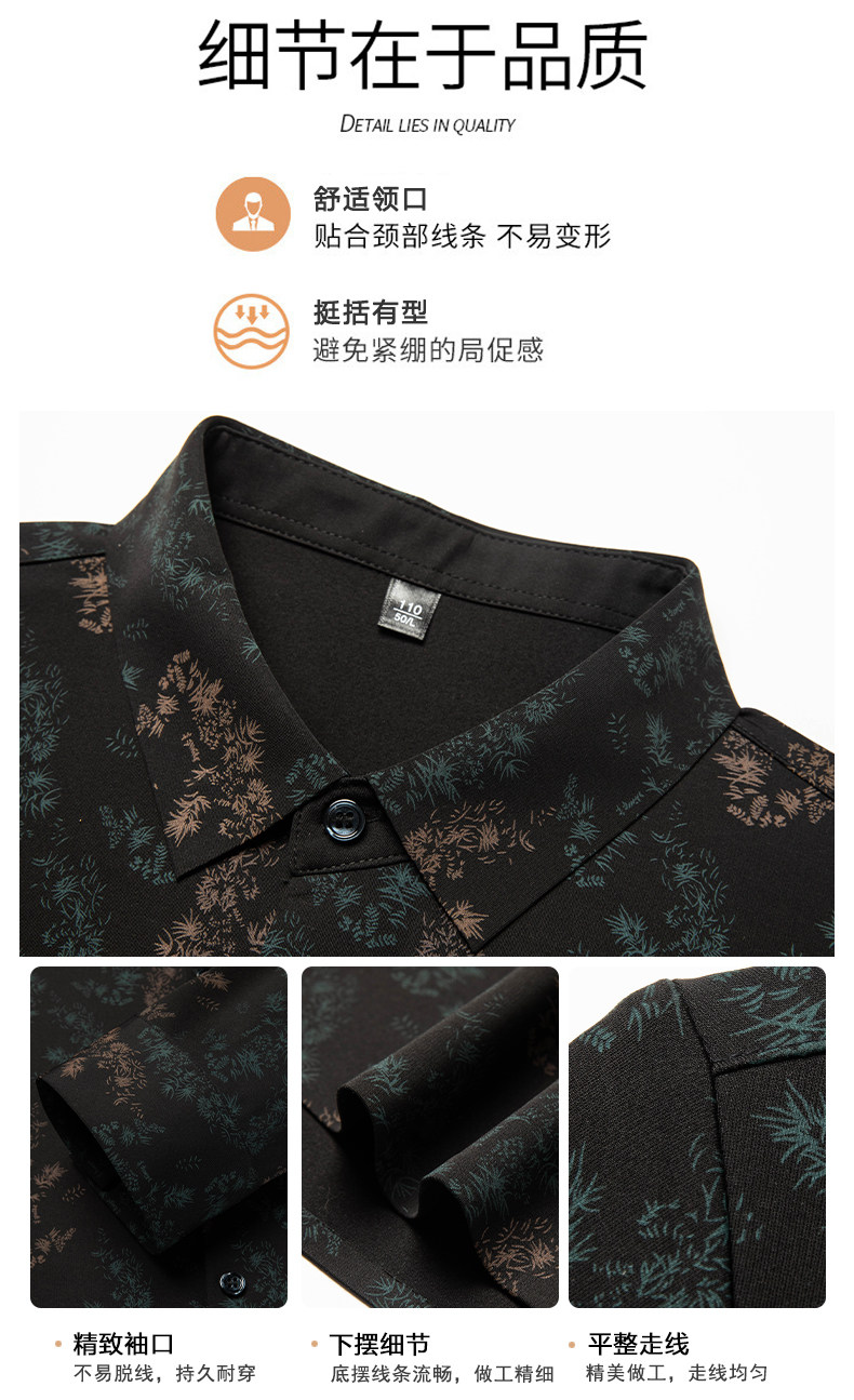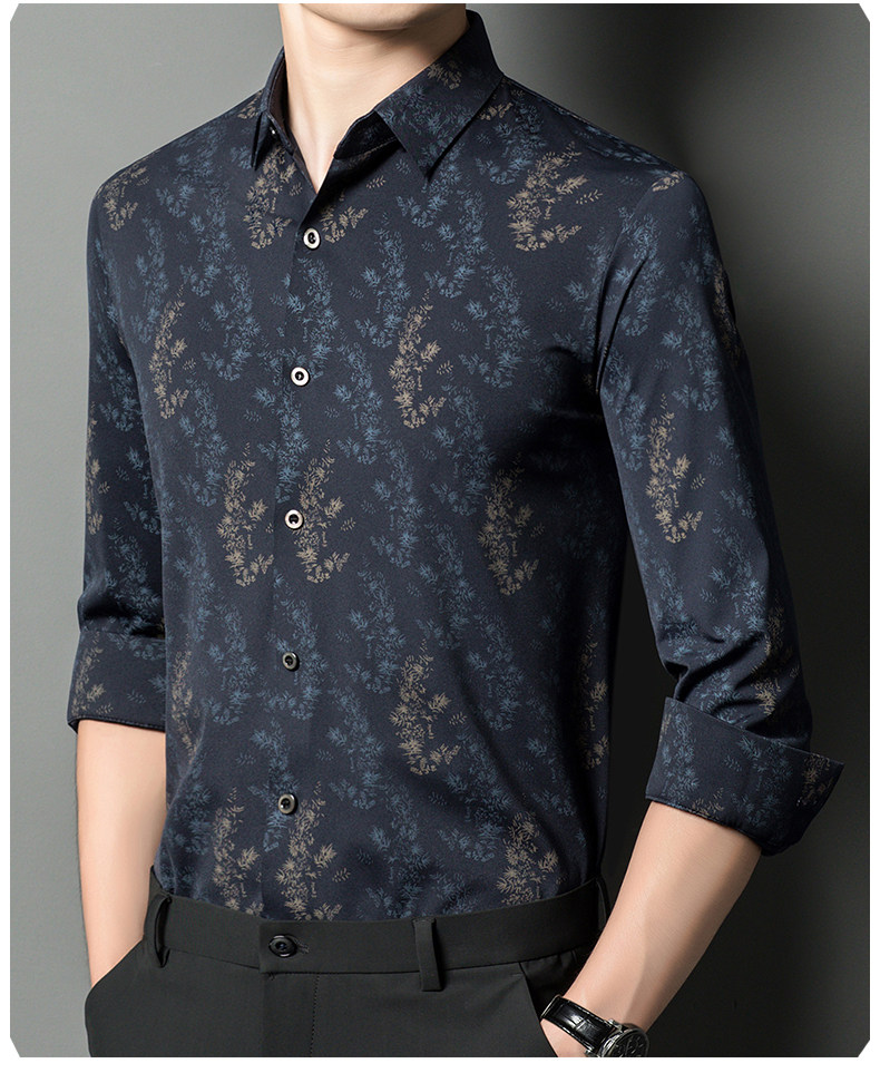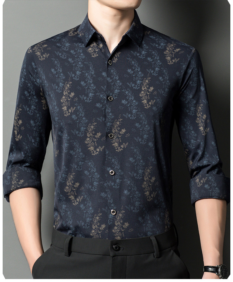 皮尔卡丹长袖衬衫春秋季新款中年时尚修身休闲免烫爸爸装印花衬衣