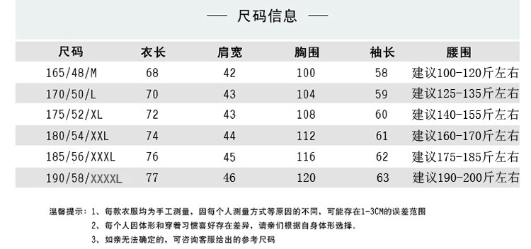 尺码 165/84A(建议100-120斤),170/88A(建议125-135斤),175/92A(建议140-155斤),180/96A(建议160-175斤),185/100A(建议180-190斤),190/104A(建议190-210斤)