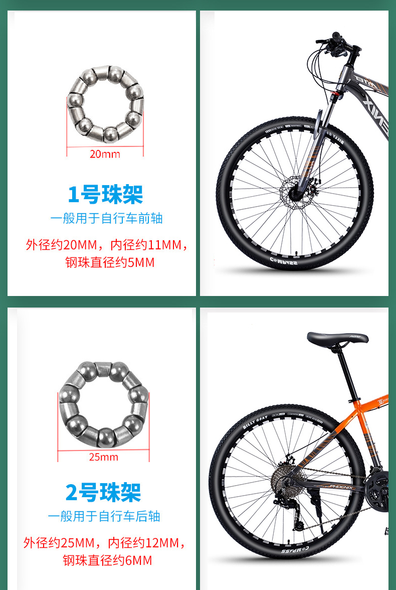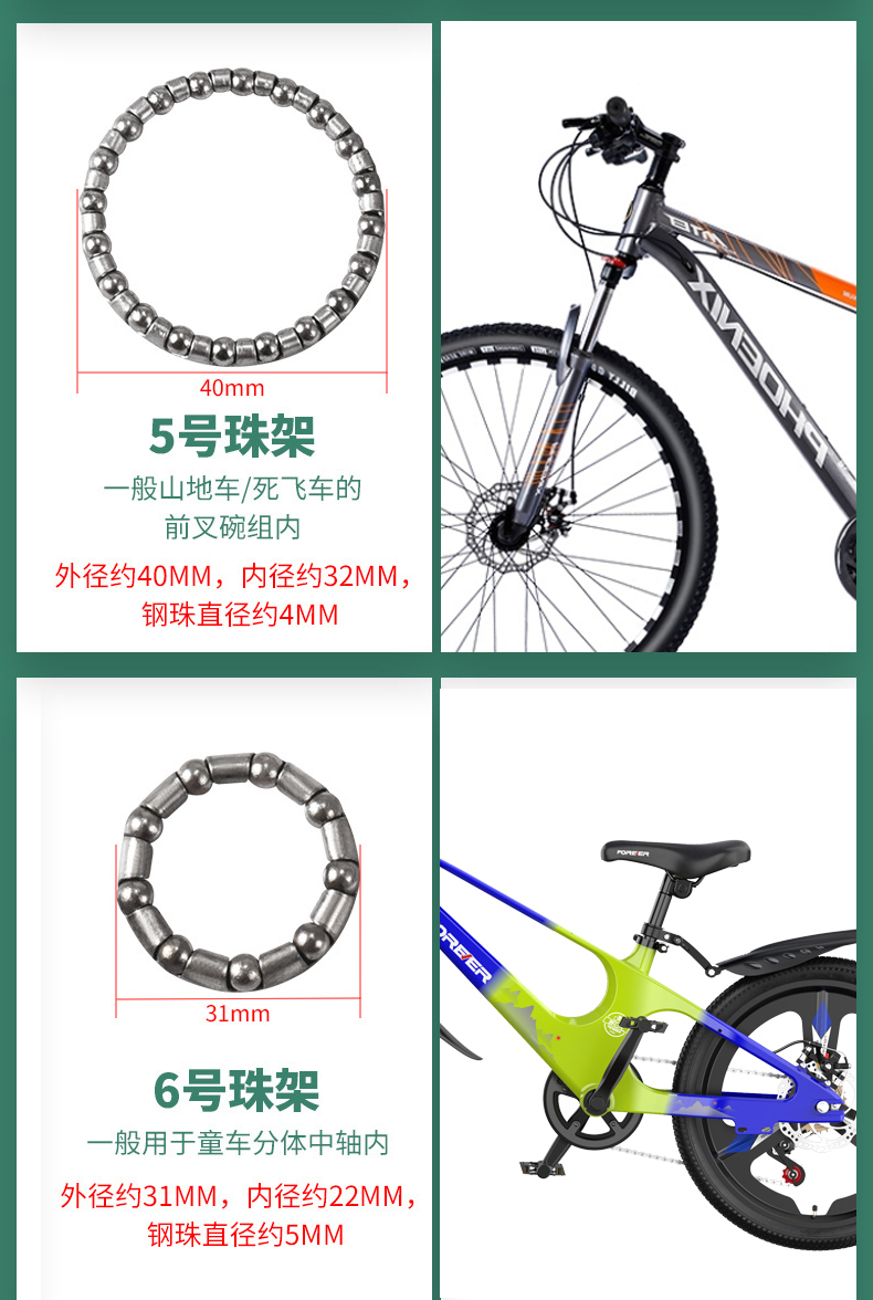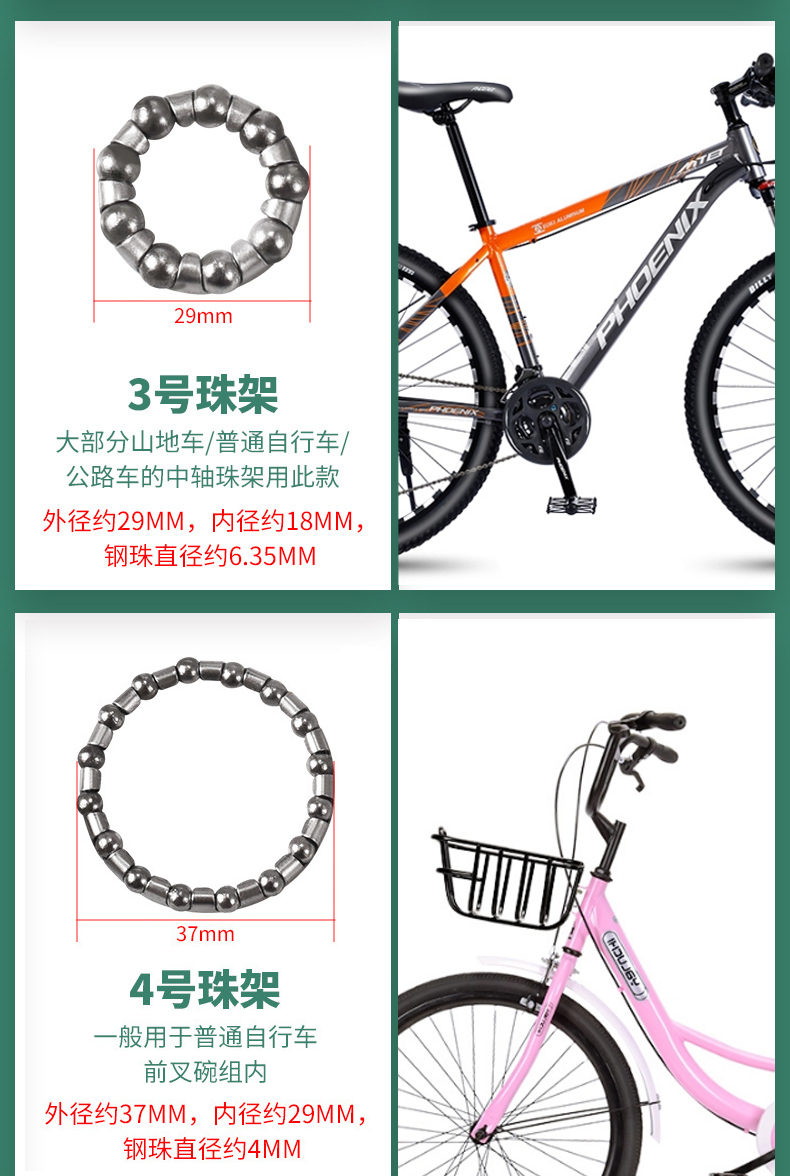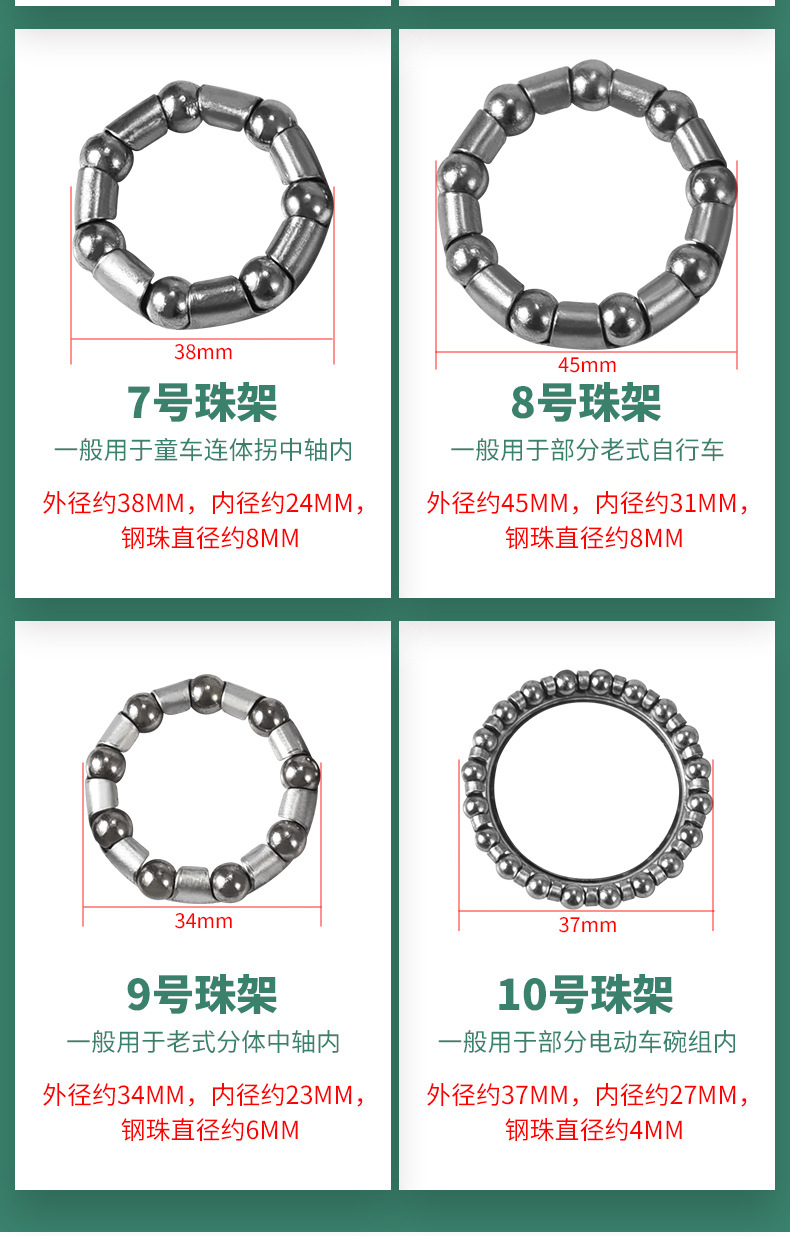 Классификация цветов № 1 — внешний диаметр 2 см [переднее колесо] 2 штуки + смазка,№ 2 — внешний диаметр 2,5 см [заднее колесо], 2 штуки + смазка,№ 3 - внешний диаметр 2,9 см [центральный вал] 2 штуки + масло,№ 4 — внешний диаметр 3,7 см [передняя вилка велосипеда] 2 штуки + смазка,№ 5 — внешний диаметр 4 см [передняя вилка для горного велосипеда] 2 штуки + смазка,№ 6 — внешний диаметр 3,1 см [нижний кронштейн для коляски] 2 штуки + масло,№ 7 — внешний диаметр 3,8 см [цельный кареточный узел для коляски] 2 штуки + масло,№ 8 — внешний диаметр 4,5 см [старомодный велосипед] 2 штуки + масло,№ 9 — внешний диаметр 3,4 см [старомодный разъемный кареточный узел] 2 штуки + смазка,№ 10 - внешний диаметр 3,7 см [передняя вилка для электромобиля] 2 штуки + смазка,№ 1 — внешний диаметр 2 см [переднее колесо] 4 штуки + 2 пакета масла,№ 2 — внешний диаметр 2,5 см [заднее колесо] 4 штуки + 2 пакета масла,№ 3 — внешний диаметр 2,9 см [центральный вал] 4 штуки + 2 пакета масла,№ 4 — внешний диаметр 3,7 см [передняя вилка велосипеда] 4 штуки + 2 пакета масла,№ 5 — внешний диаметр 4 см [передняя вилка для горного велосипеда] 4 штуки + 2 упаковки масла,№ 6 — внешний диаметр 3,1 см [нижний кронштейн для коляски] 4 штуки + 2 пакета масла,№ 7 — внешний диаметр 3,8 см [цельный кареточный узел для коляски] 4 штуки + 2 пакета масла,№ 8 — внешний диаметр 4,5 см [старомодный велосипед] 4 штуки + 2 пакета масла,№ 9 — внешний диаметр 3,4 см [старомодный разъемный кареточный узел] 4 штуки + 2 пакета масла,№ 10 - внешний диаметр 3,7 см [передняя вилка для электромобиля] 4 штуки + 2 упаковки масла