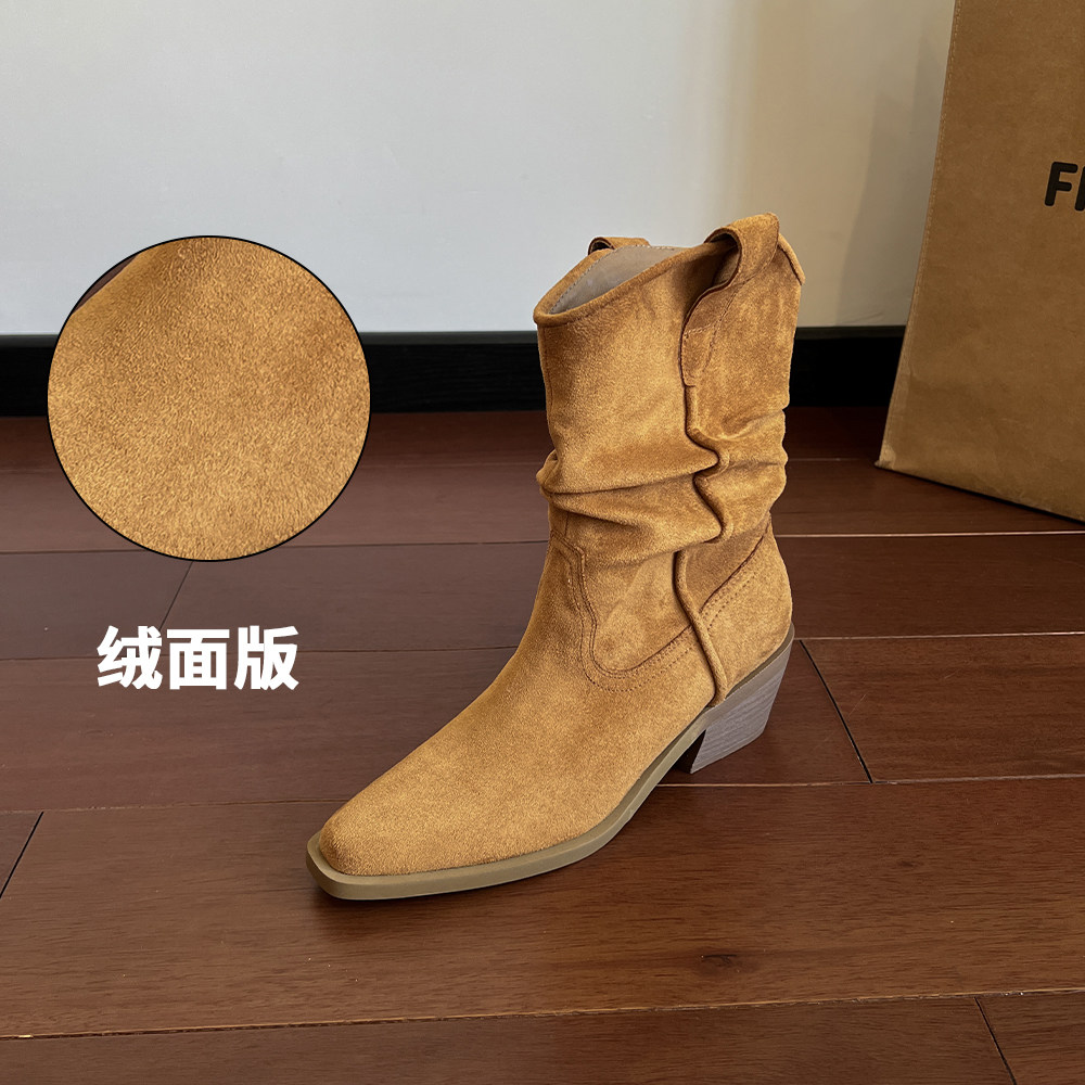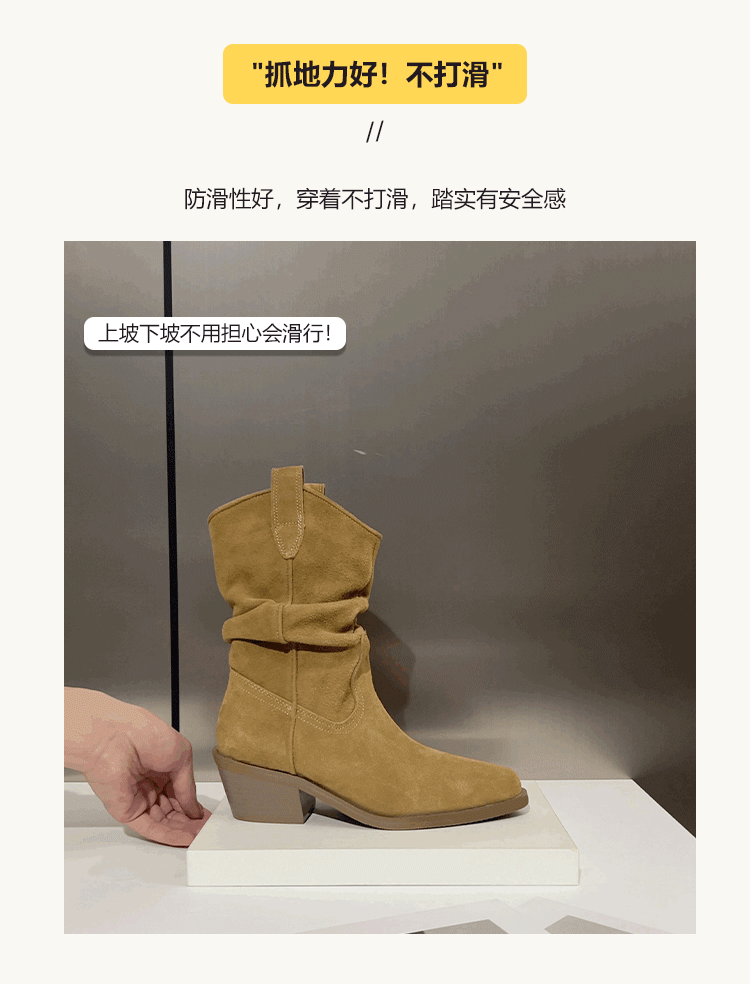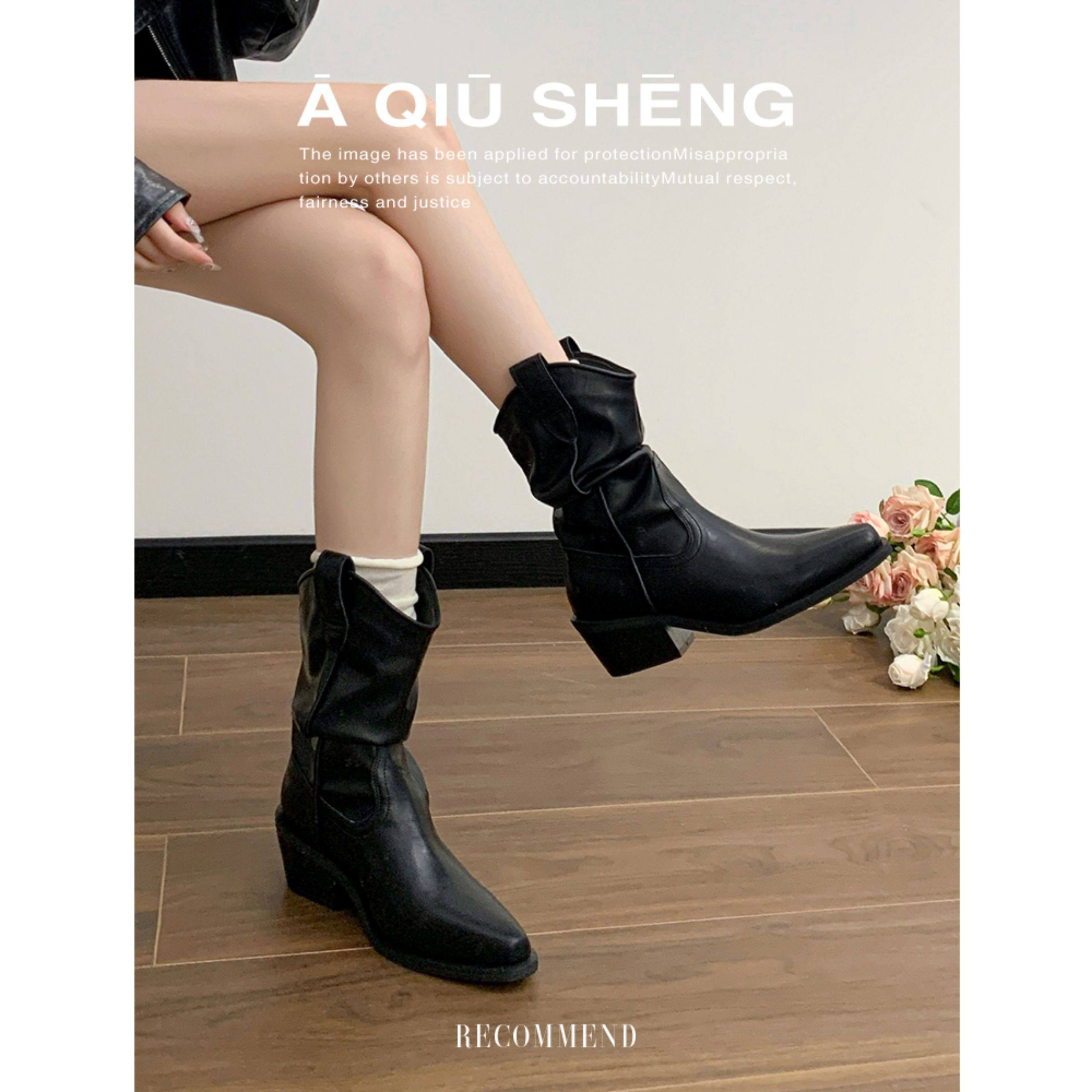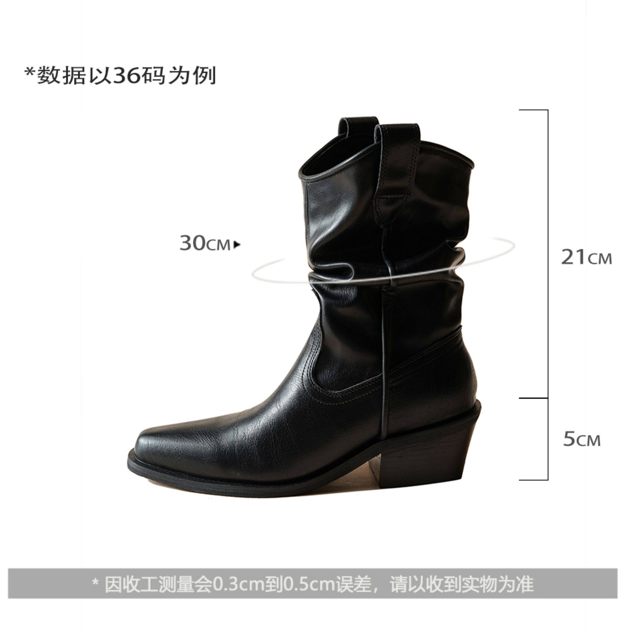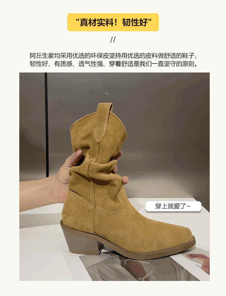 牛皮~赵露思褶皱真皮马丁靴粗跟短靴尖头高跟西部靴子显瘦堆堆靴