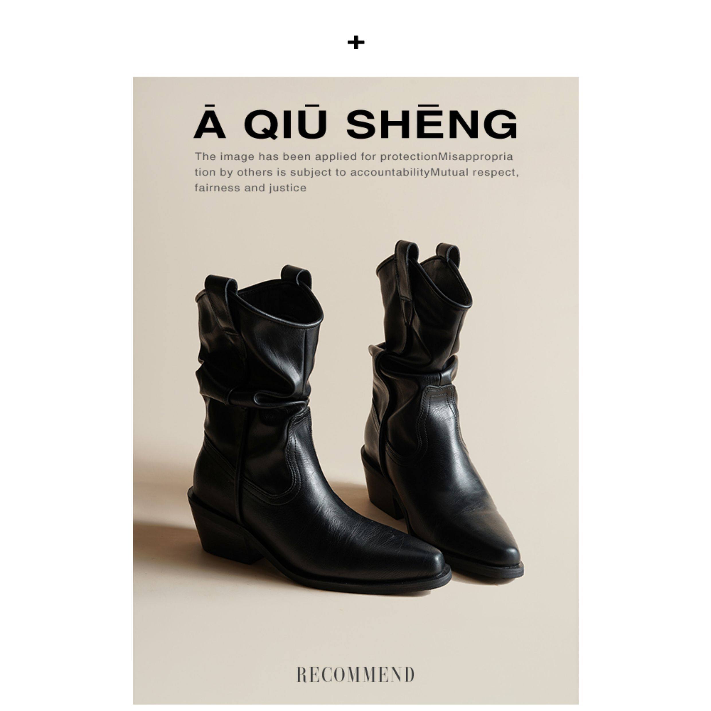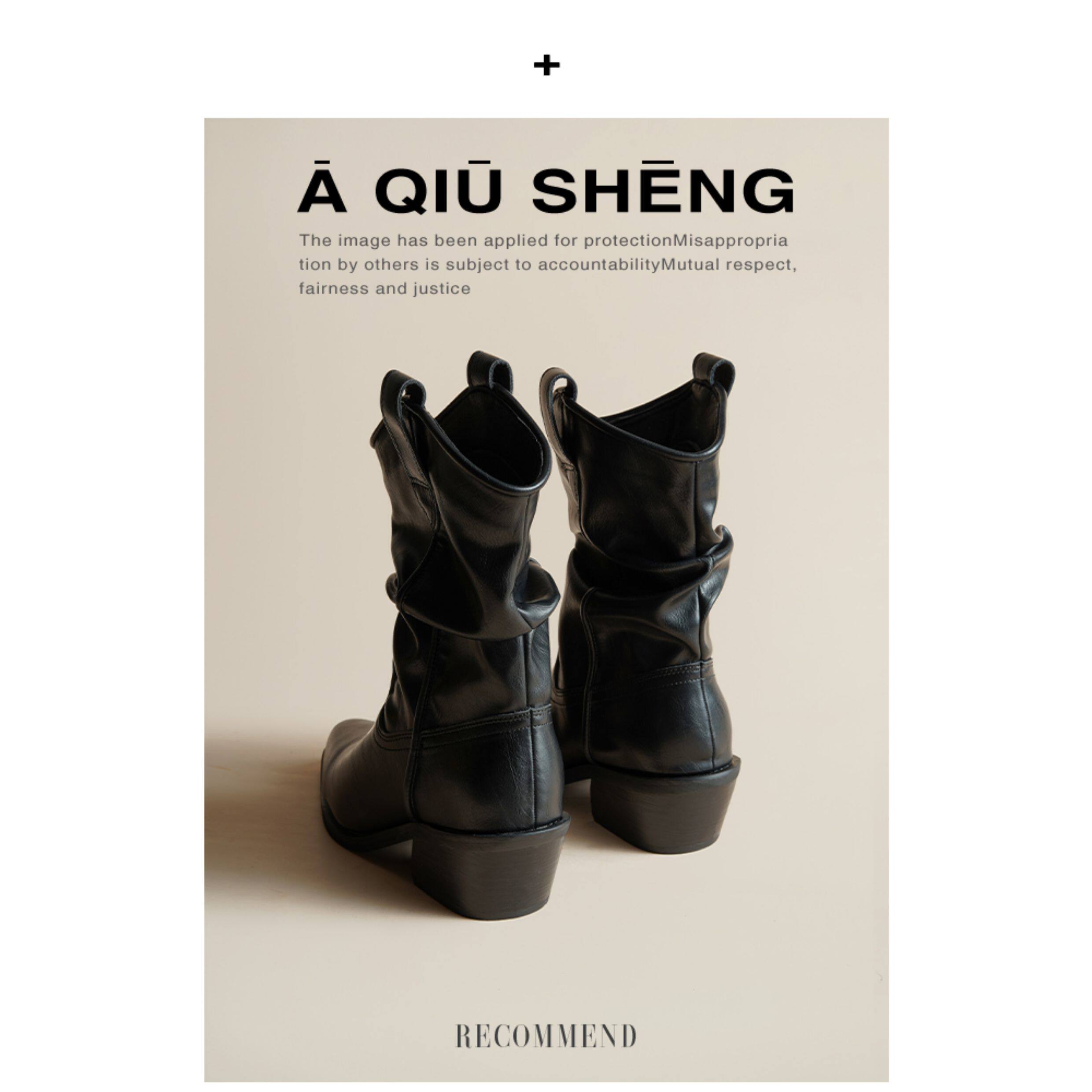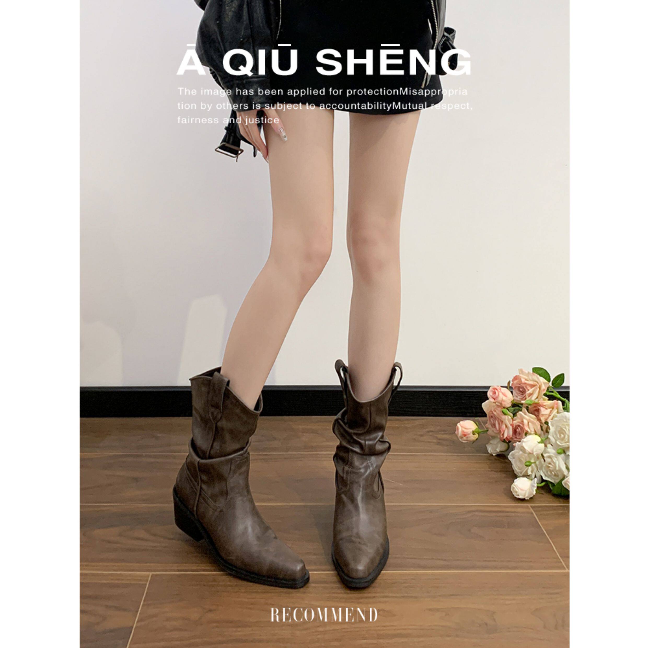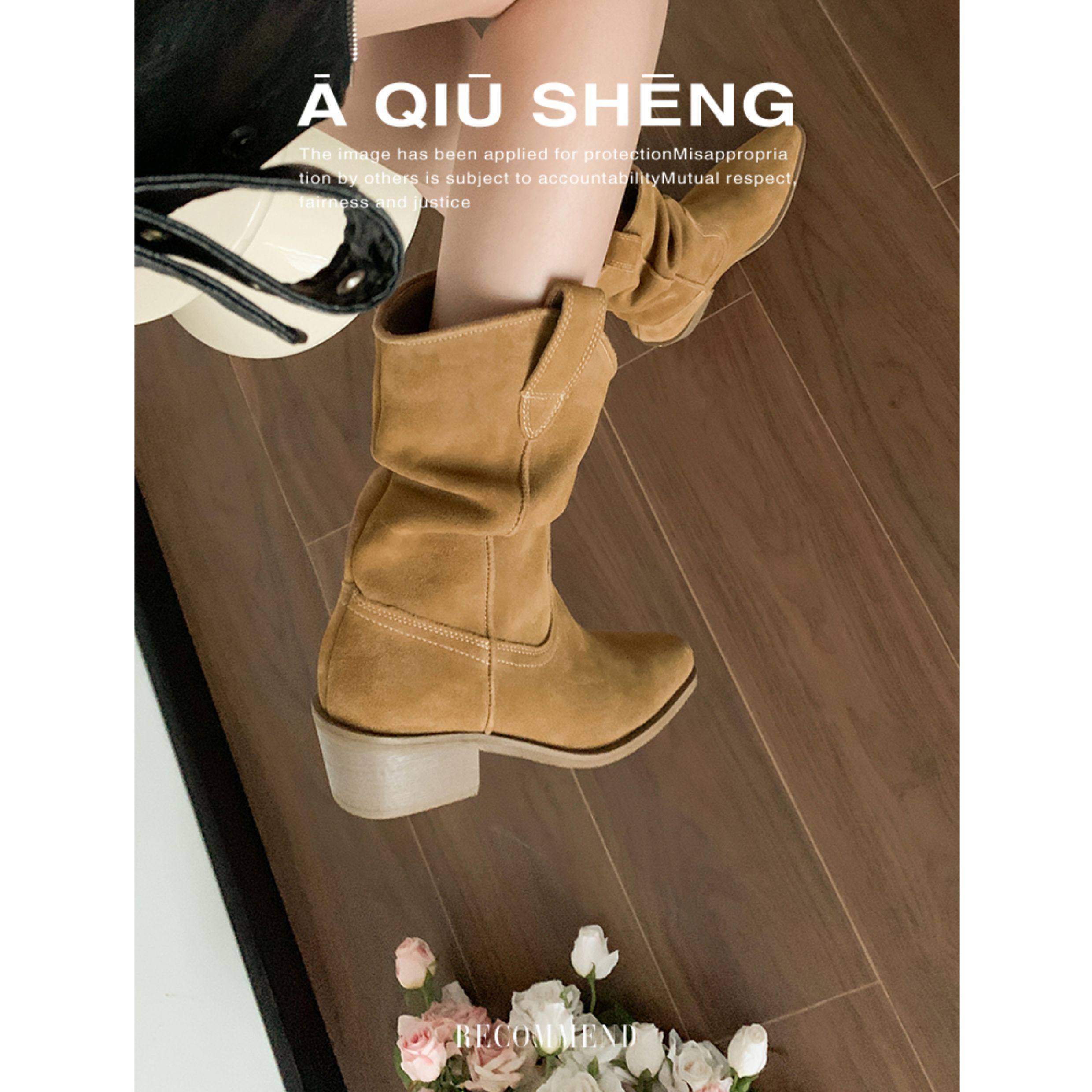 牛皮~赵露思褶皱真皮马丁靴粗跟短靴尖头高跟西部靴子显瘦堆堆靴