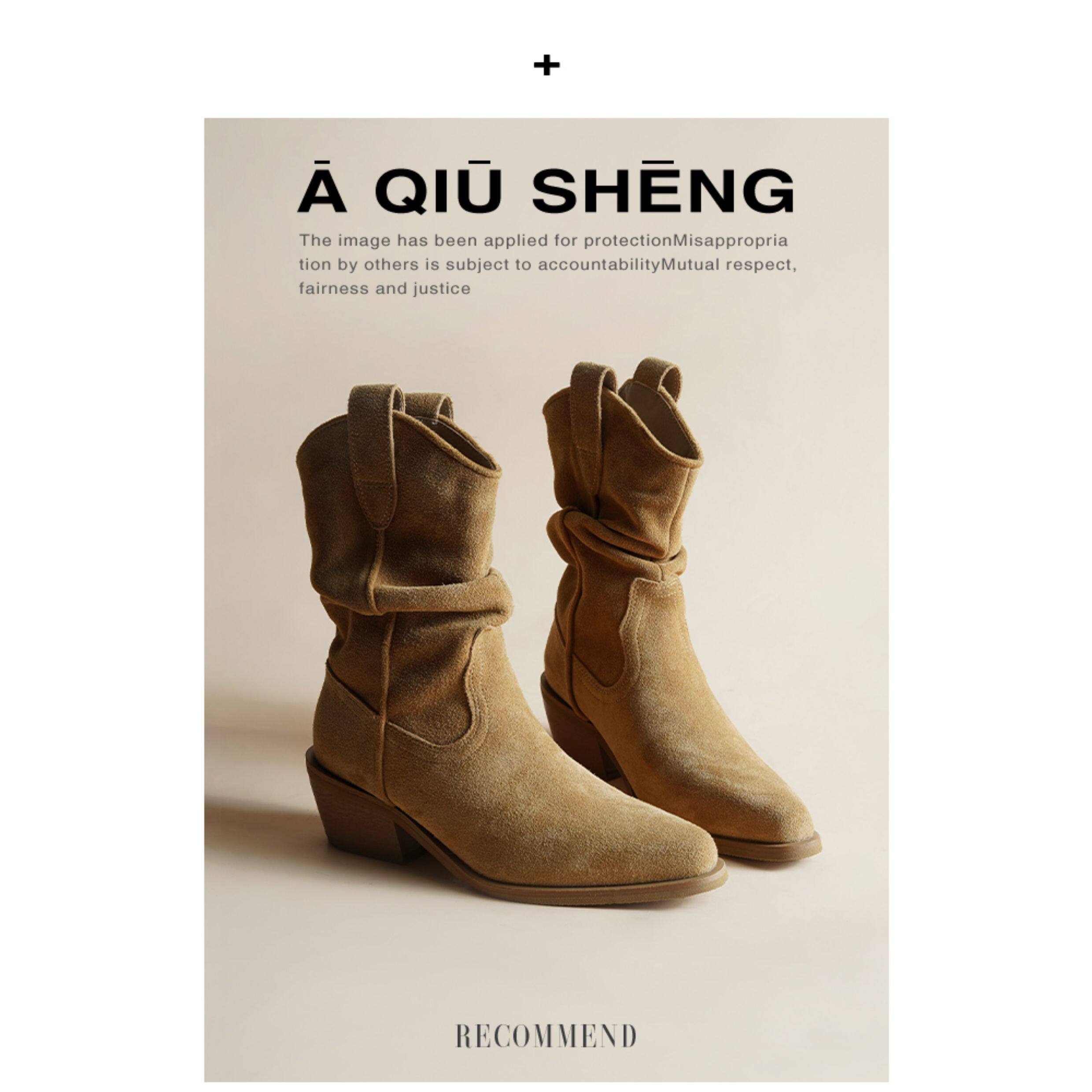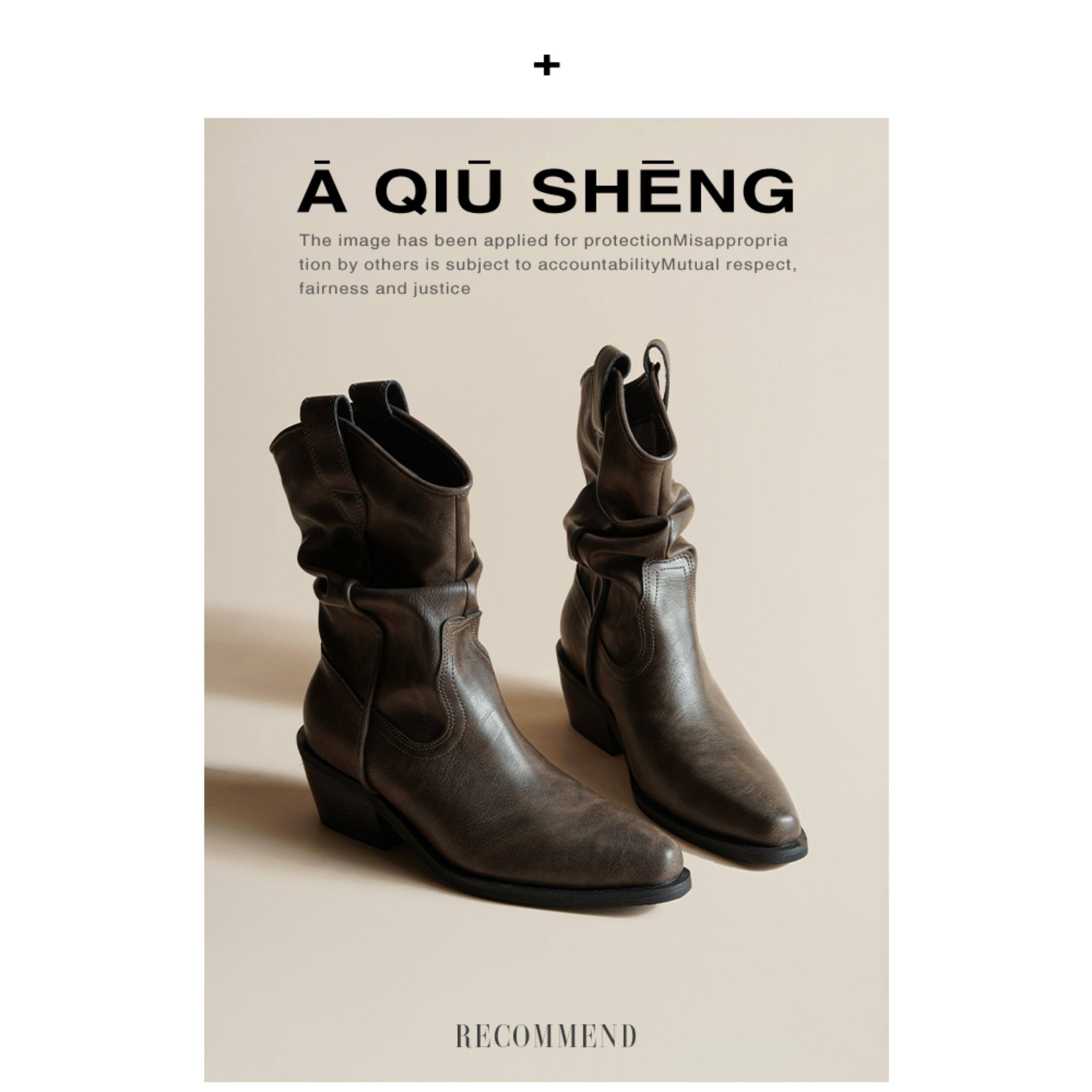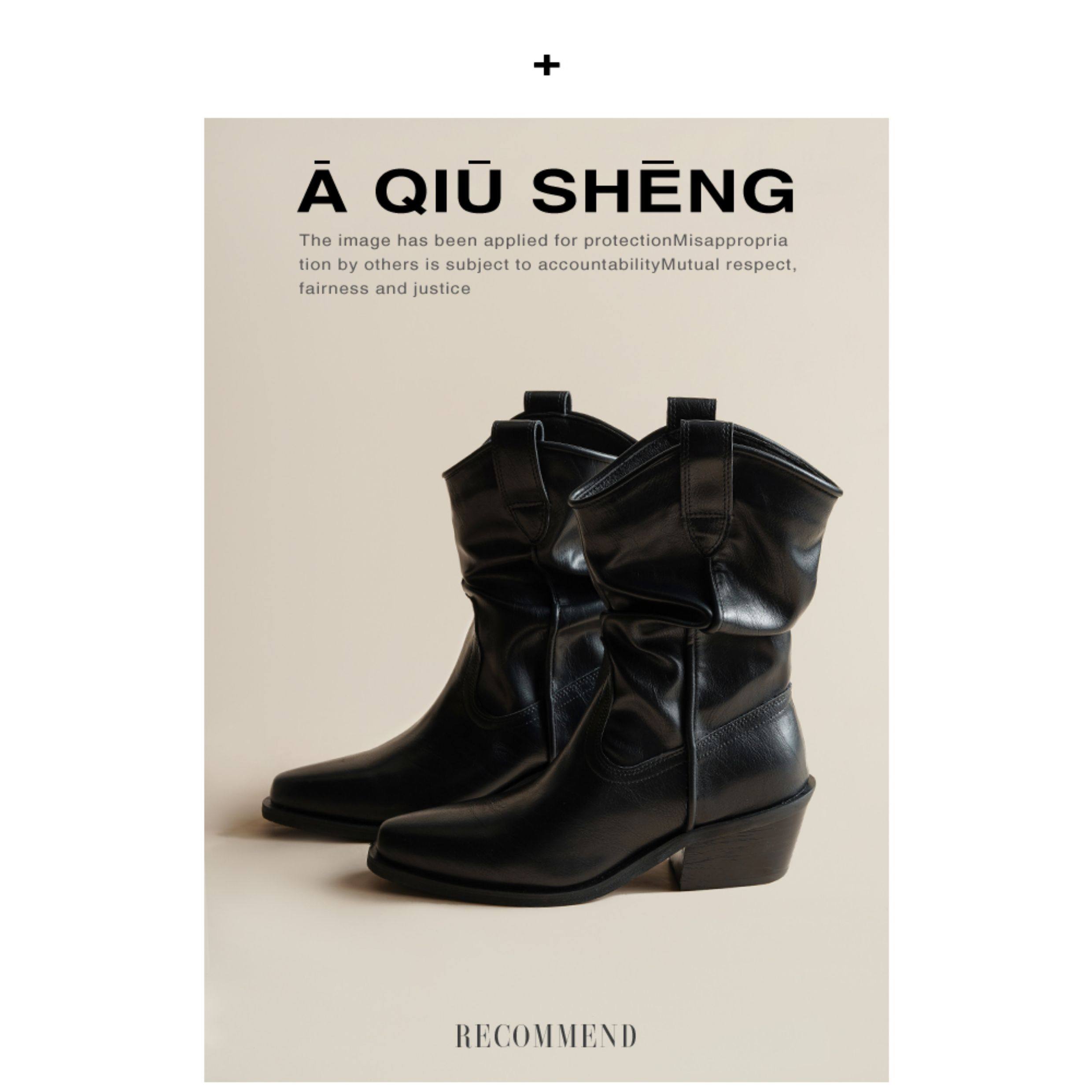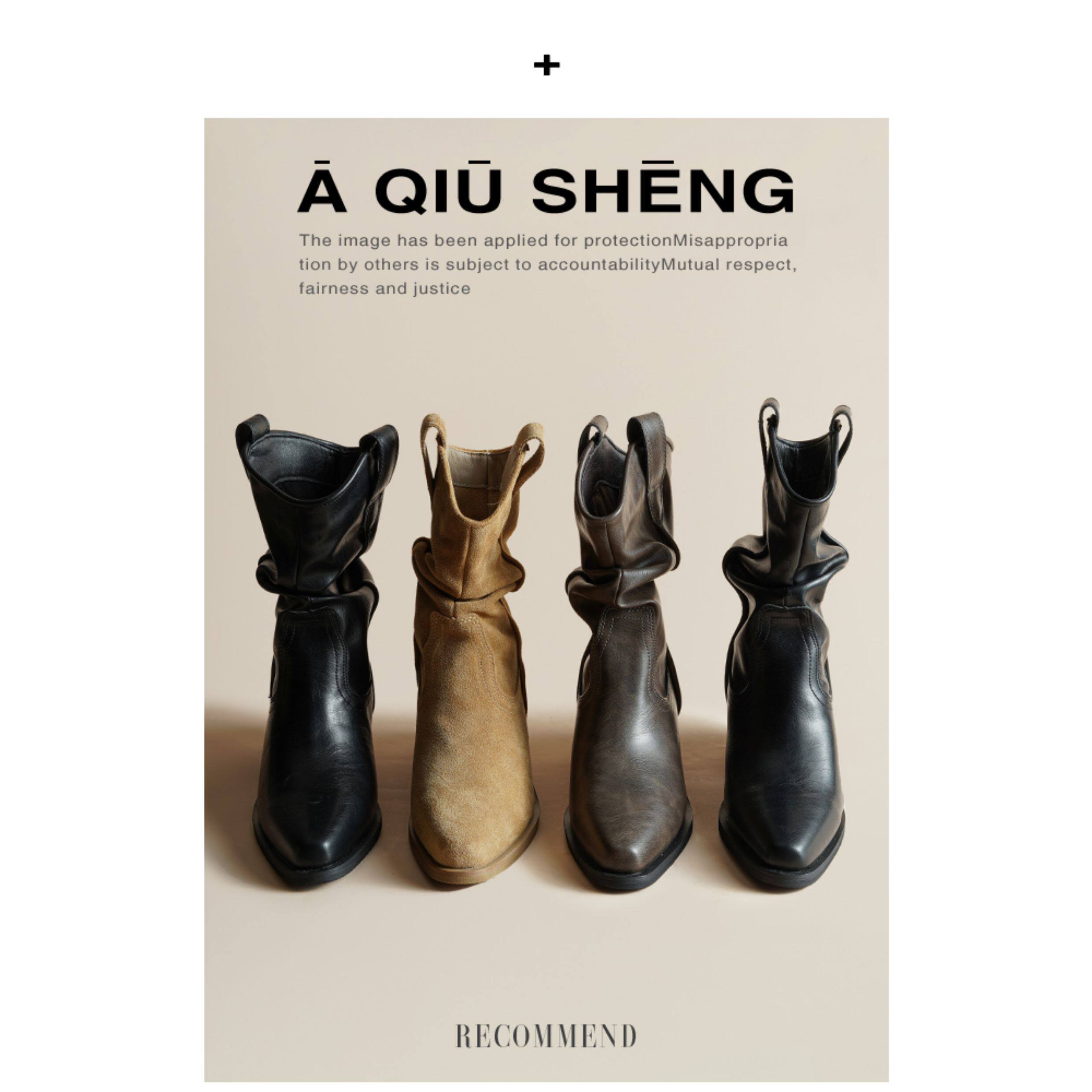 牛皮~赵露思褶皱真皮马丁靴粗跟短靴尖头高跟西部靴子显瘦堆堆靴