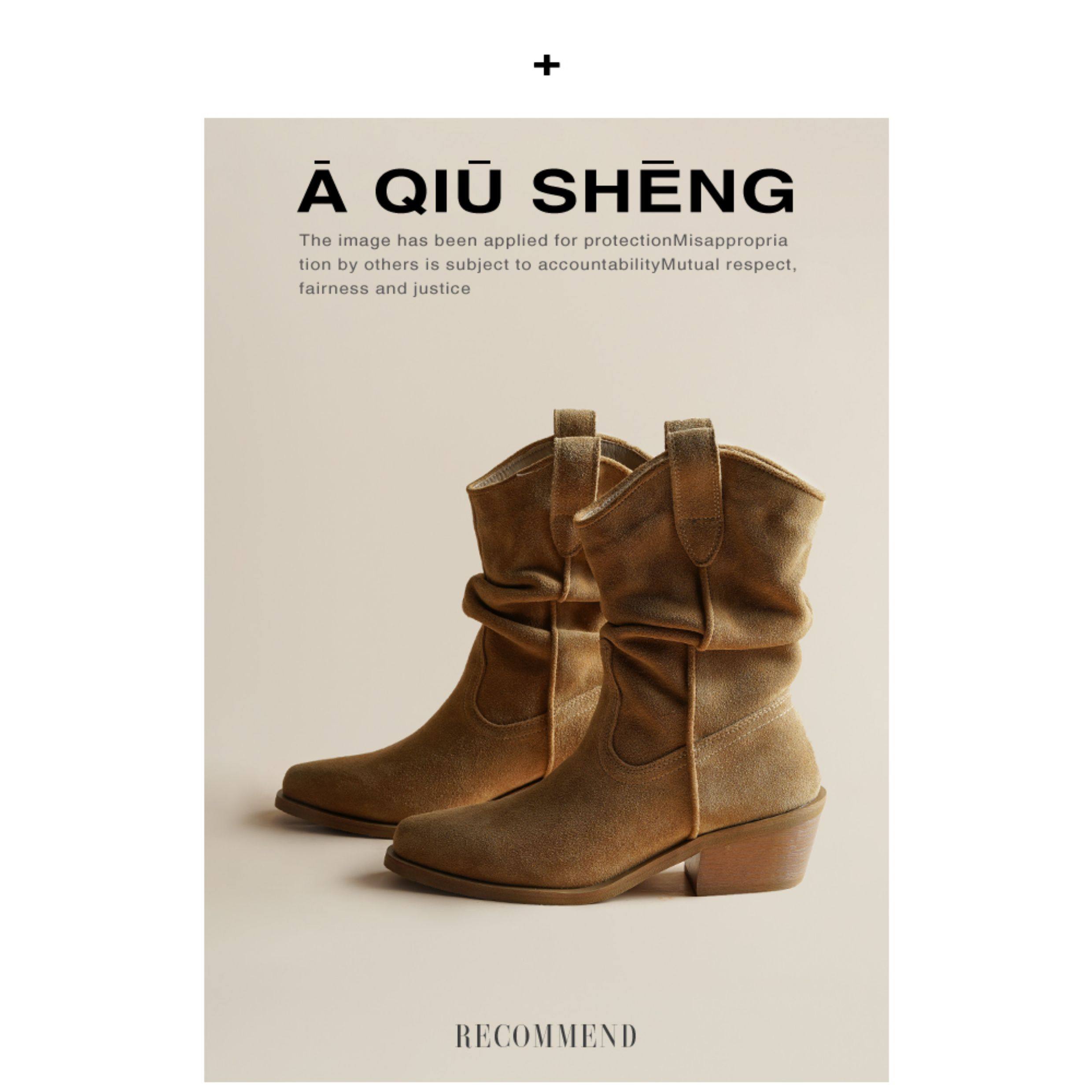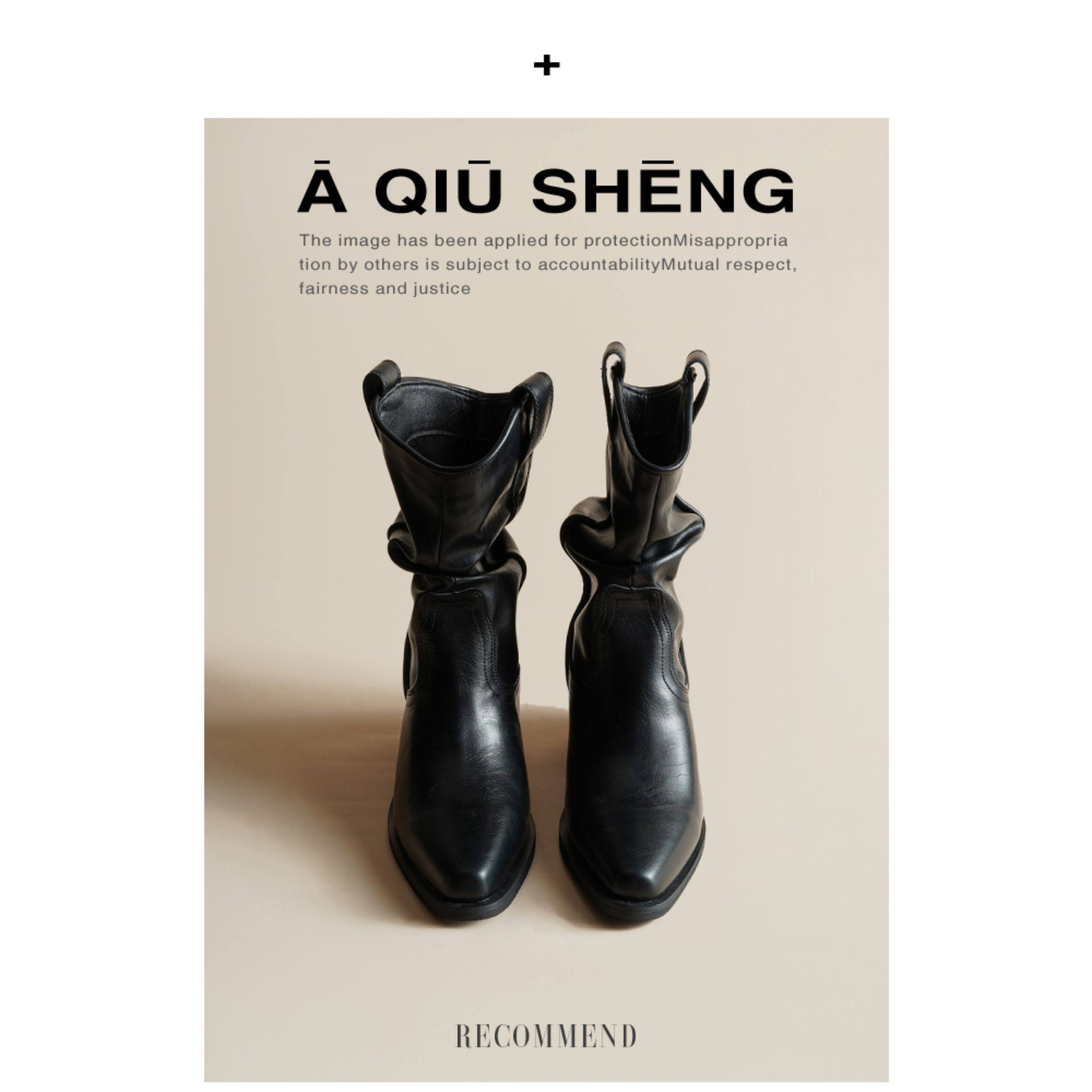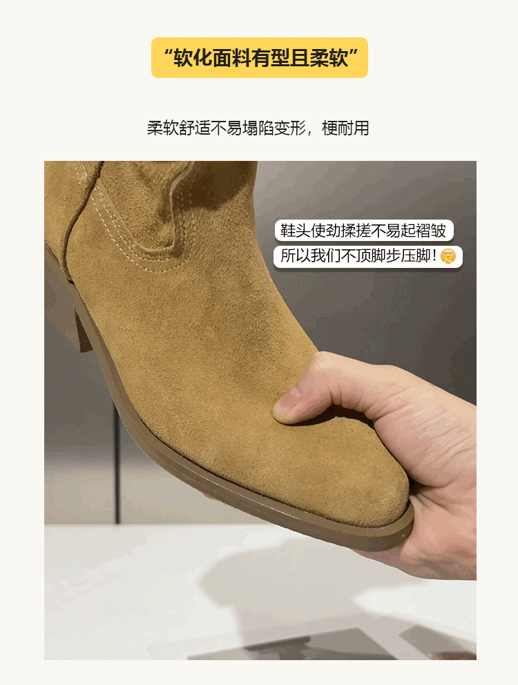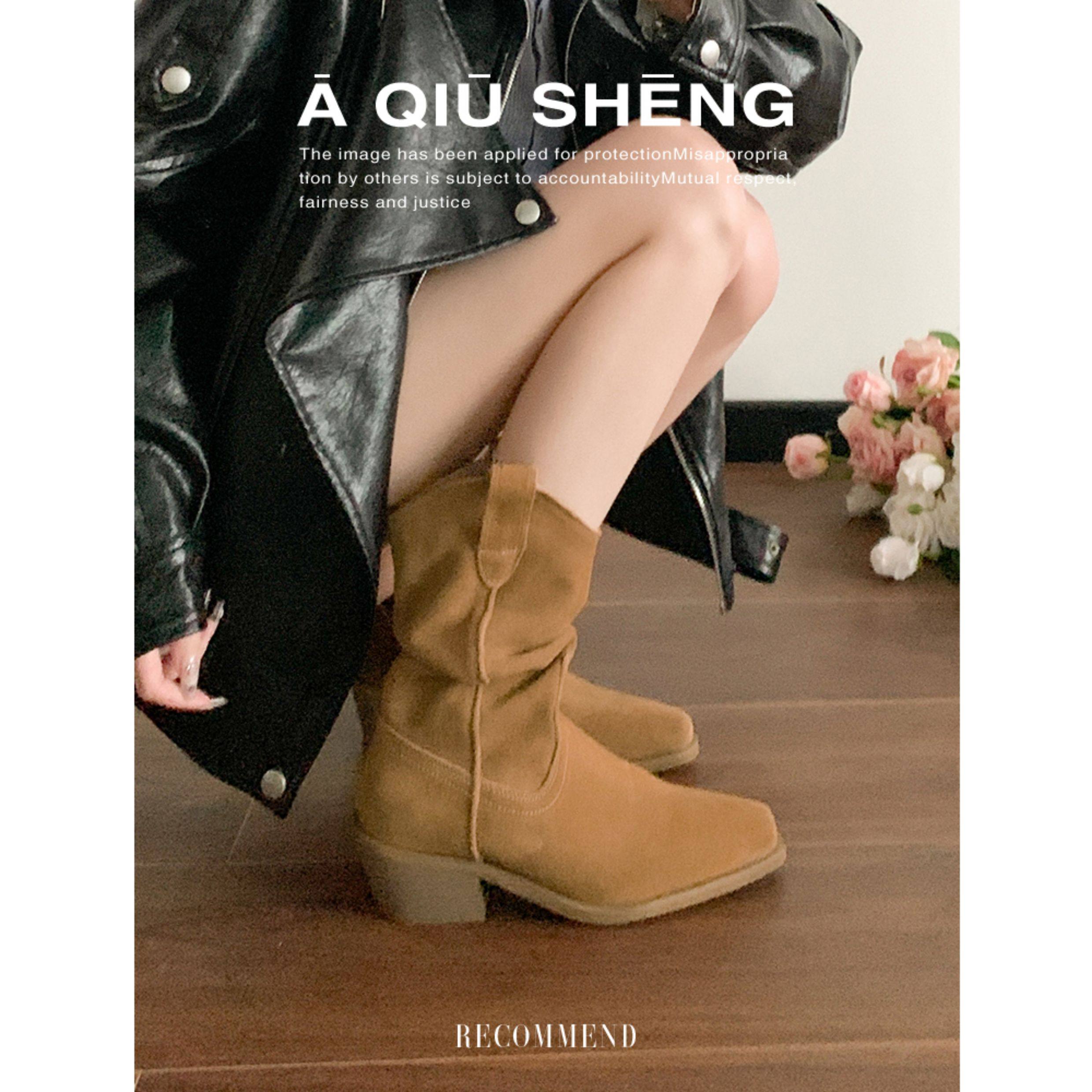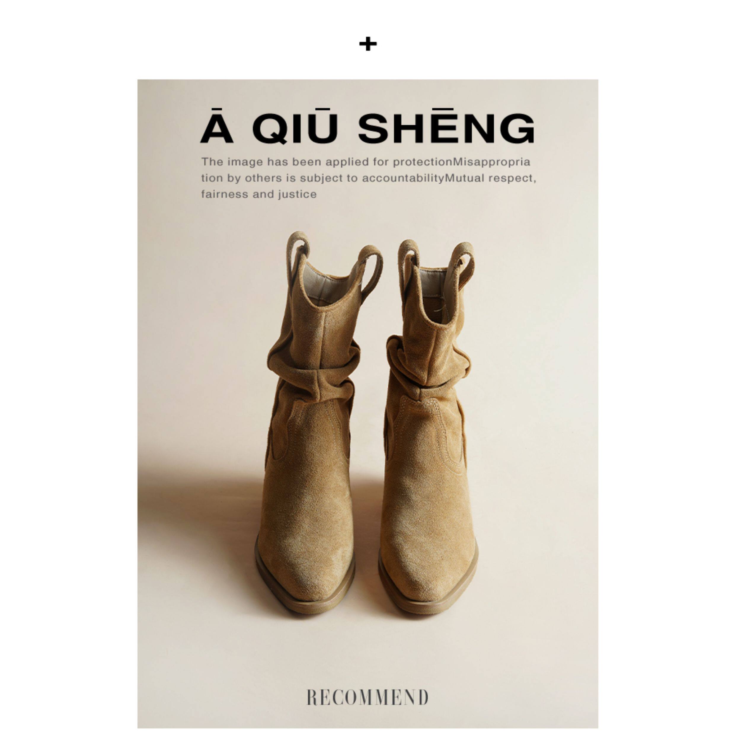 牛皮~赵露思褶皱真皮马丁靴粗跟短靴尖头高跟西部靴子显瘦堆堆靴