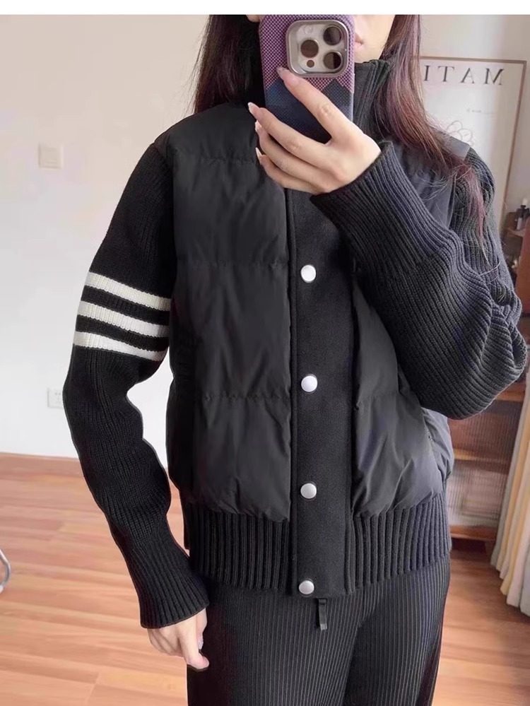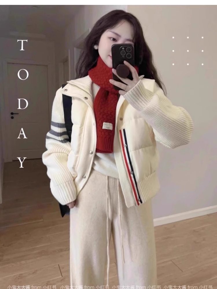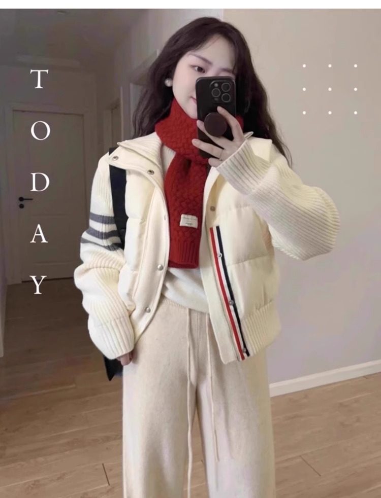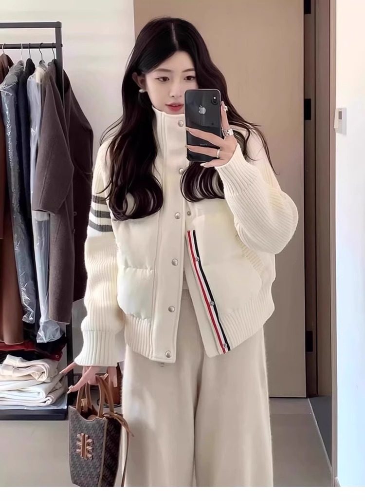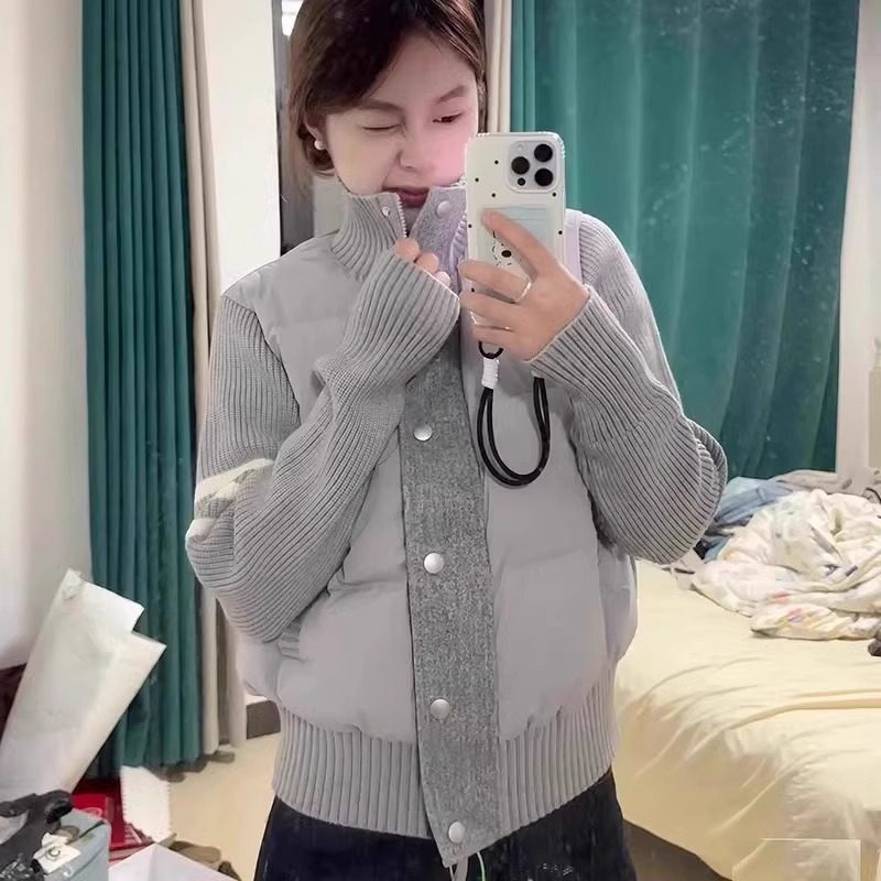 French Rouje Moaks Lightweight down Jacket for Women, Short Style, Patchwork Knit Sweater, Stand Collar Coat, Trendy Puffer Jacket
