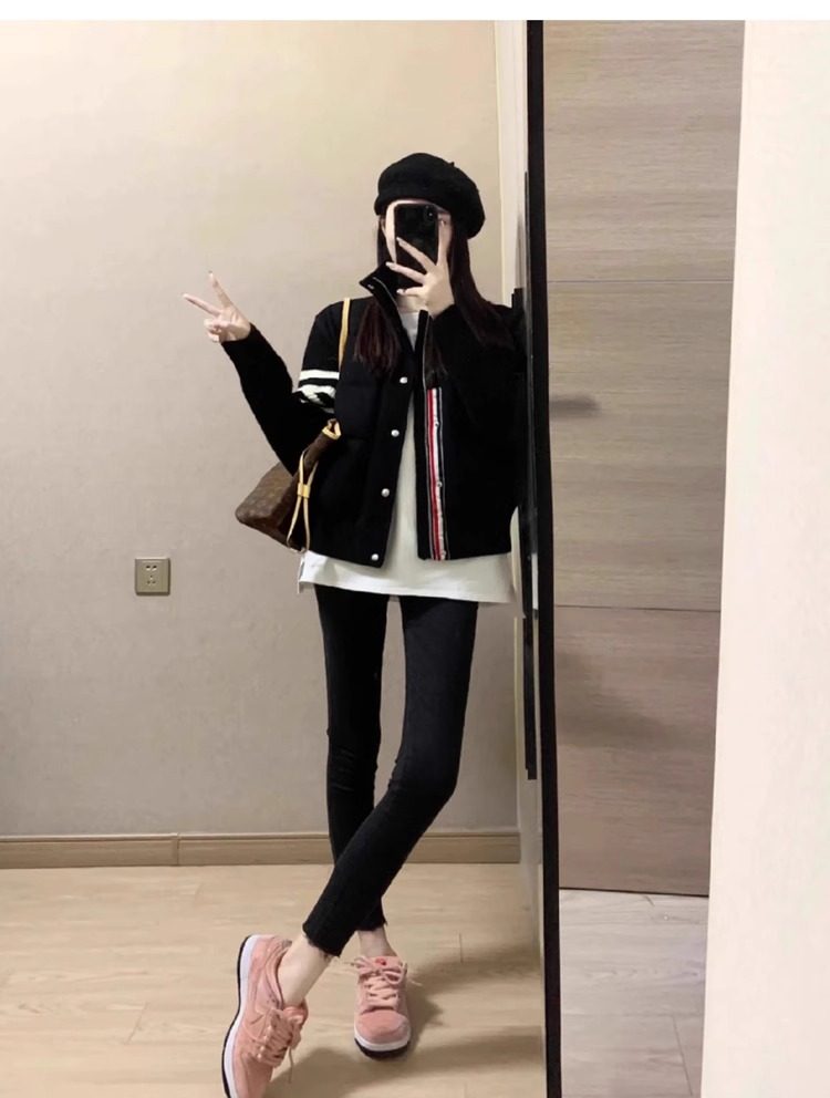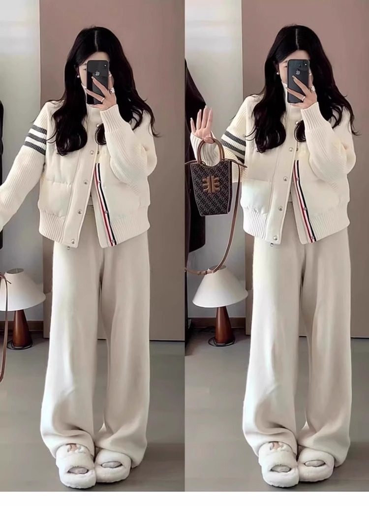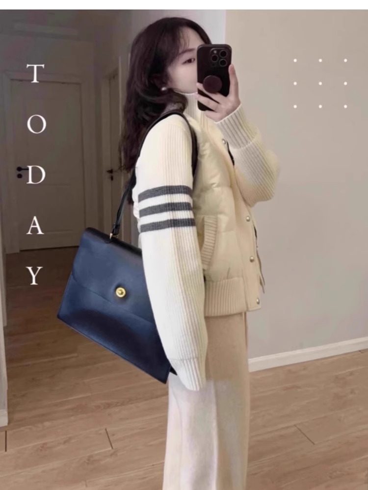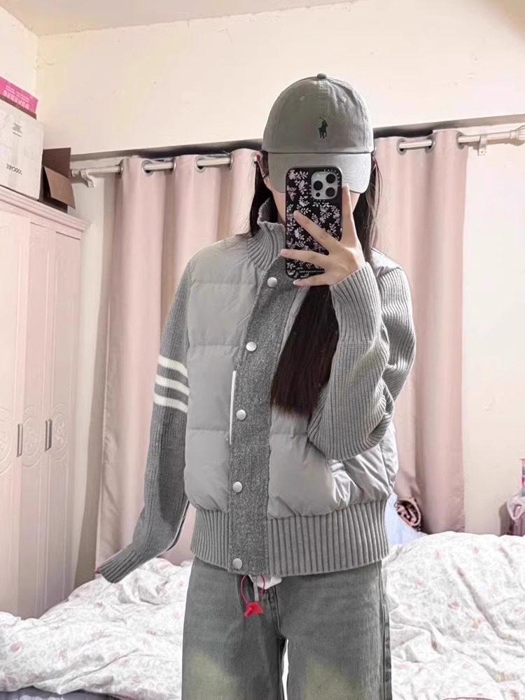 French Rouje Moaks Lightweight down Jacket for Women, Short Style, Patchwork Knit Sweater, Stand Collar Coat, Trendy Puffer Jacket