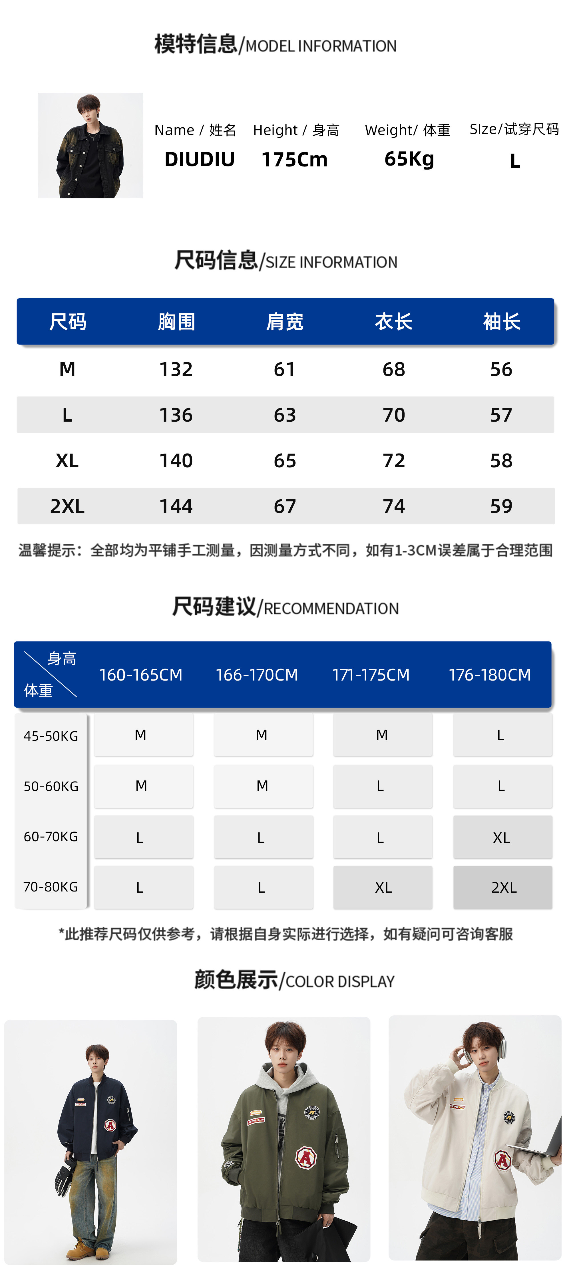 China (cm) 165 / 88-90 170 / 96-98 175 / 108-110 180 / 118-122 185 / 126-130