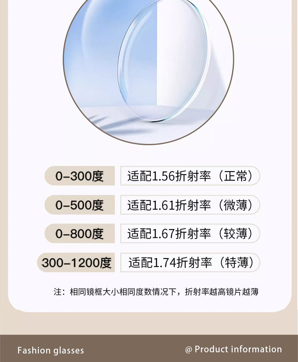 Lens Refractive Index Eyeglass Frames + Non-Prescription Clear Lenses,Eyeglass Frames + [1.56 Ultra-Thin] Blue Light Blocking & Anti-Radiation Lenses (Please Specify Prescription),Eyeglass Frames + [1.61 Thinner] Blue Light Blocking & Anti-Radiation Lenses (Please Specify Prescription),Eyeglass Frames + [1.67 Ultra-Thin] Blue Light Blocking & Anti-Radiation Lenses (Please Specify Prescription),Eyeglass Frames + [1.74 Ultra-Thin] Blue Light Blocking & Anti-Radiation Lenses (Please Specify Prescription),Eyeglass Frames + [1.56 Thin] Anti-Radiation Lenses (Please Specify Prescription),Eyeglass Frames + [1.61 Thinner] Anti-Blue Light Lenses (Please Specify Prescription),Eyeglass Frames + [1.67 Ultra-Thin] Anti-Radiation Lenses (Please Specify Prescription),Eyeglass Frames + [1.74 Ultra-Thin] Anti-Radiation Lenses (Please Specify Prescription),Eyeglass Frames + [Essilor Varifocal] 1.56 Blue Light Blocking Lenses (Please Specify Your Prescription),Eyeglass Frames + [Essilor Vanessa Brand] 1.61 Multi-Screen Anti-Blue Light Lenses (Please Specify Prescription),Eyeglass Frames + [Essilor Varifocal] 1.67 Blue Light Blocking Lenses (Please Specify Prescription),Eyeglass Frames + [Essilor Varifocal] 1.74 Blue Light Blocking Lenses (Please Specify Your Prescription),Eyeglass Frames + [Essilor Vanessa Brand] 1.56 Everyday Anti-Radiation Lenses (Please Specify Prescription),Eyeglass Frames + [Essilor Vanessa Brand] 1.61 Everyday Anti-Radiation Lenses (Please Specify Prescription),Eyeglass Frames + [Essilor Vanessa Brand] 1.67 Daily Anti-Radiation Lenses (Please Specify Prescription),Eyeglass Frames + [Essilor Vanessa Brand] 1.74 Daily Anti-Radiation Lenses (Please Specify Prescription),Eyeglass Frames + [Photochromic] 1.56 Smart Photochromic Blue Light Blocking Lenses,Eyeglass Frames + [Photochromic] 1.61 Smart Photochromic Blue Light Blocking Lenses,Eyeglass Frames + [Photochromic] 1.67 Smart Photochromic Blue Light Blocking Lenses,Eyeglass Frames + [Photochromic] 1.56 Smart Photochromic Lenses,Eyeglass Frames + [Photochromic] 1.61 Smart Photochromic Lenses,Eyeglass Frames + [Photochromic] 1.67 Smart Photochromic Lenses