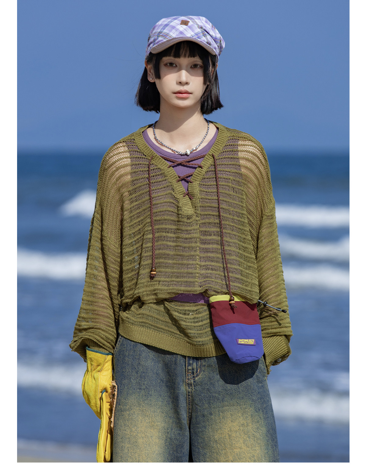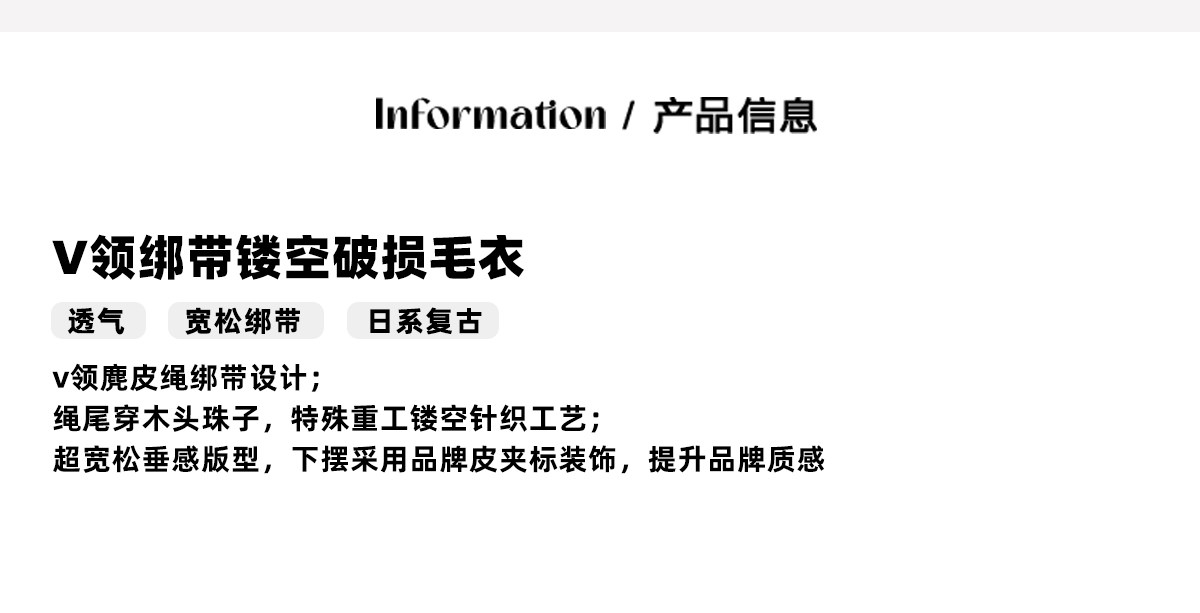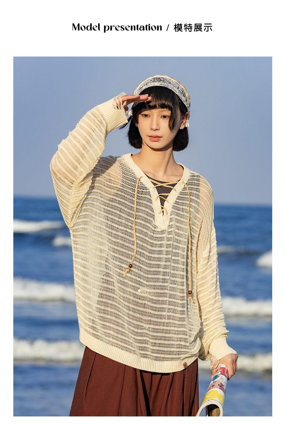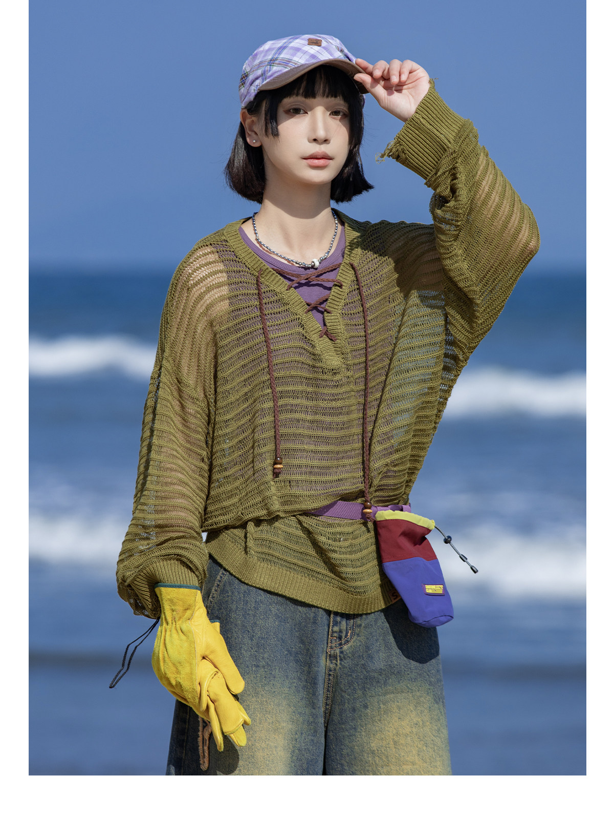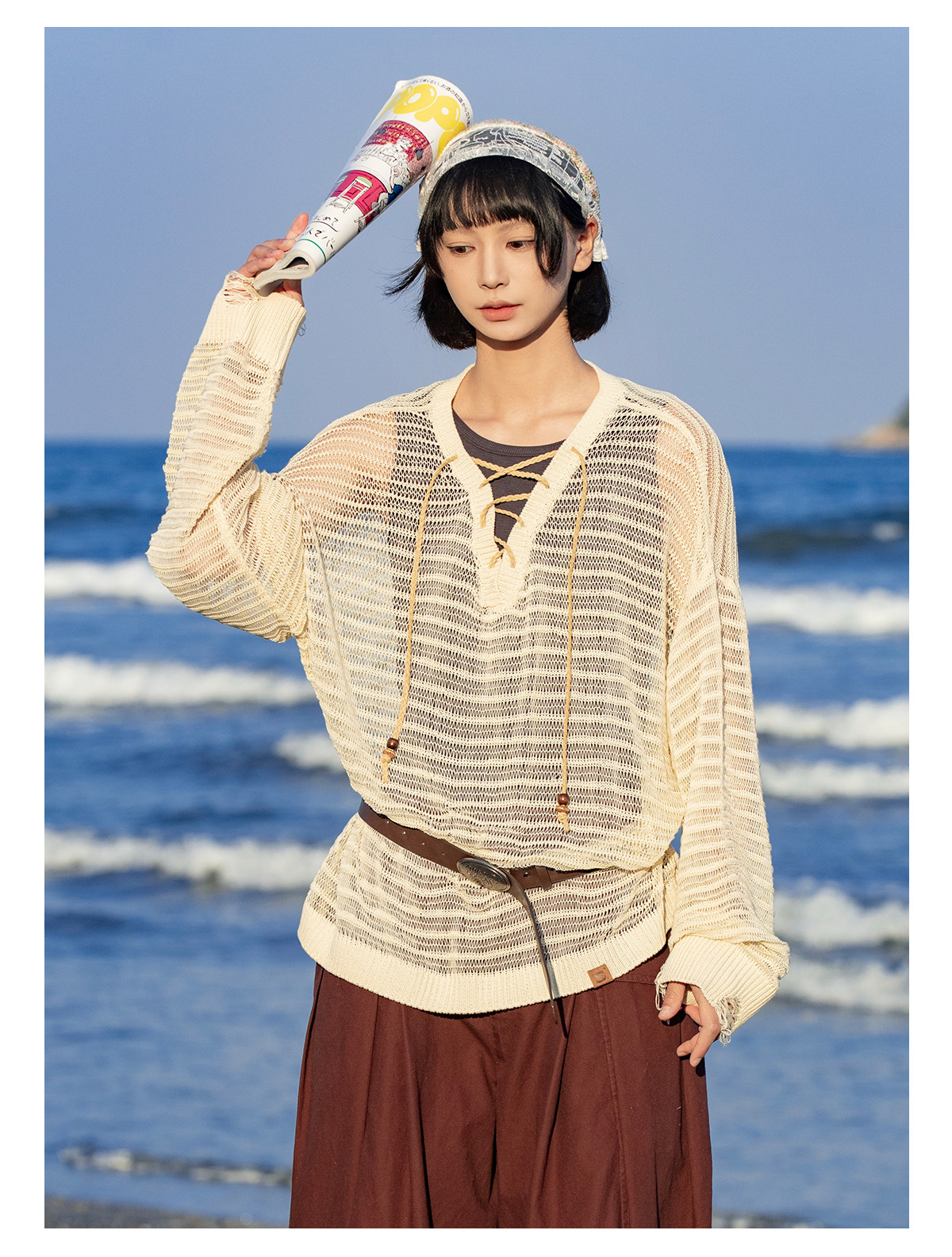 「夏季轻薄罩衫」早乙女惠子saotome日系户外V领绑带镂空破损毛衣