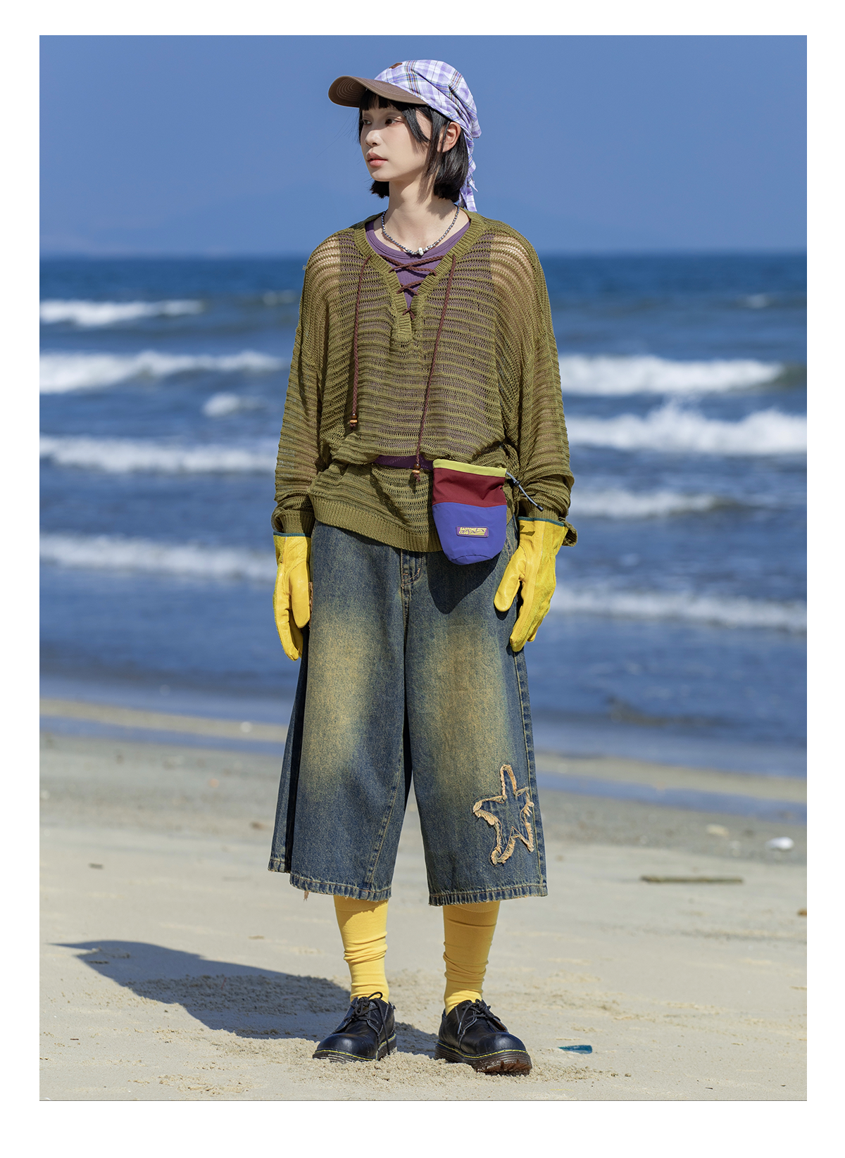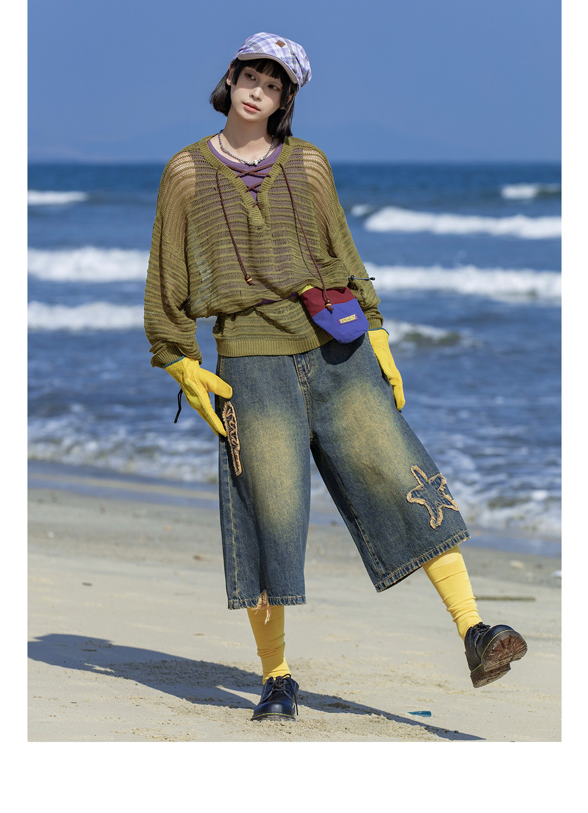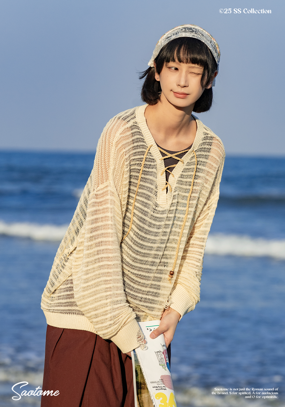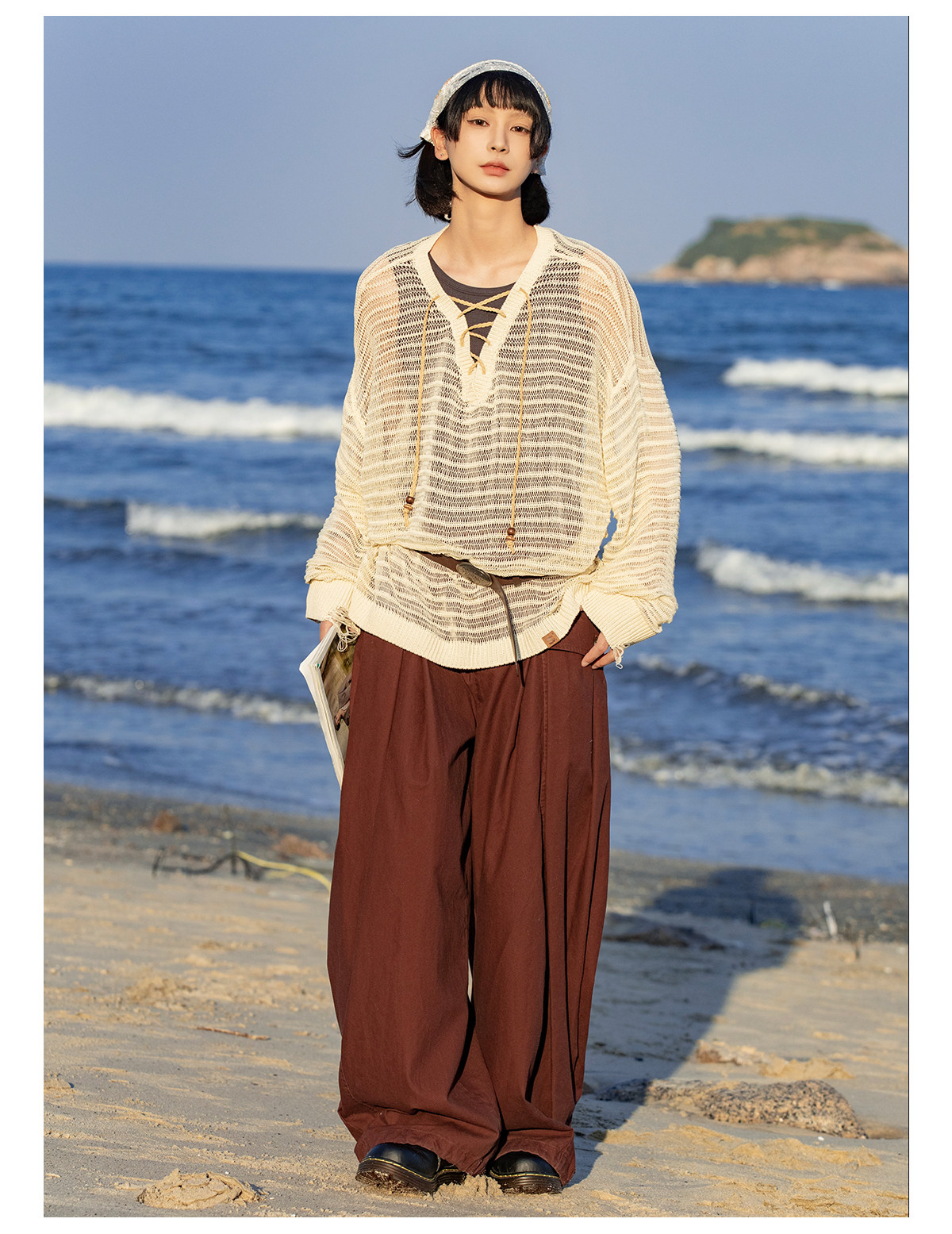 「夏季轻薄罩衫」早乙女惠子saotome日系户外V领绑带镂空破损毛衣