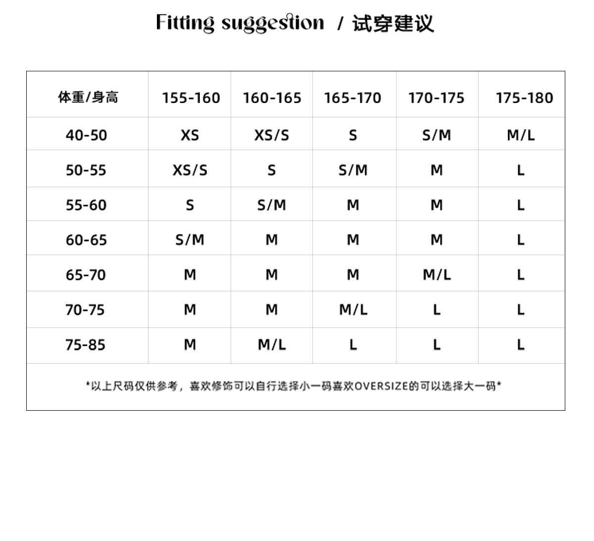 China (cm) 160-165/84-86 165-170 / 88-90 167-172 / 92-96 168-173 / 98-102 170-176 / 106-110