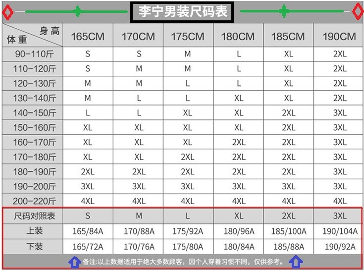 China (cm) 165 / 88-90 170 / 96-98 175 / 108-110 180 / 118-122 185 / 126-130