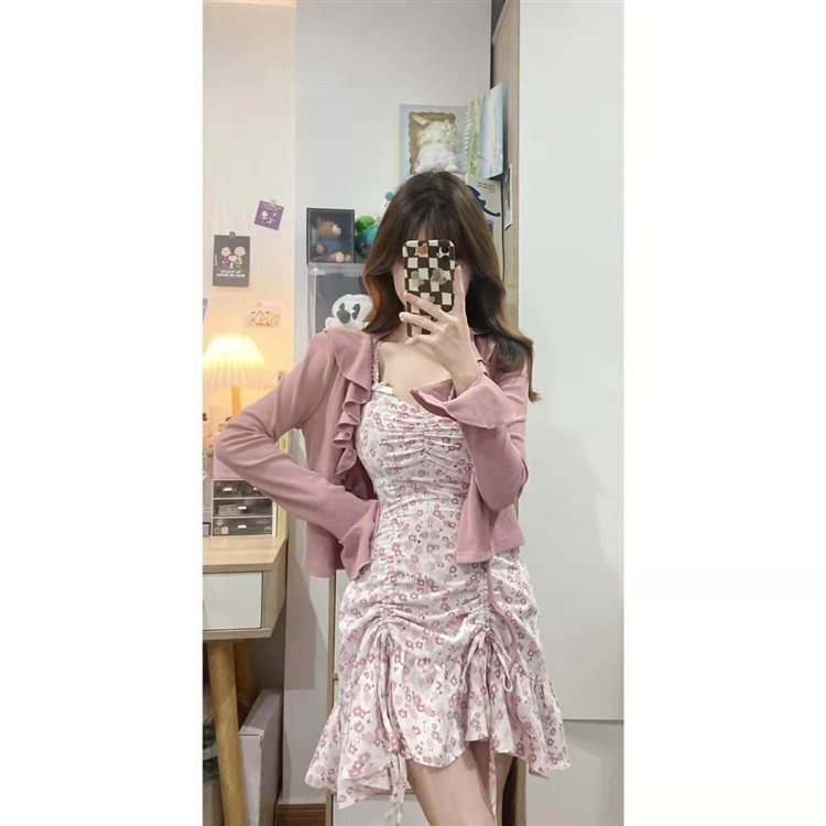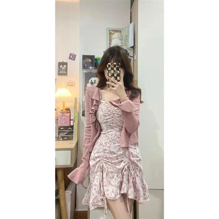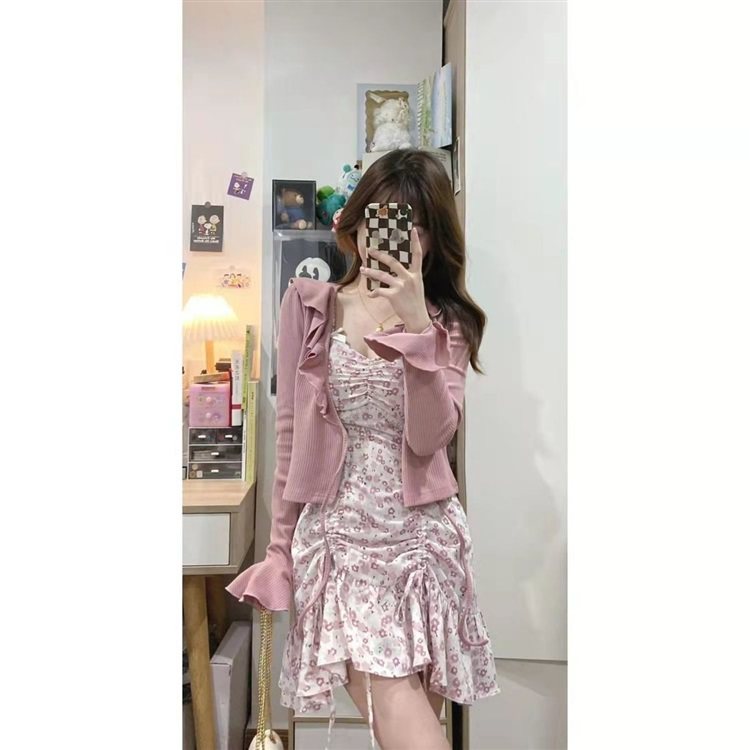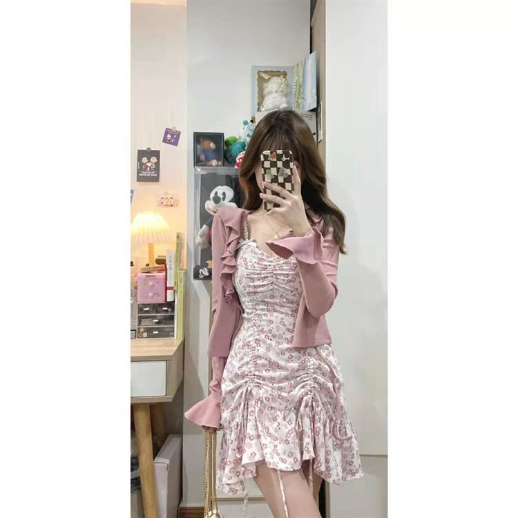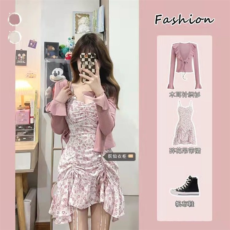 纯欲甜辣风木耳针织开衫套装女秋季新款辣妹设计感时尚碎花吊带裙