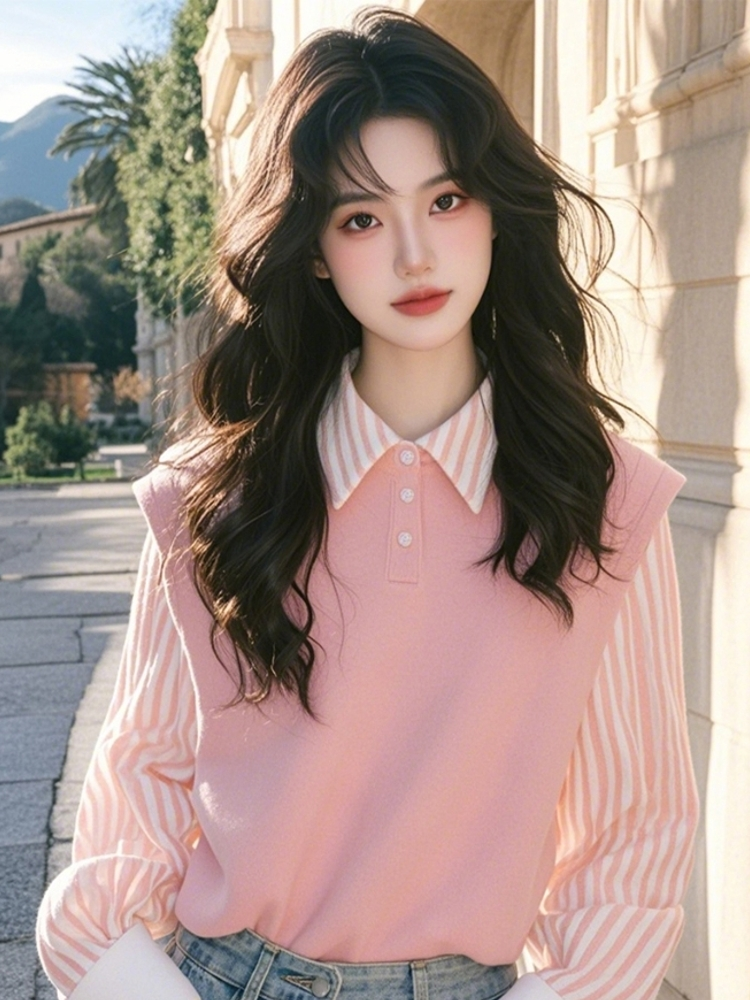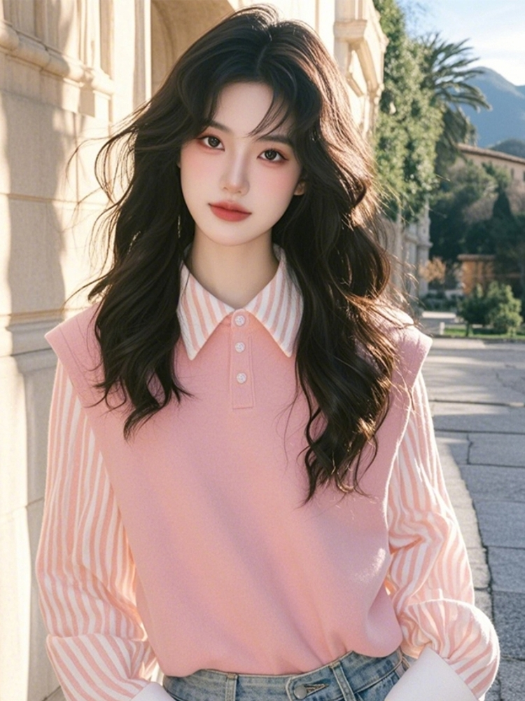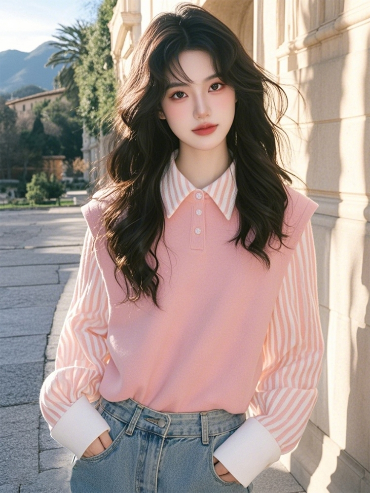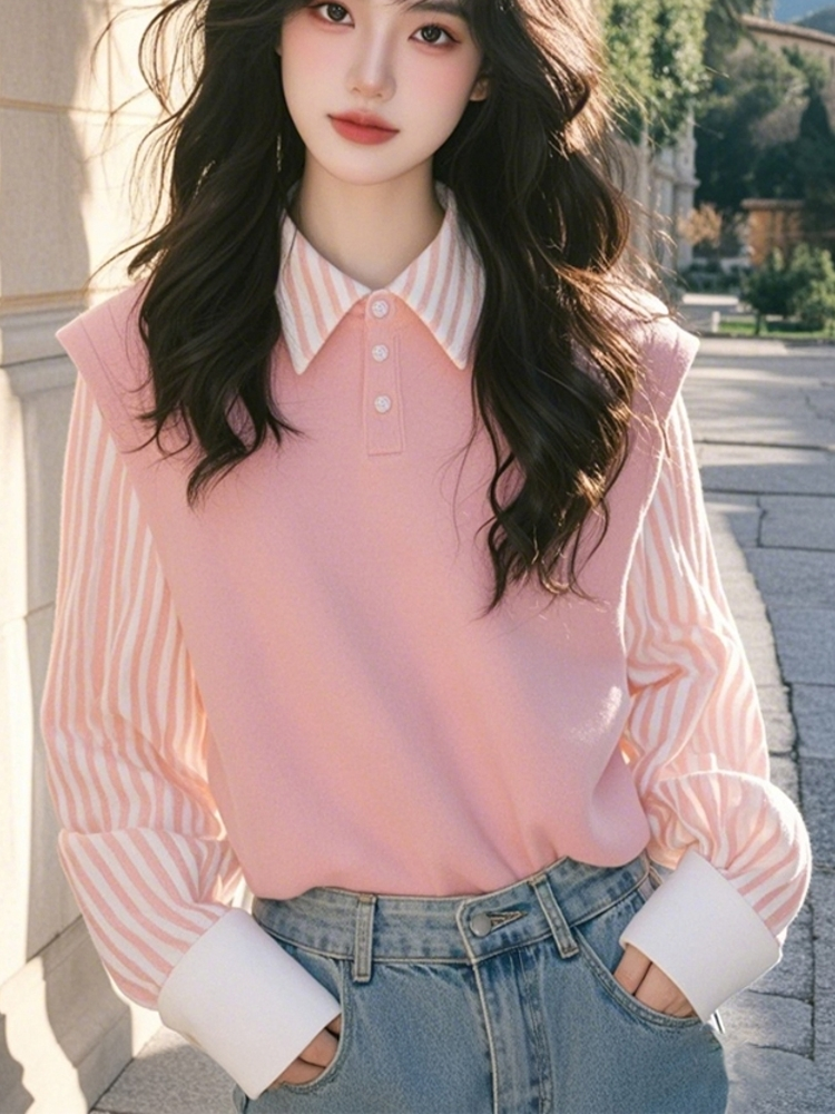 Authentic Gejia New 2025 Spring and Autumn Youthful and Fresh Pink Striped Patchwork Loose Fake Two-Piece Shirt Top