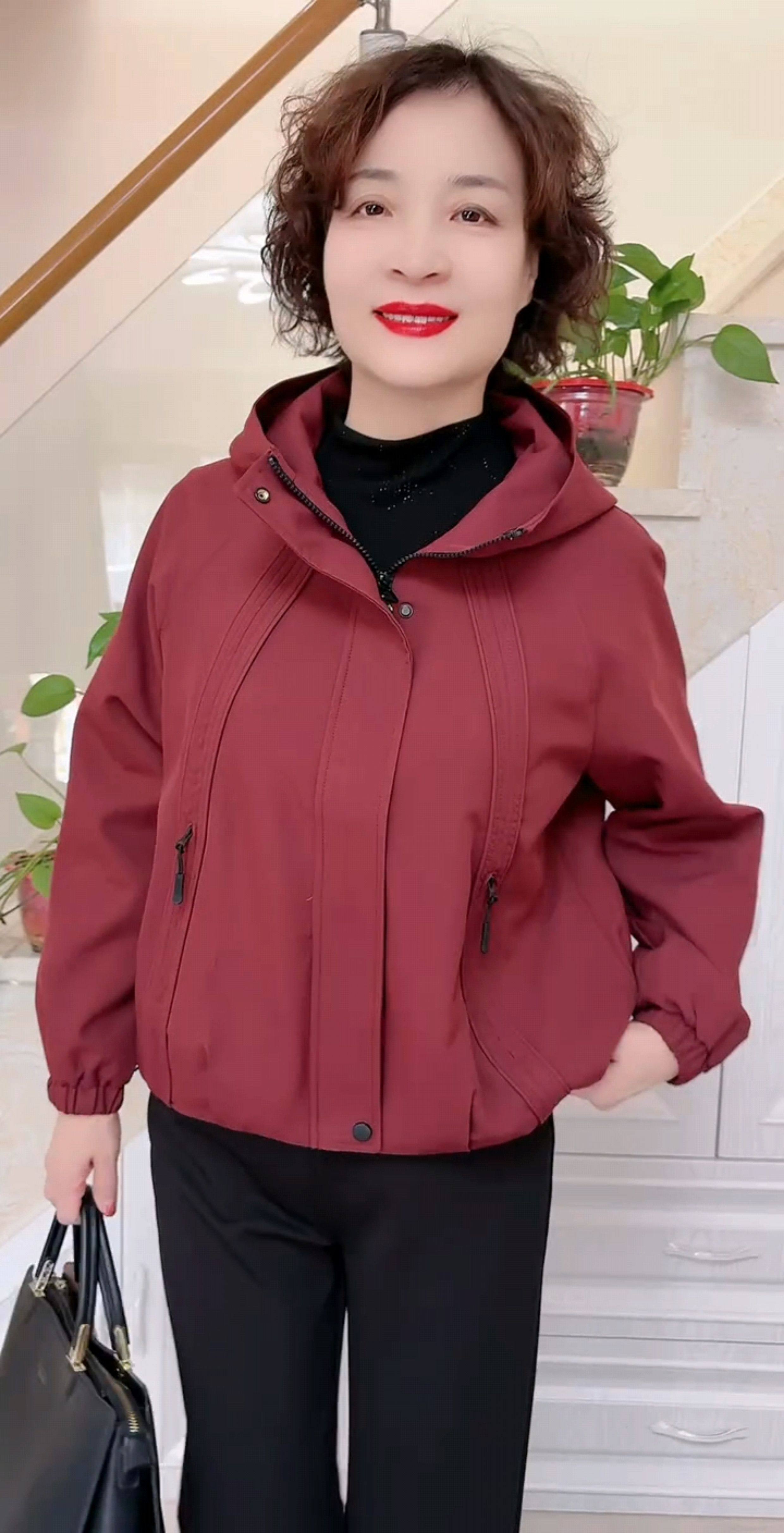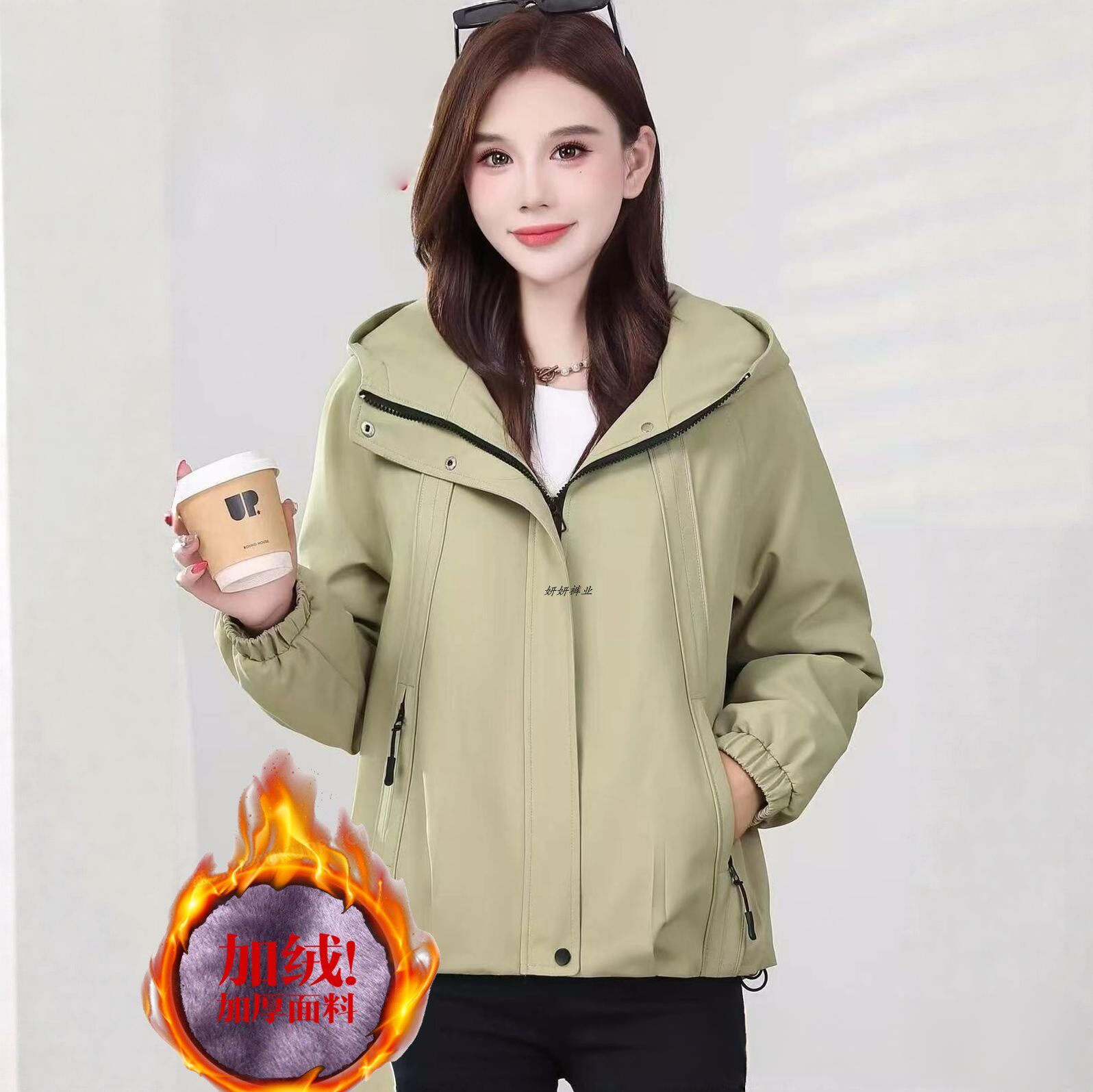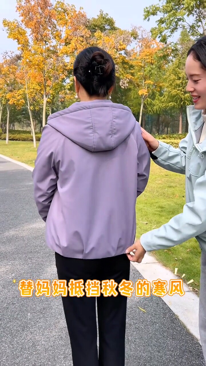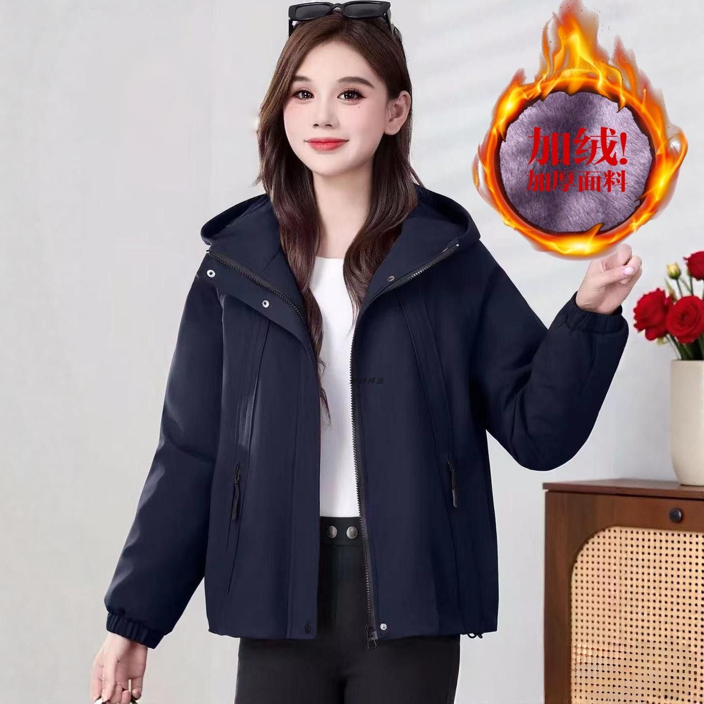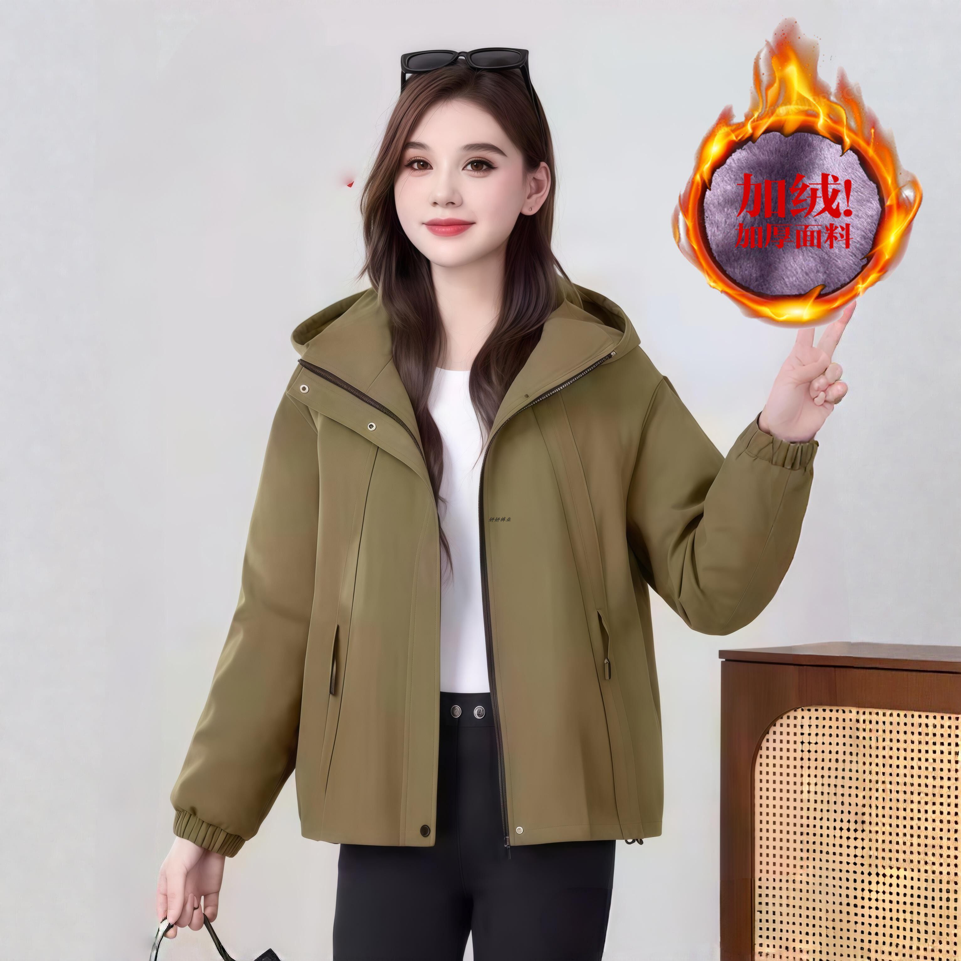 韩版连帽减龄休闲加绒夹克女专柜秋冬新款中年妈妈百搭风衣短外套