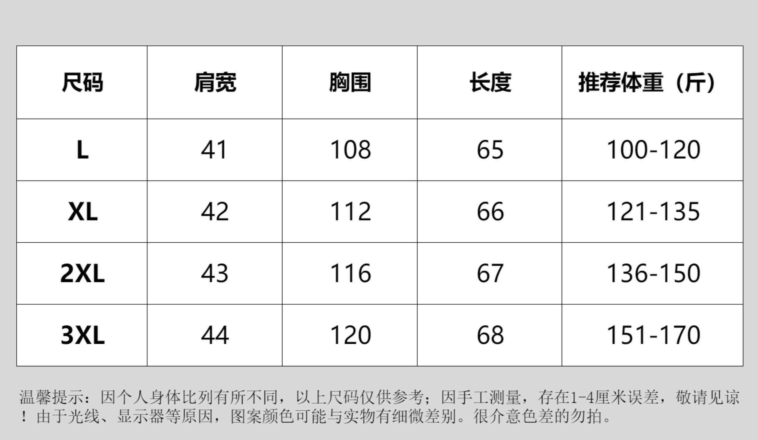 尺码 L推荐100-120斤,XL推荐121-135斤,2XL推荐136-150,3XL推荐150-170斤
