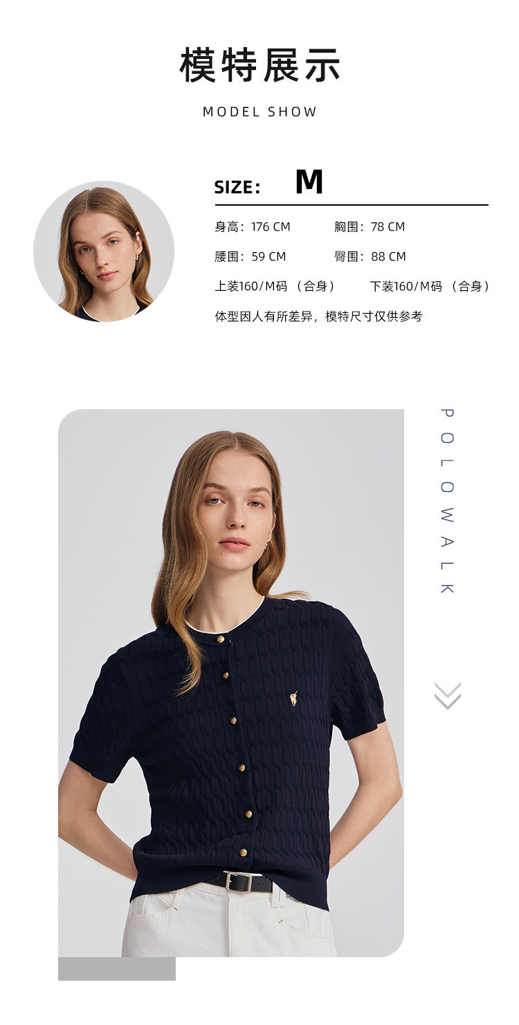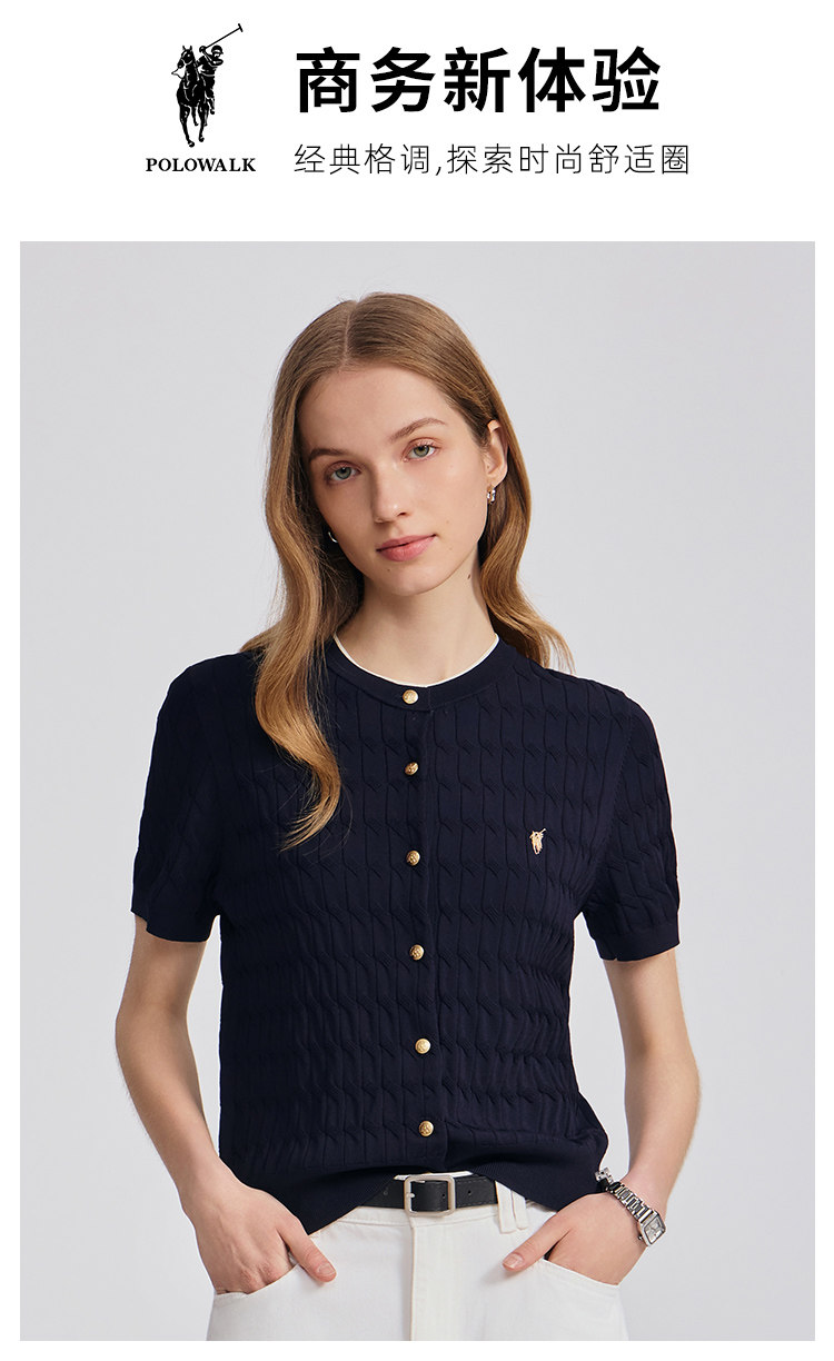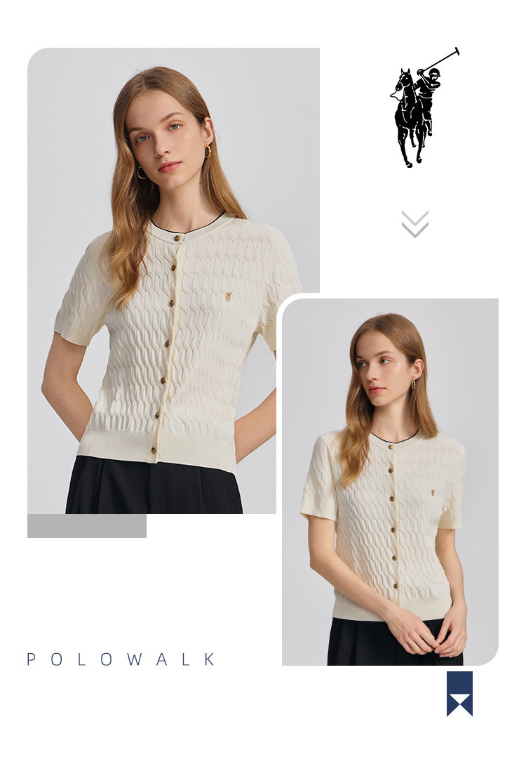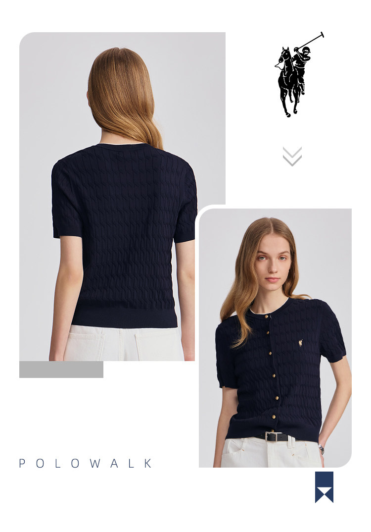 POLOWALK复古绞花短袖针织衫女春夏新款小标气质麻花圆领毛衣开衫