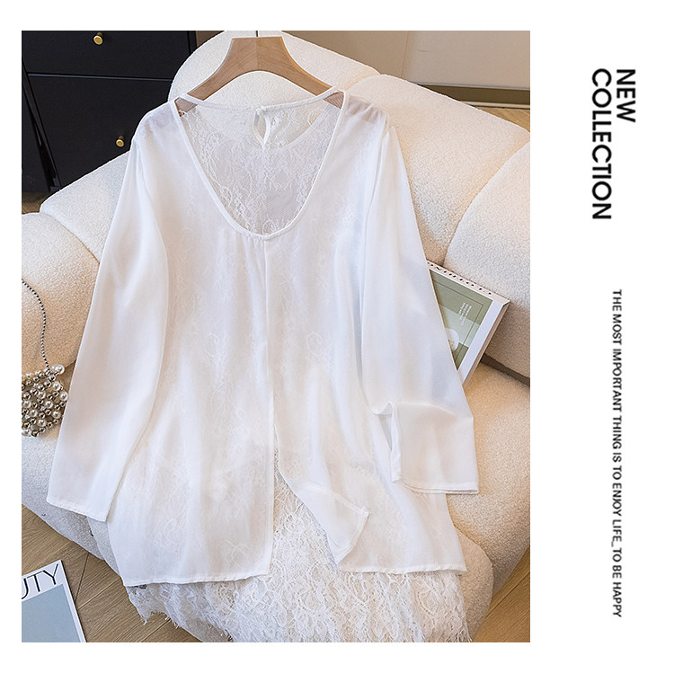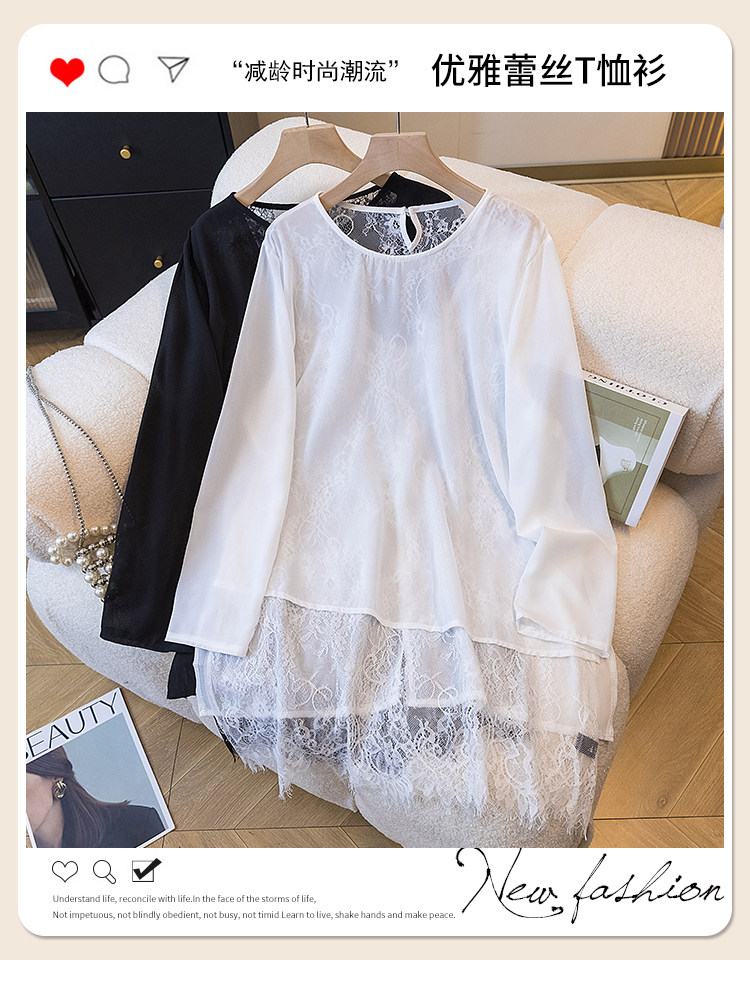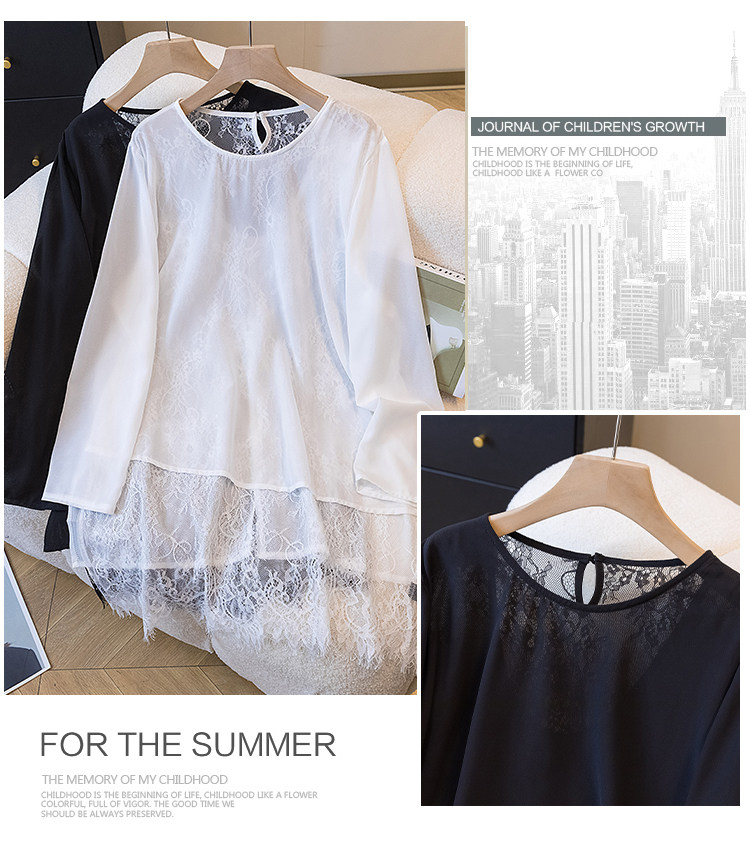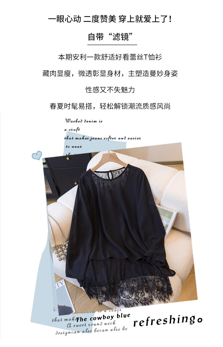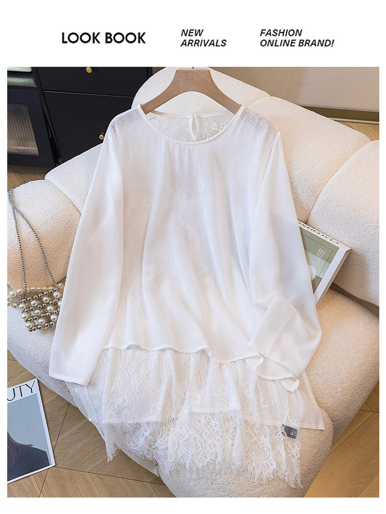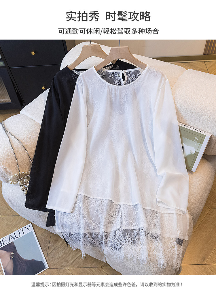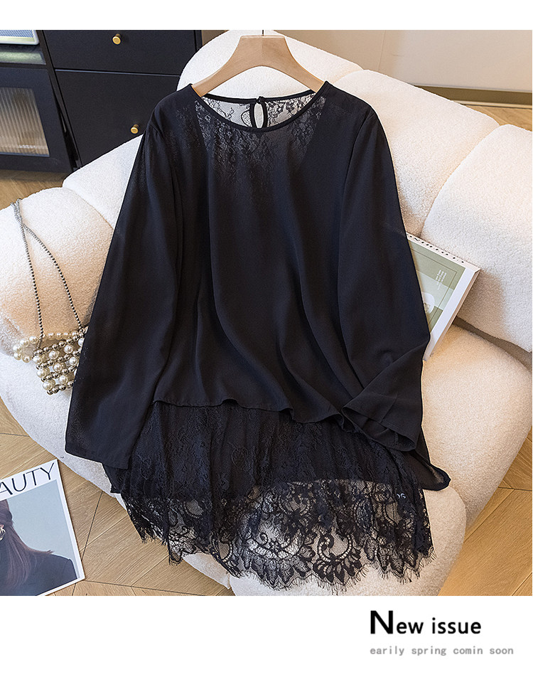 Женская блузка из черного шифона с кружевными вставками, длинным рукавом, весна-лето 2025, большие размеры, для полных женщин, верхняя одежда, имитация двухслойного топа