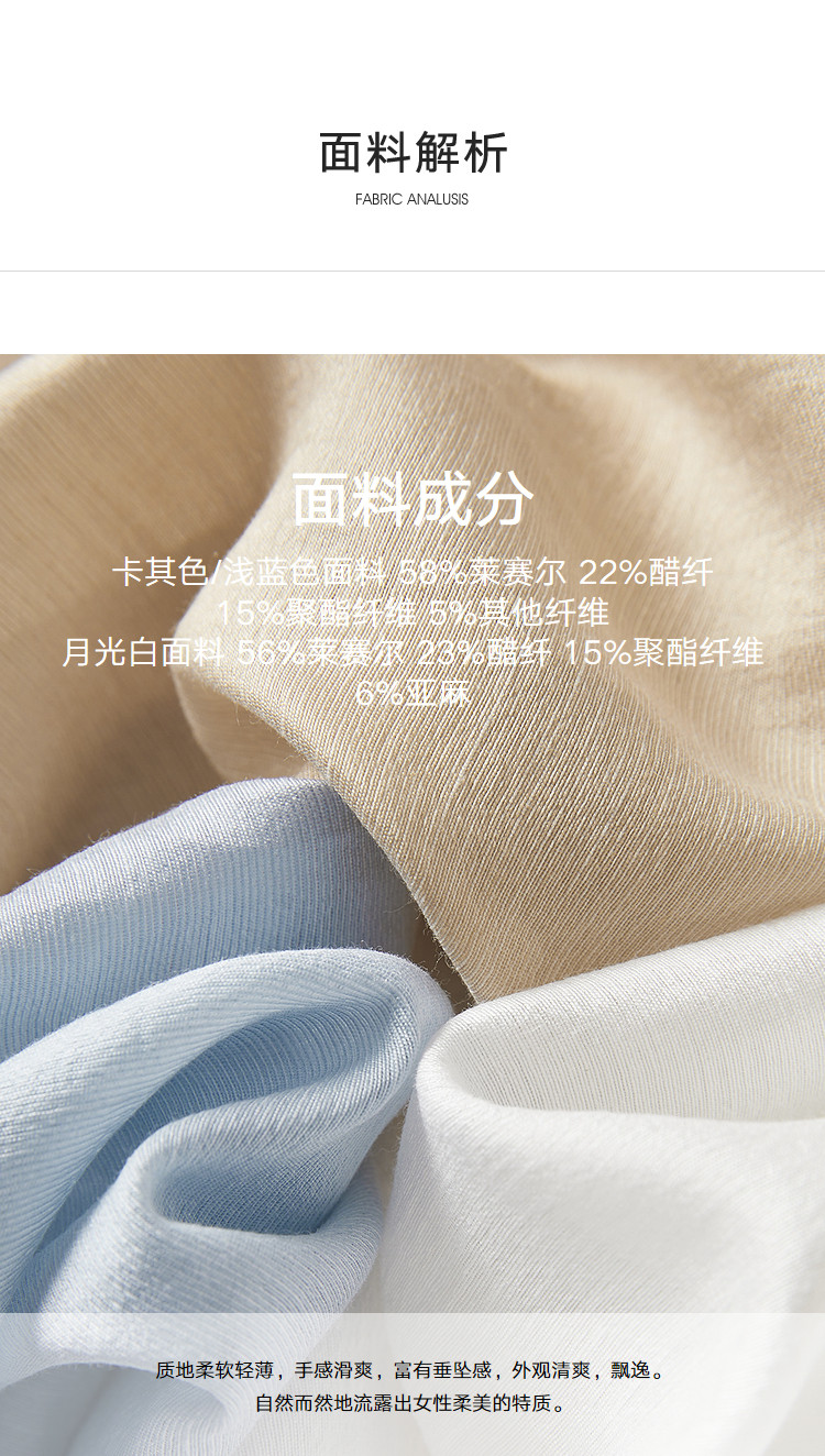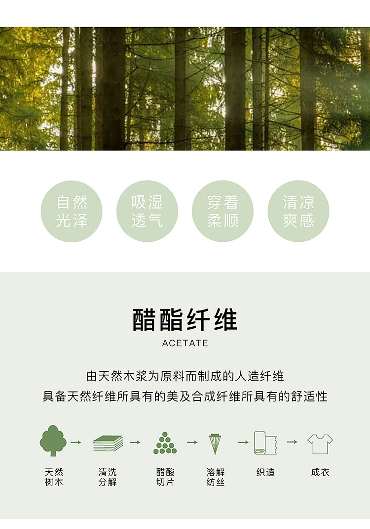 材质成分 莱赛尔纤维(莱赛尔)56% 醋酯纤维(醋纤)23% 聚酯纤维15% 亚麻6%