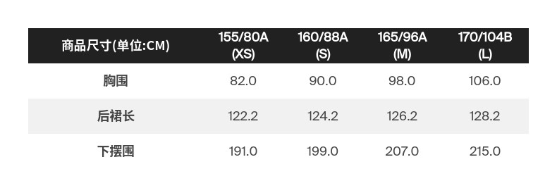 尺码 155/80A,160/88A,165/96A,170/104B