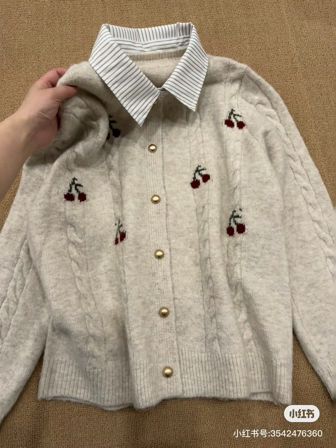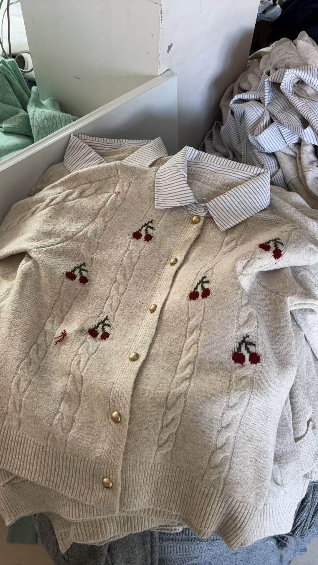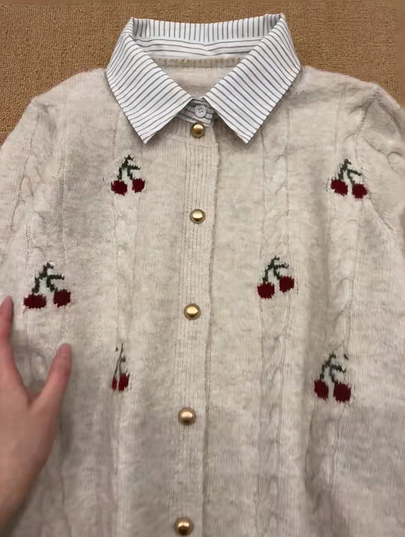 Versión coreana a rayas cuello POLO falso cuello de camisa de dos piezas pequeña boca dorada cárdigan de punto para mujer 2025 otoño nueva cereza top