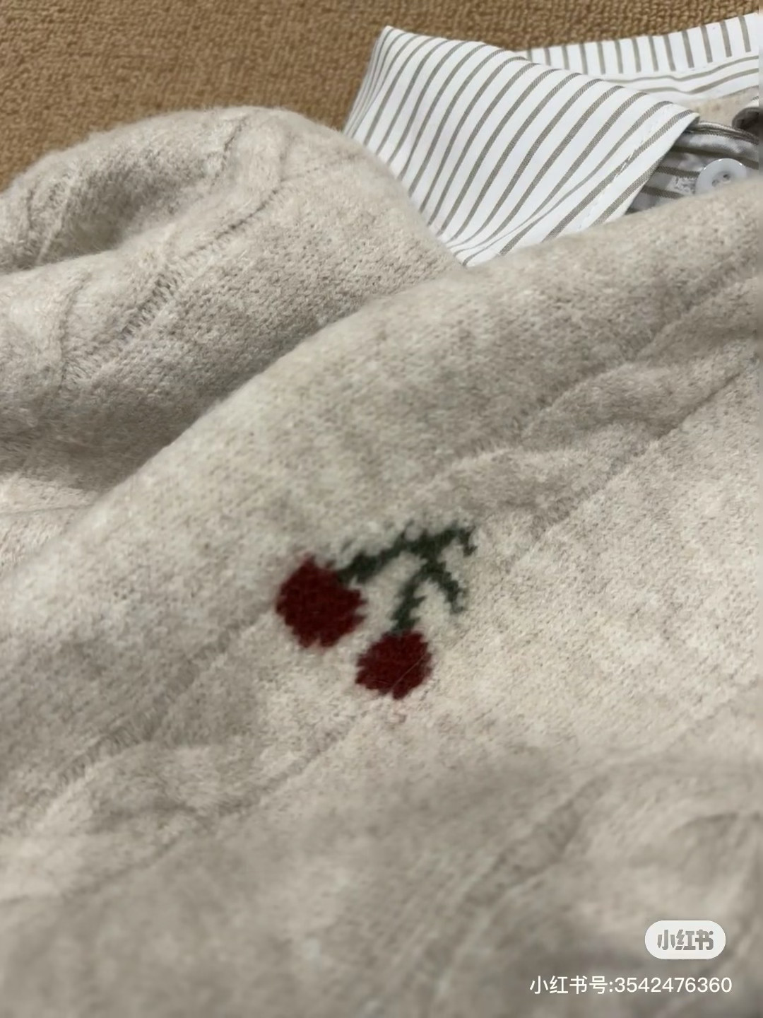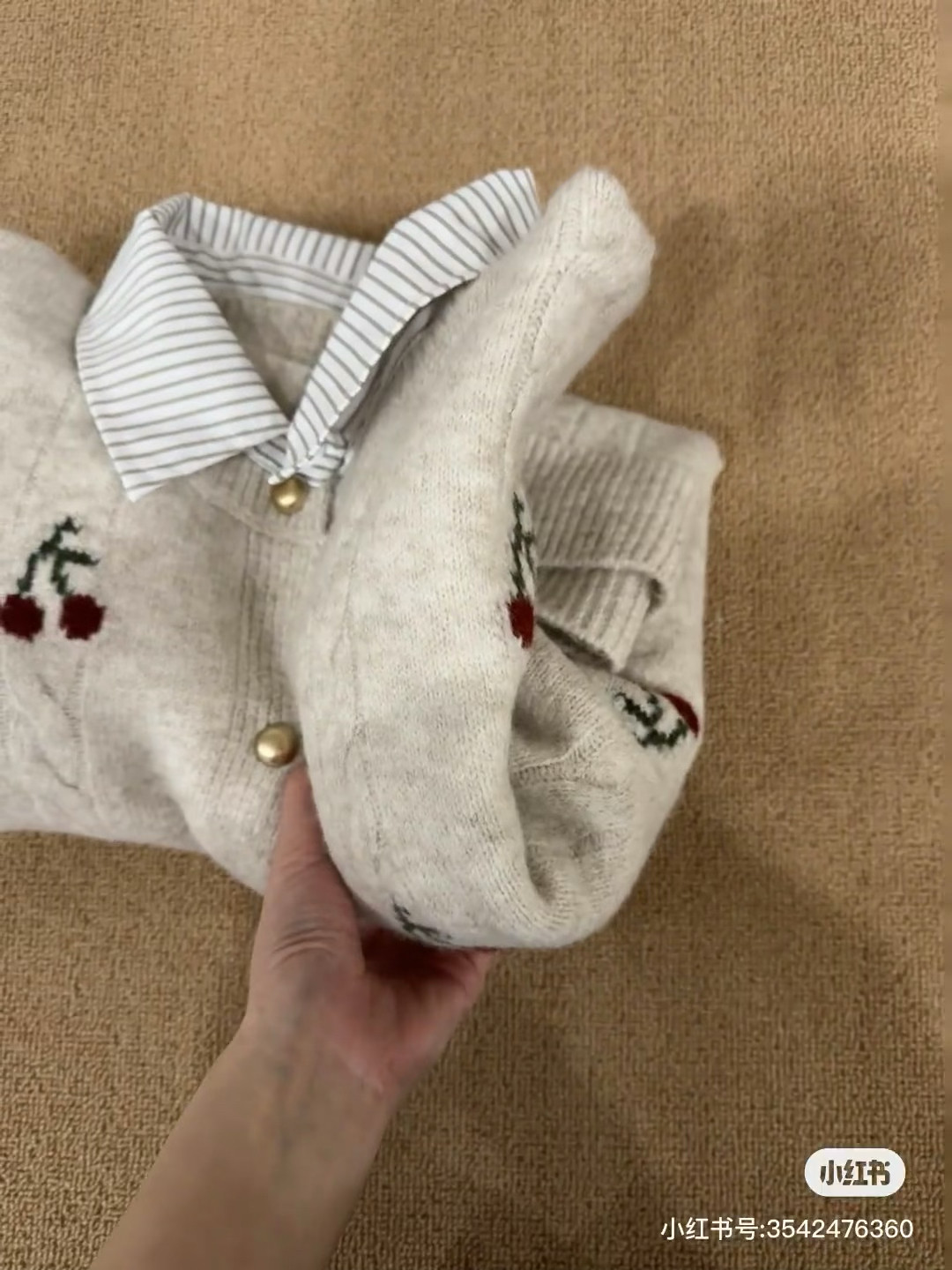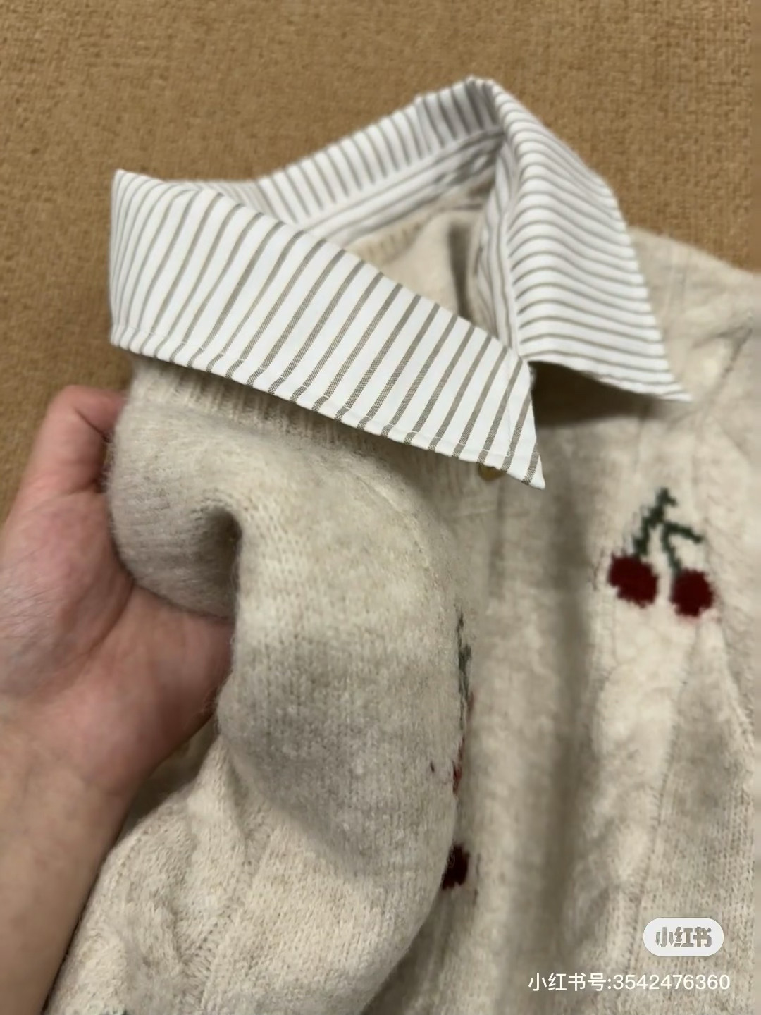 Versión coreana a rayas cuello POLO falso cuello de camisa de dos piezas pequeña boca dorada cárdigan de punto para mujer 2025 otoño nueva cereza top