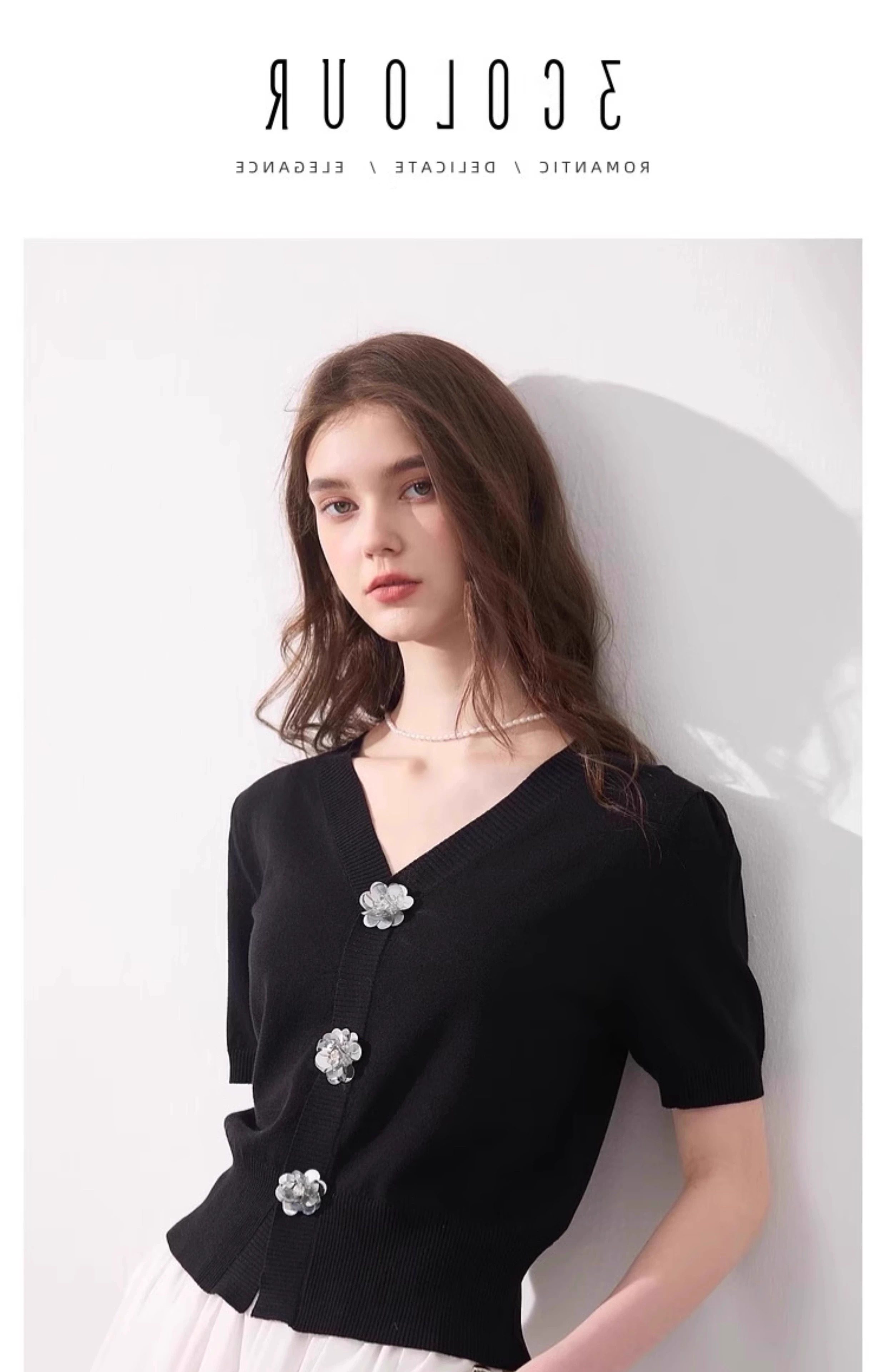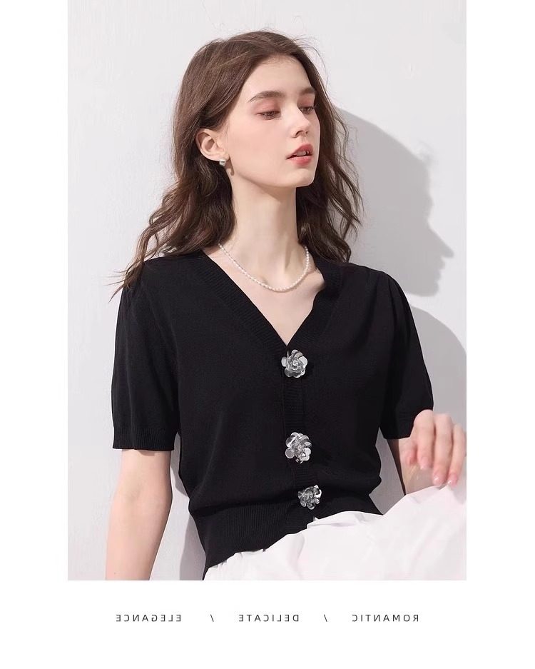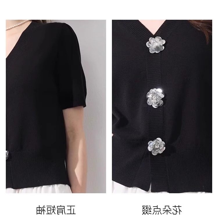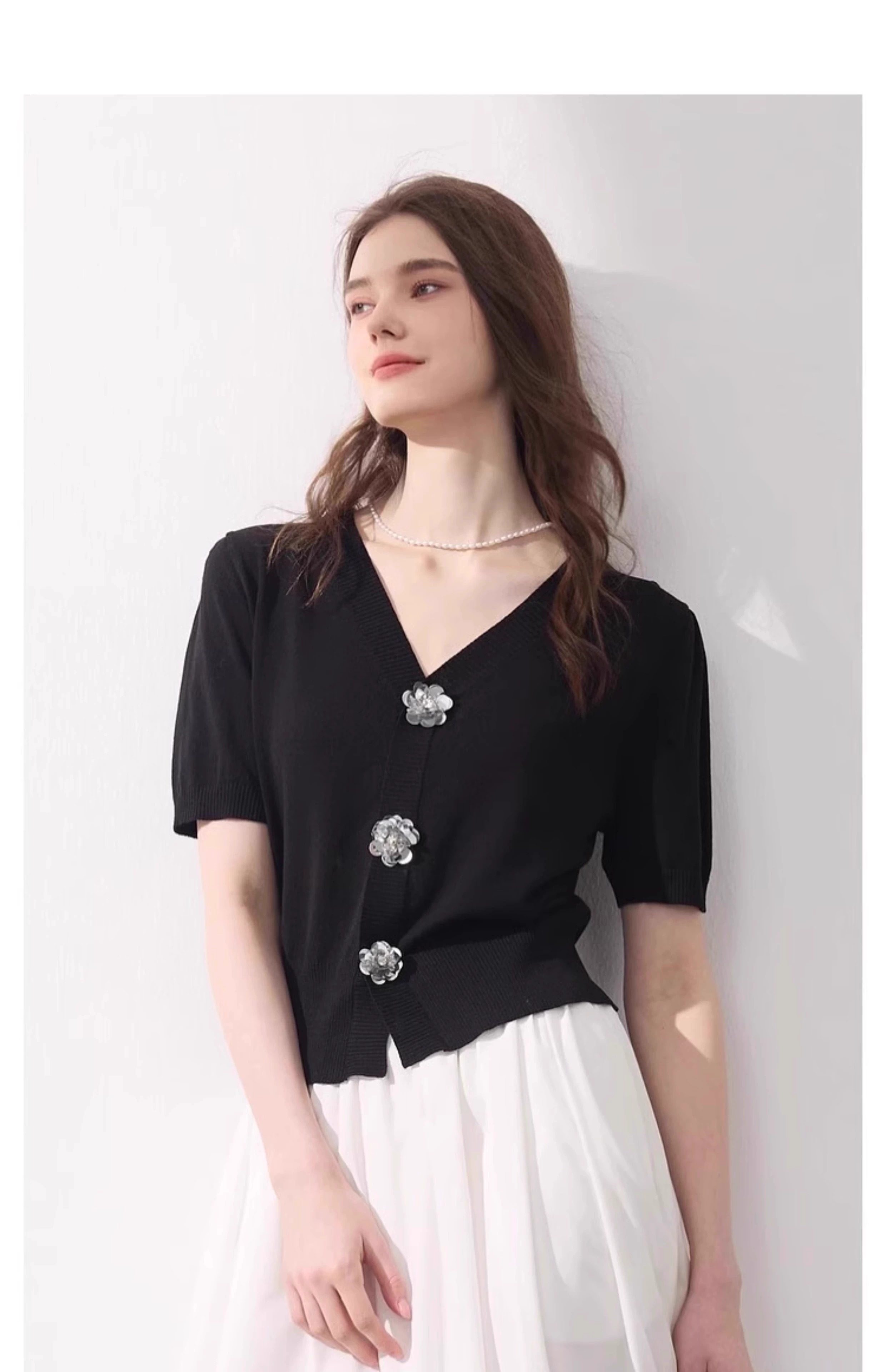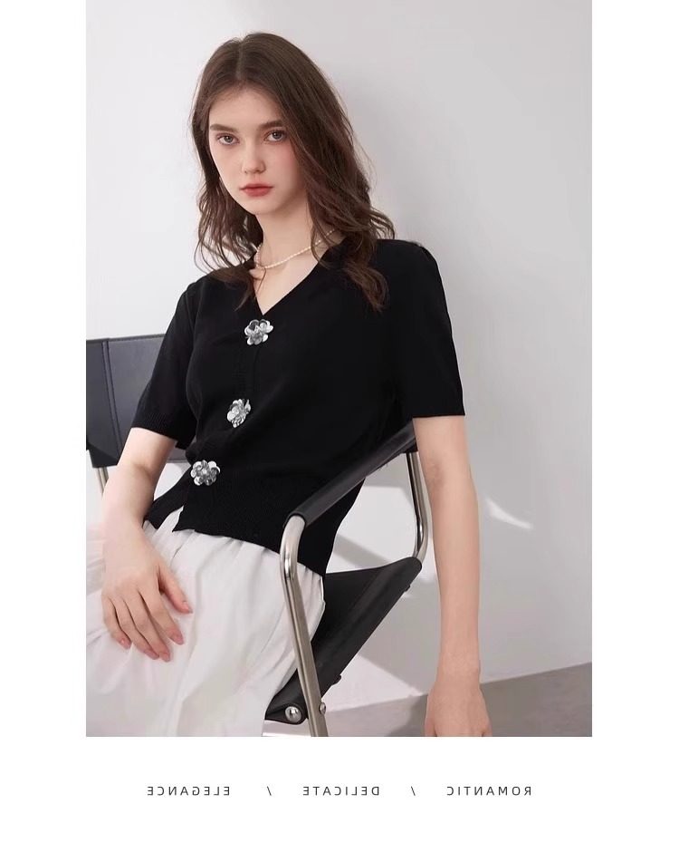 High-end 2025 summer french lady style three-dimensional flower knitted cardigan v-neck short-sleeved slim niche short top