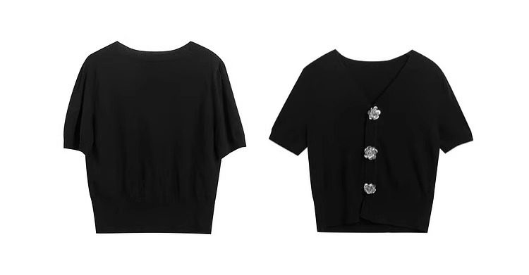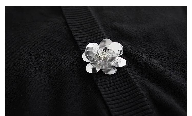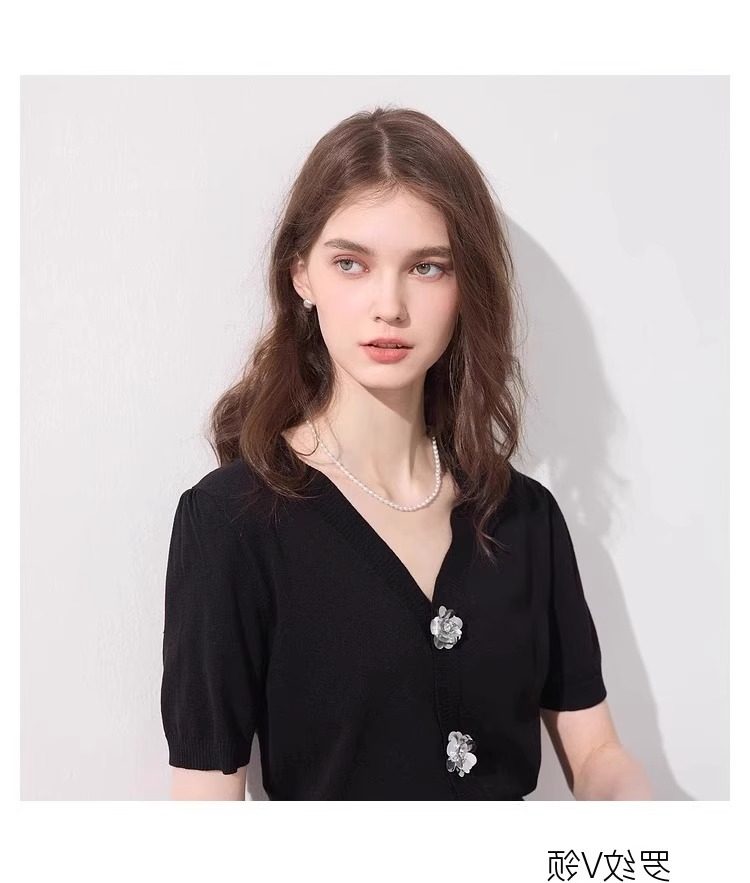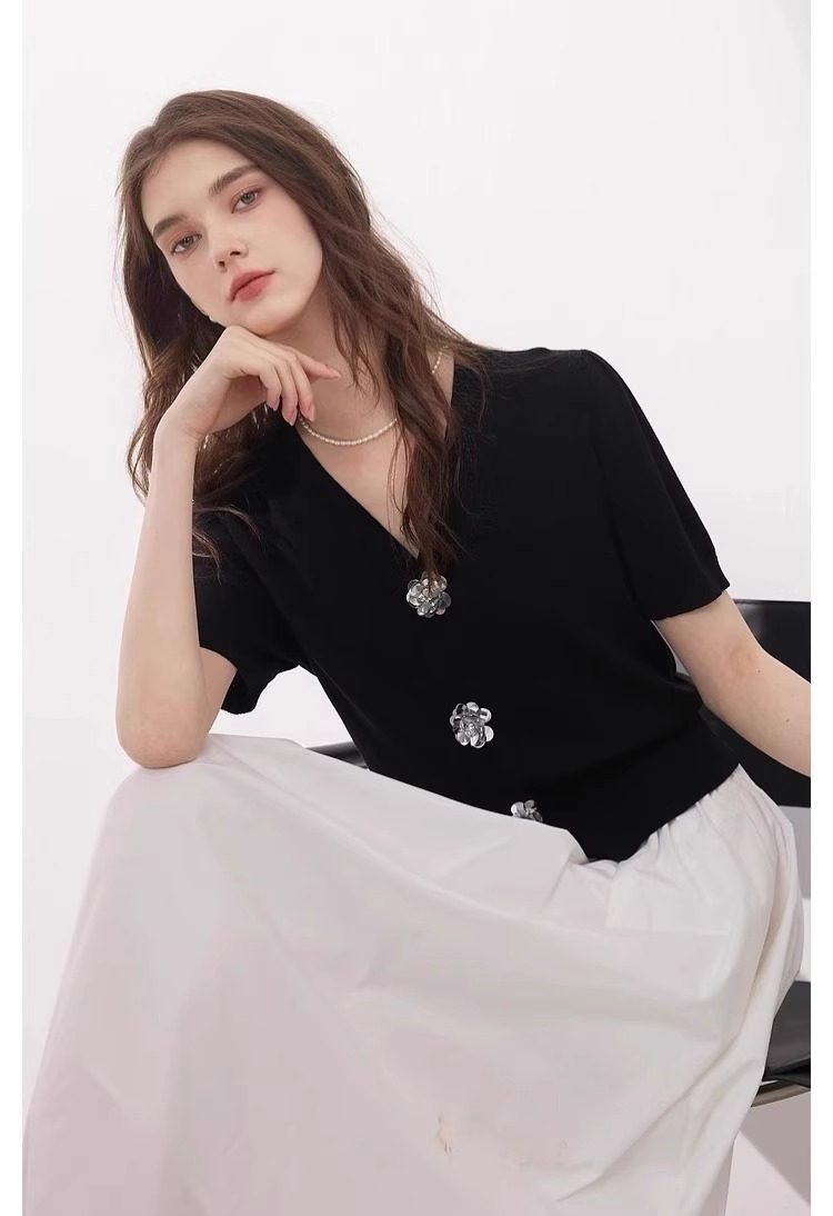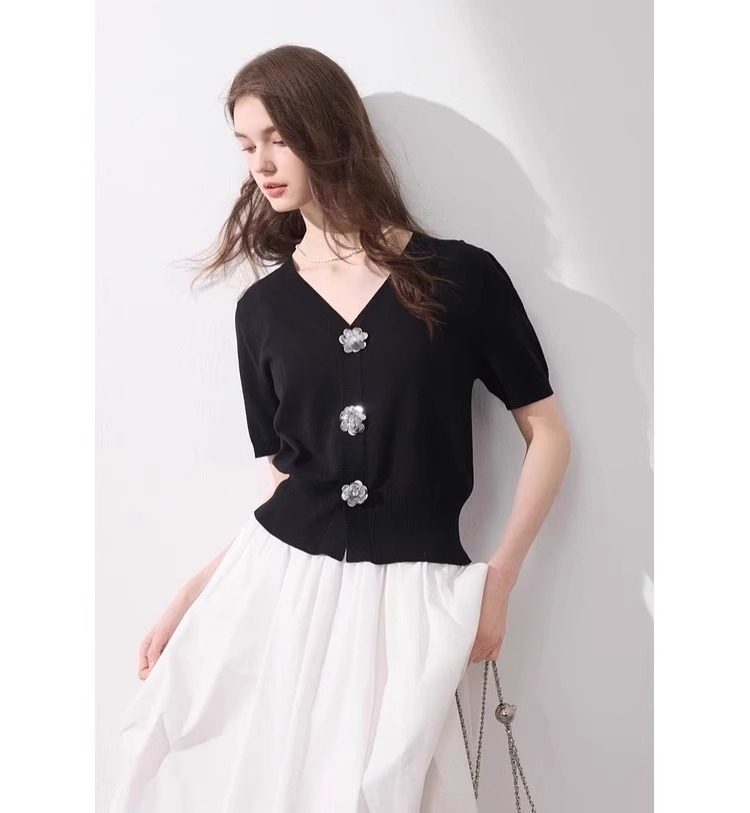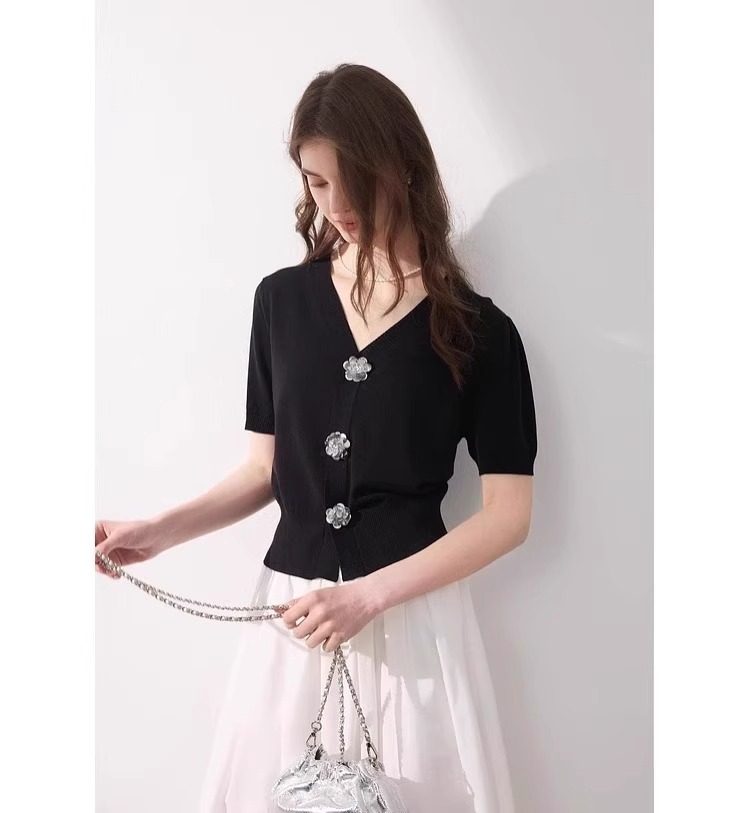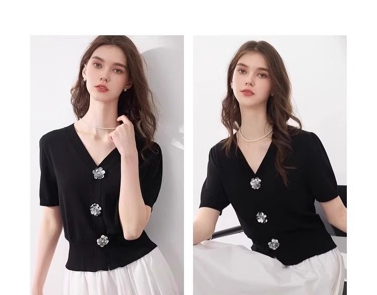 High-end 2025 summer french lady style three-dimensional flower knitted cardigan v-neck short-sleeved slim niche short top